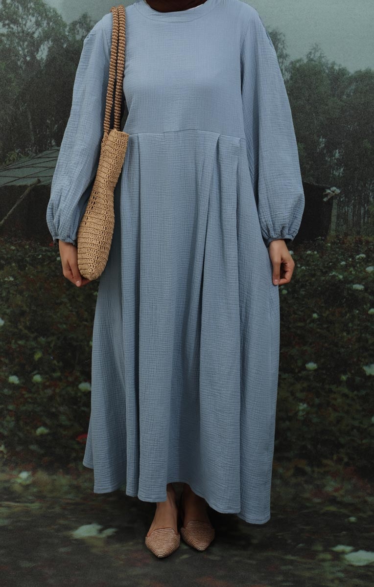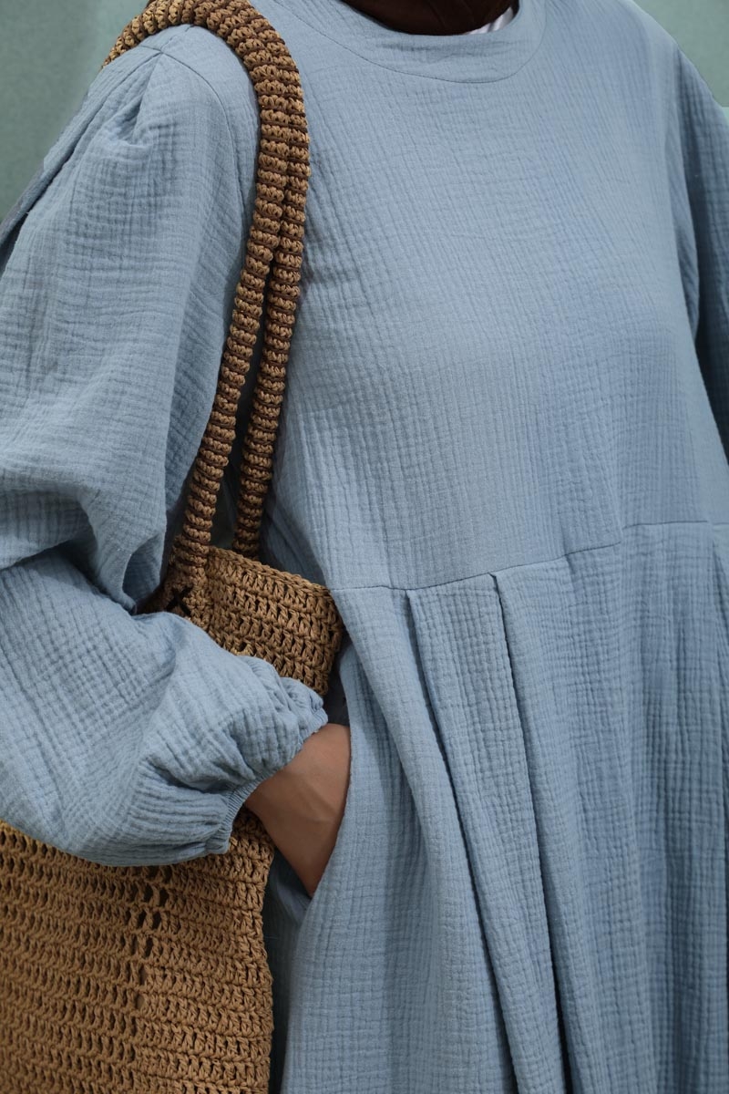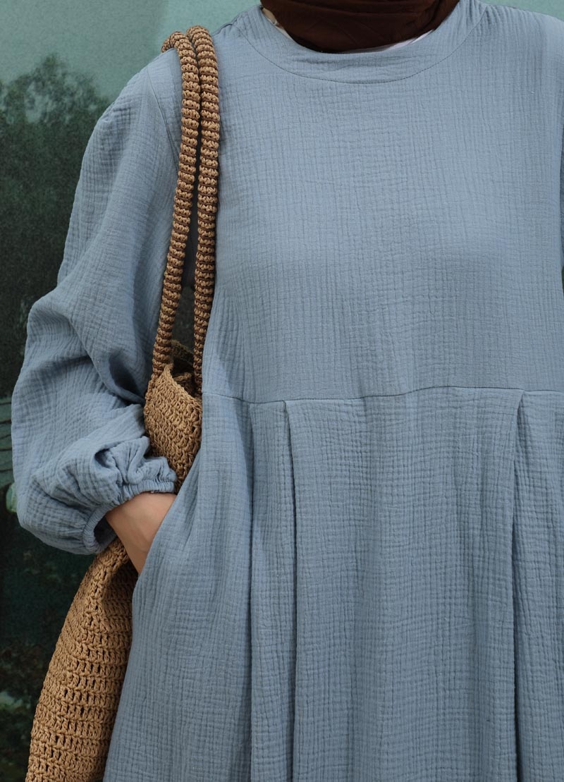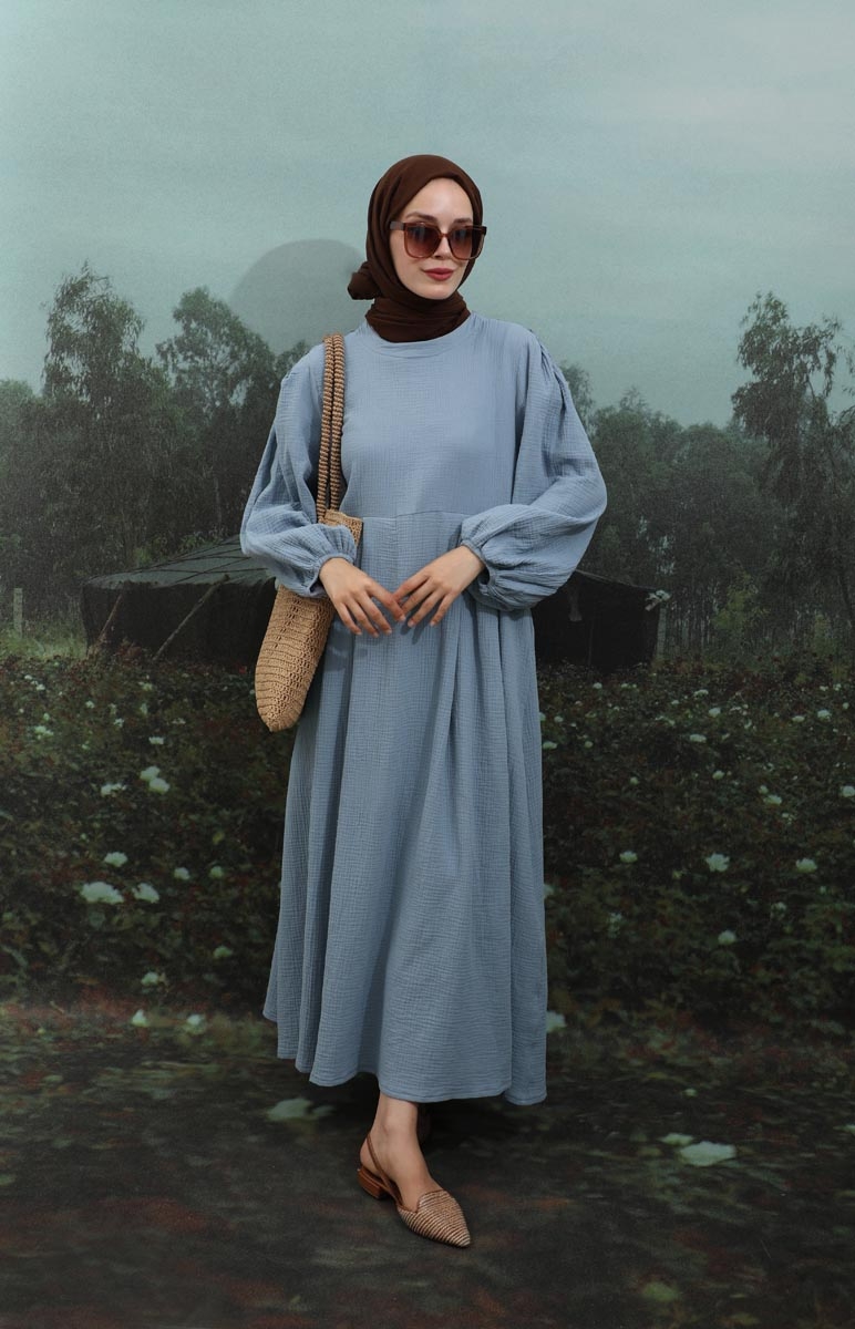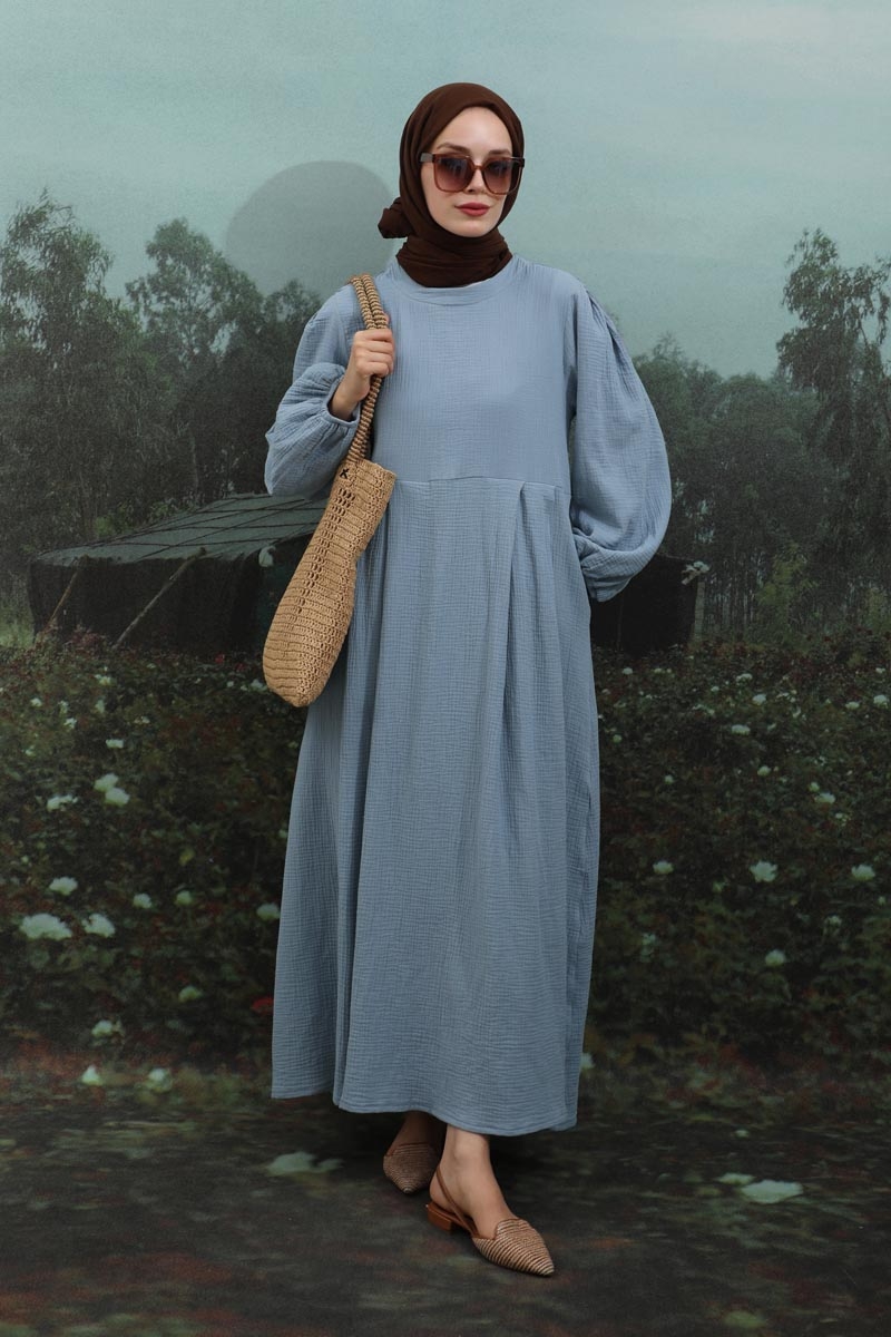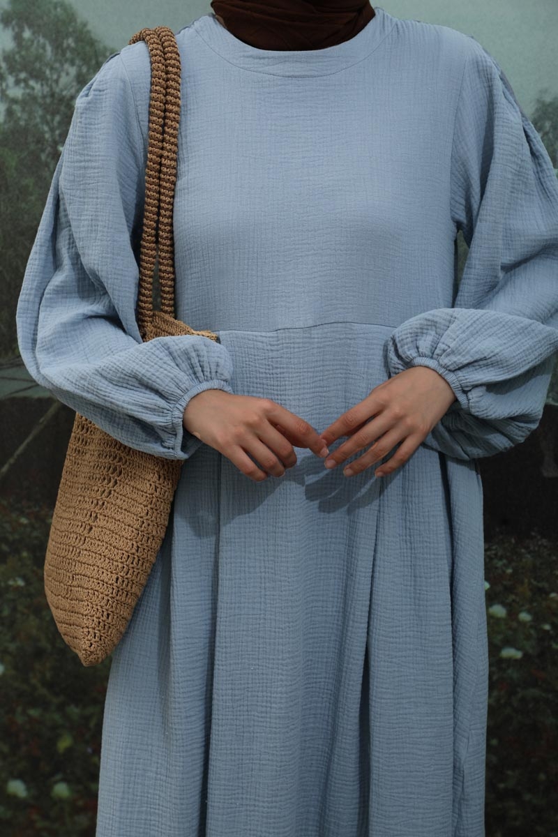 Müslin Klasik Elbise Bebe Mavisi. Hakim yakalıdır, arkadan düğmelidir, astarsızdır, yandan gizli ceplidir, kolları büzgülü ve lastiklidir, kuşaksızdır, günlük kullanımlara uygundur.