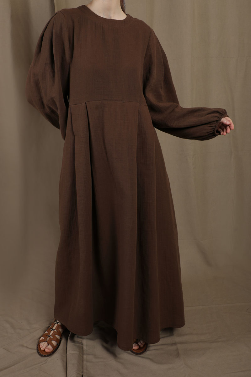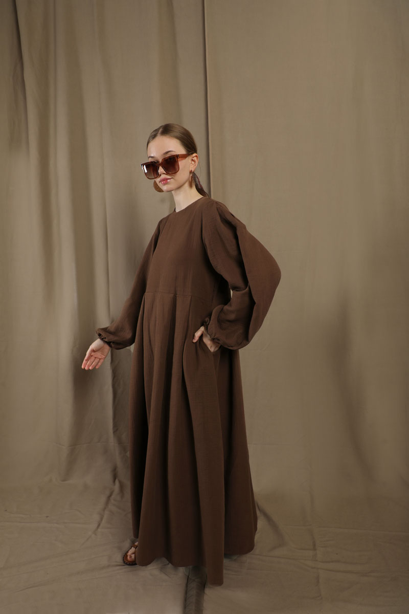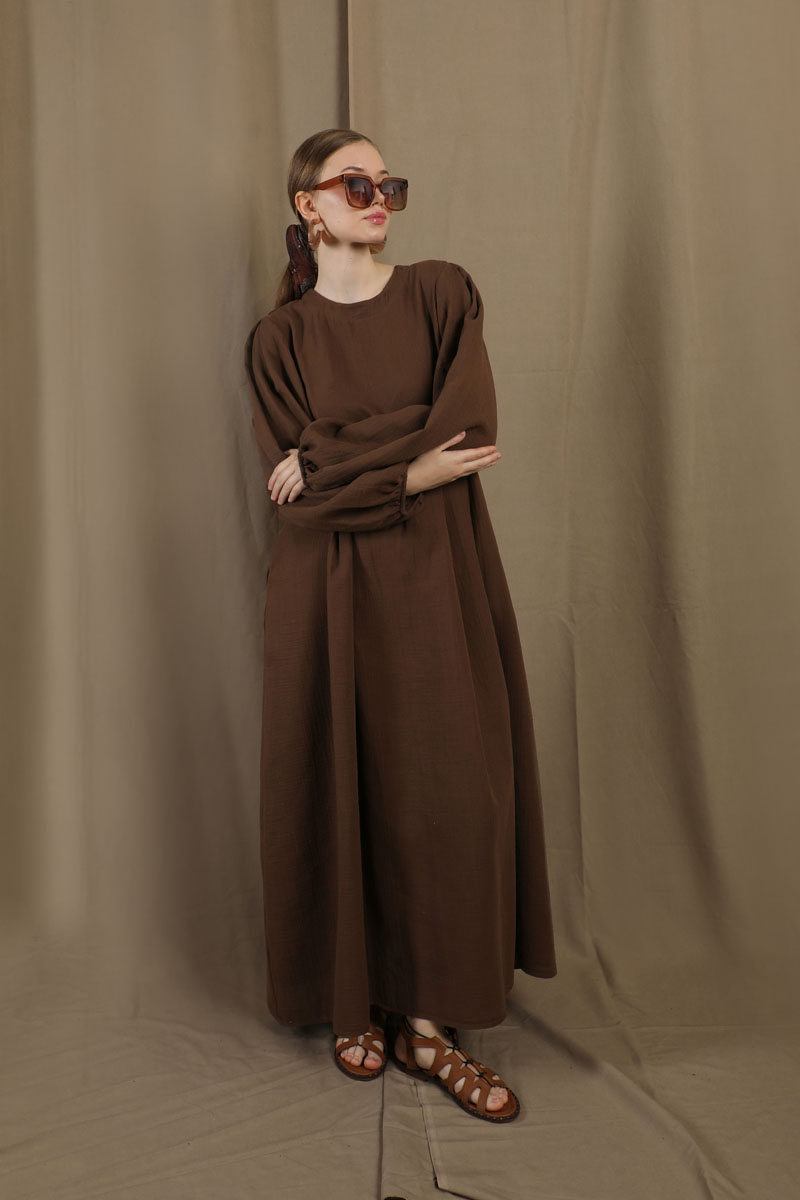 Müslin Klasik Elbise Kahve. Hakim yakalıdır, arkadan düğmelidir, astarsızdır, yandan gizli ceplidir, kolları büzgülü ve lastiklidir, kuşaksızdır, günlük kullanımlara uygundur.
