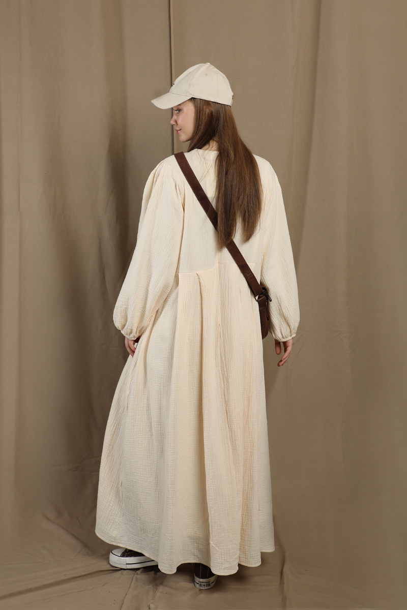 Müslin Klasik Elbise Krem. Hakim yakalıdır, arkadan düğmelidir, astarsızdır, yandan gizli ceplidir, kolları büzgülü ve lastiklidir, kuşaksızdır, günlük kullanımlara uygundur.