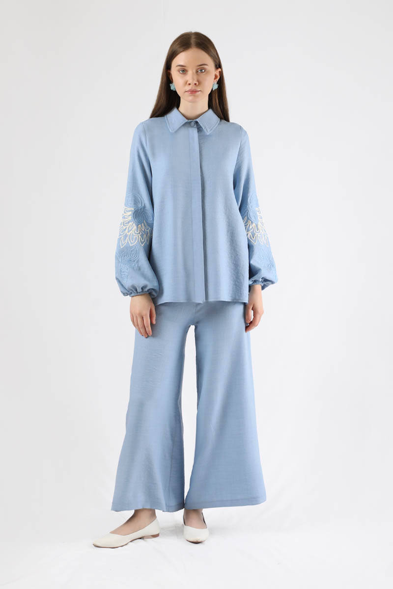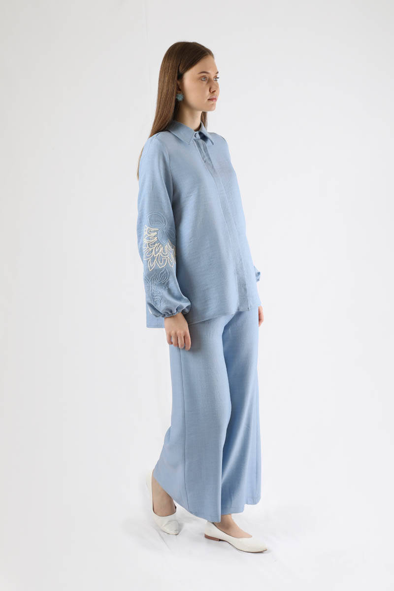 Nakış Detaylı Keten Takım Bebe Mavisi. Kol nakış detaylıdır. Manşeti büzgülüdür. Gizli düğmelidir. Gömlek yakalıdır. Pantolon beli lastiklidir. Pantolon bol paçadır. Günlük kullanım ve özel günlerinizde tercih edebilirsiniz.