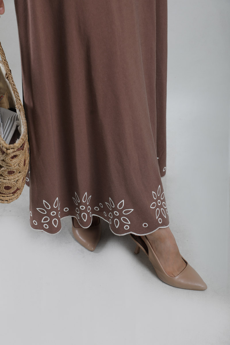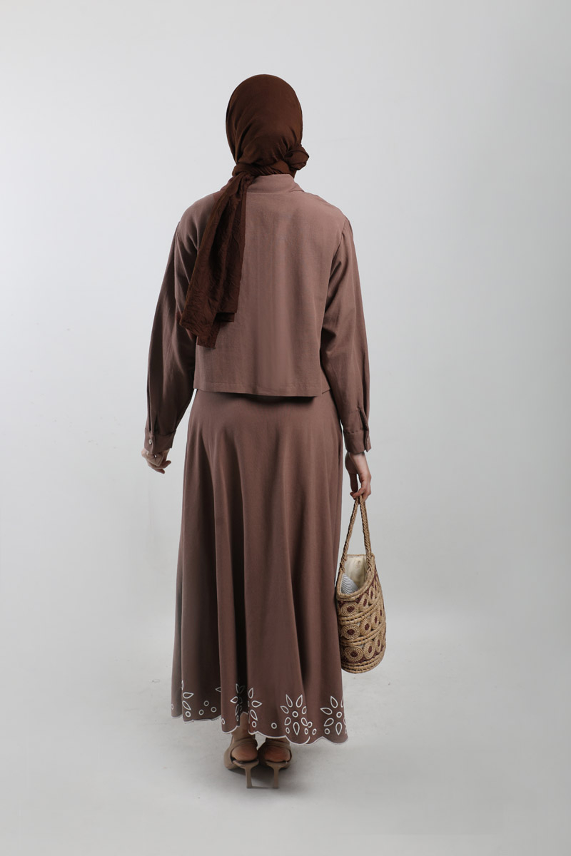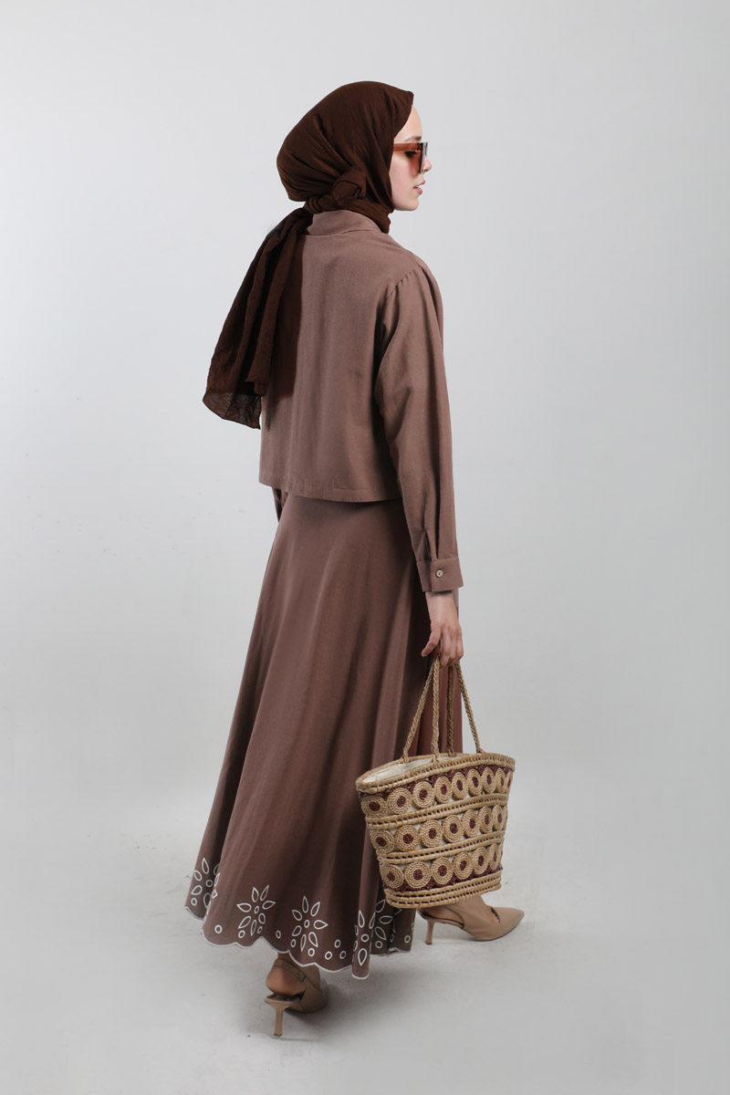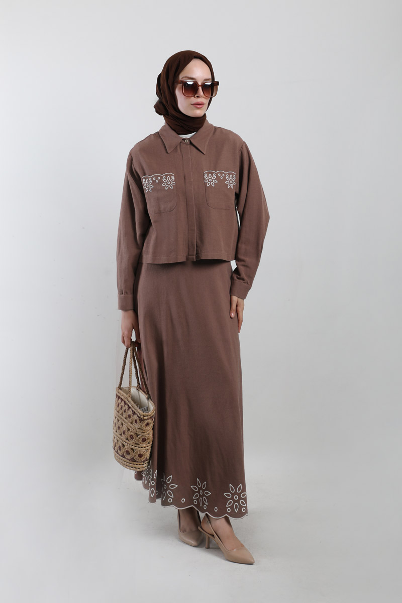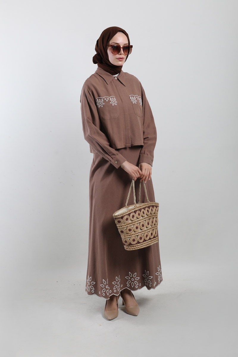 Nakışlı Etek Takım Kahverengi. Gömlek yakalıdır, düşük omuzludur, önden iki ceplidir, cepleri nakışlıdır, gizli düğmelidir, etek ucu nakışlıdır, yandan fermuarlıdır, astarsızdır.