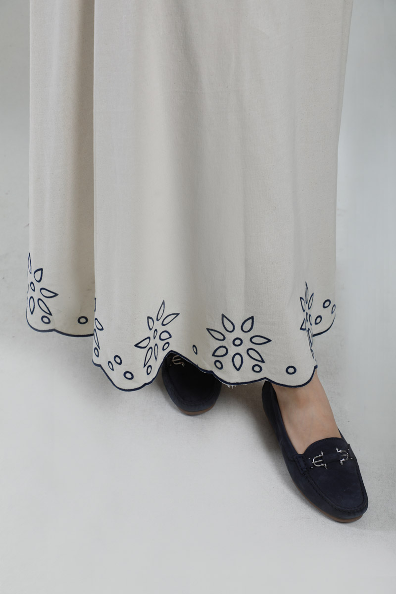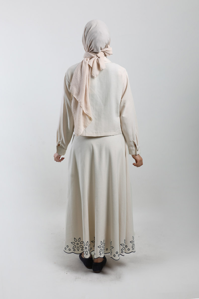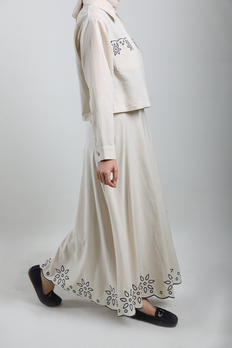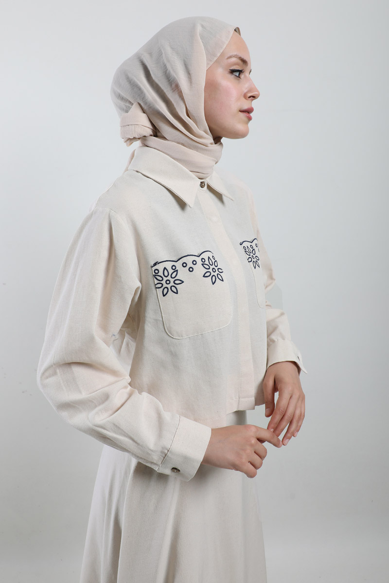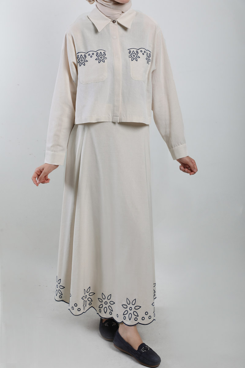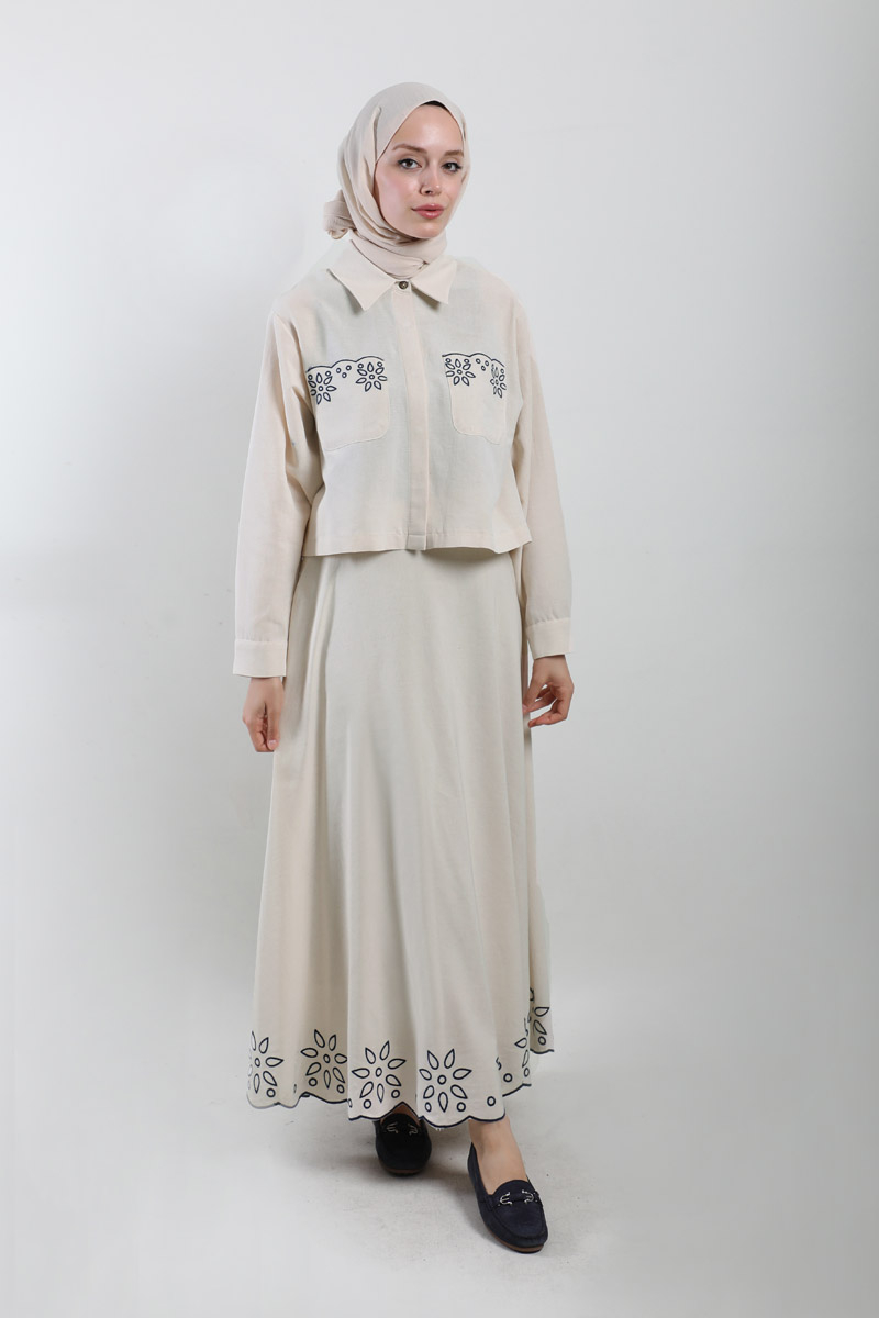 Nakışlı Etek Takım Taş. Gömlek yakalıdır, düşük omuzludur, önden iki ceplidir, cepleri nakışlıdır, gizli düğmelidir, etek ucu nakışlıdır, yandan fermuarlıdır, astarsızdır.