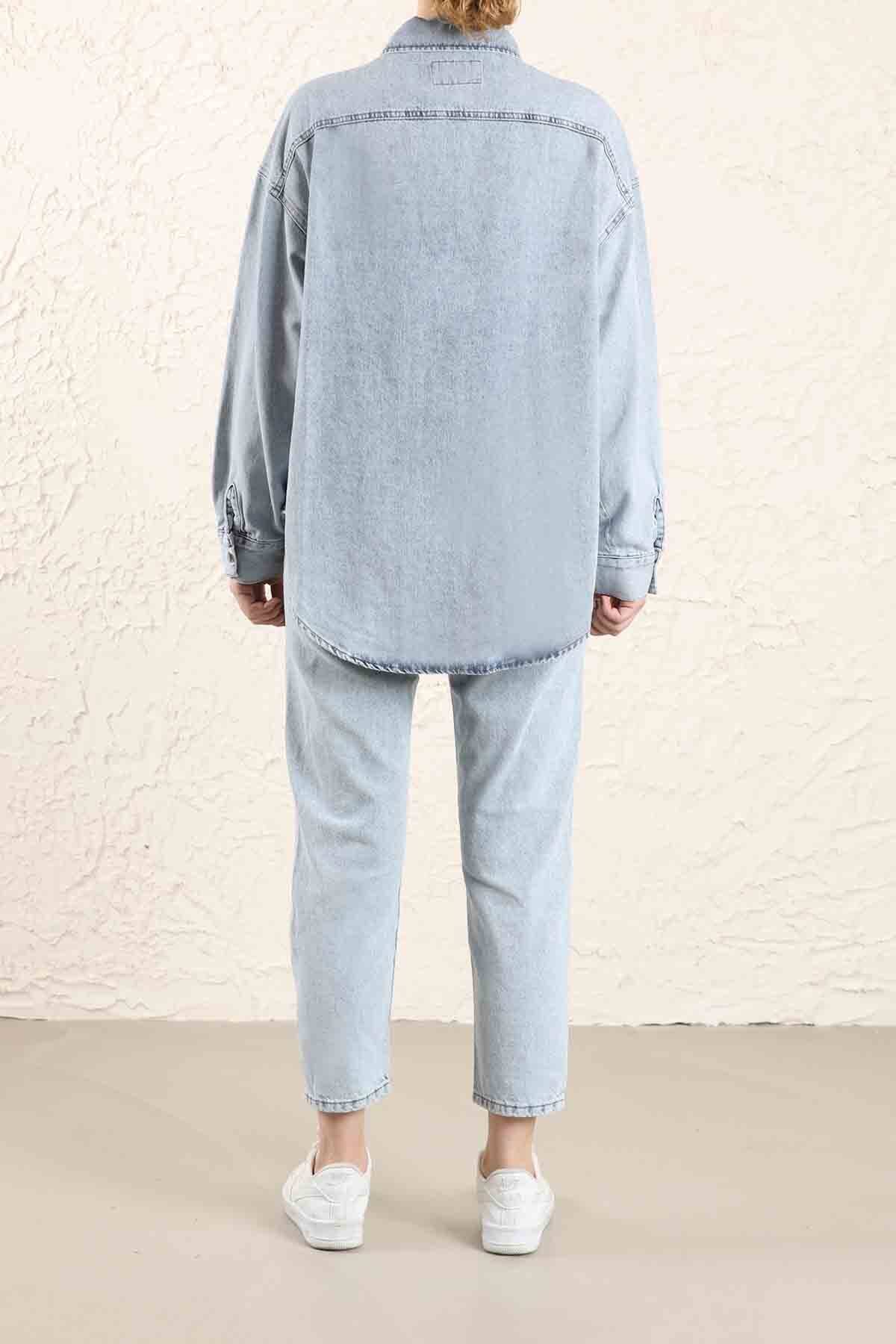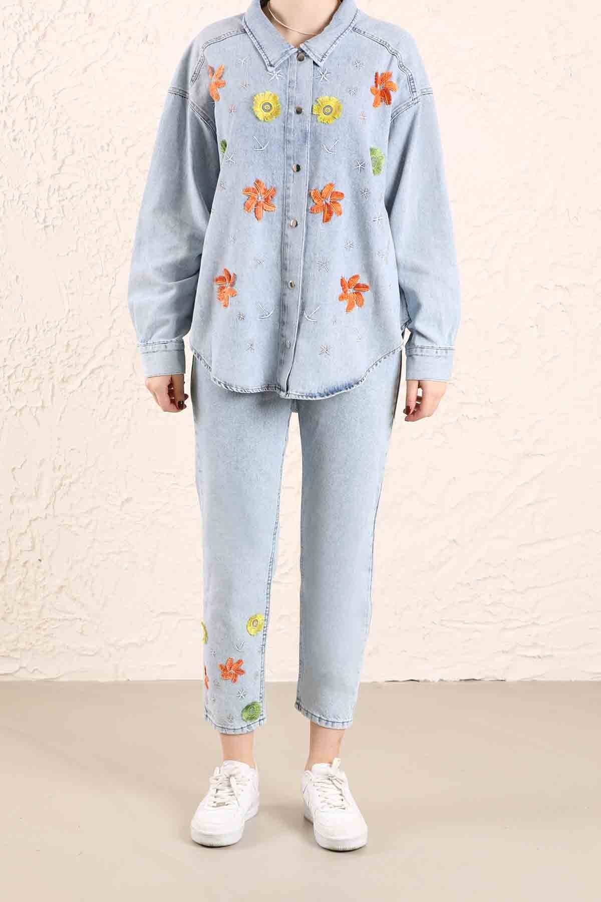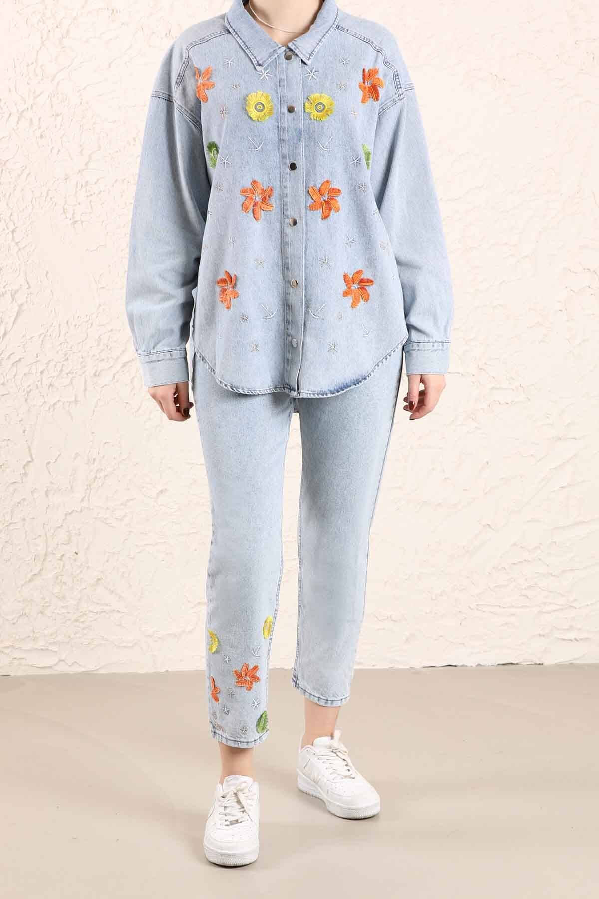 Nakışlı Kot Pantolon Açık Mavi