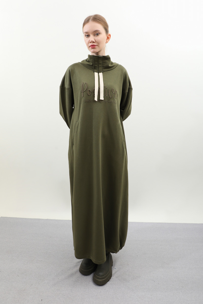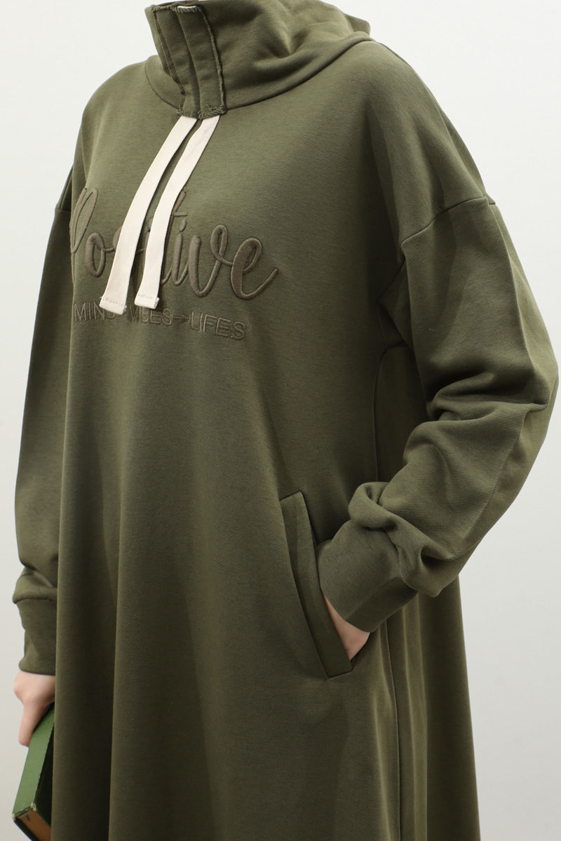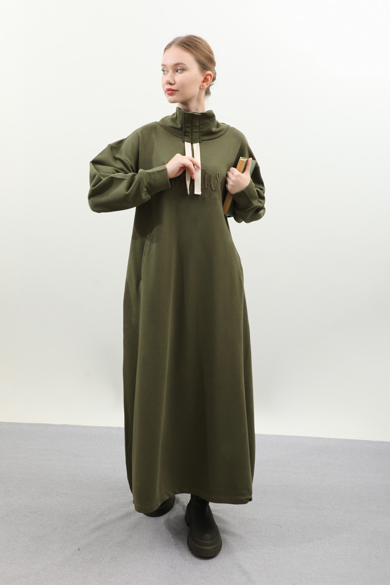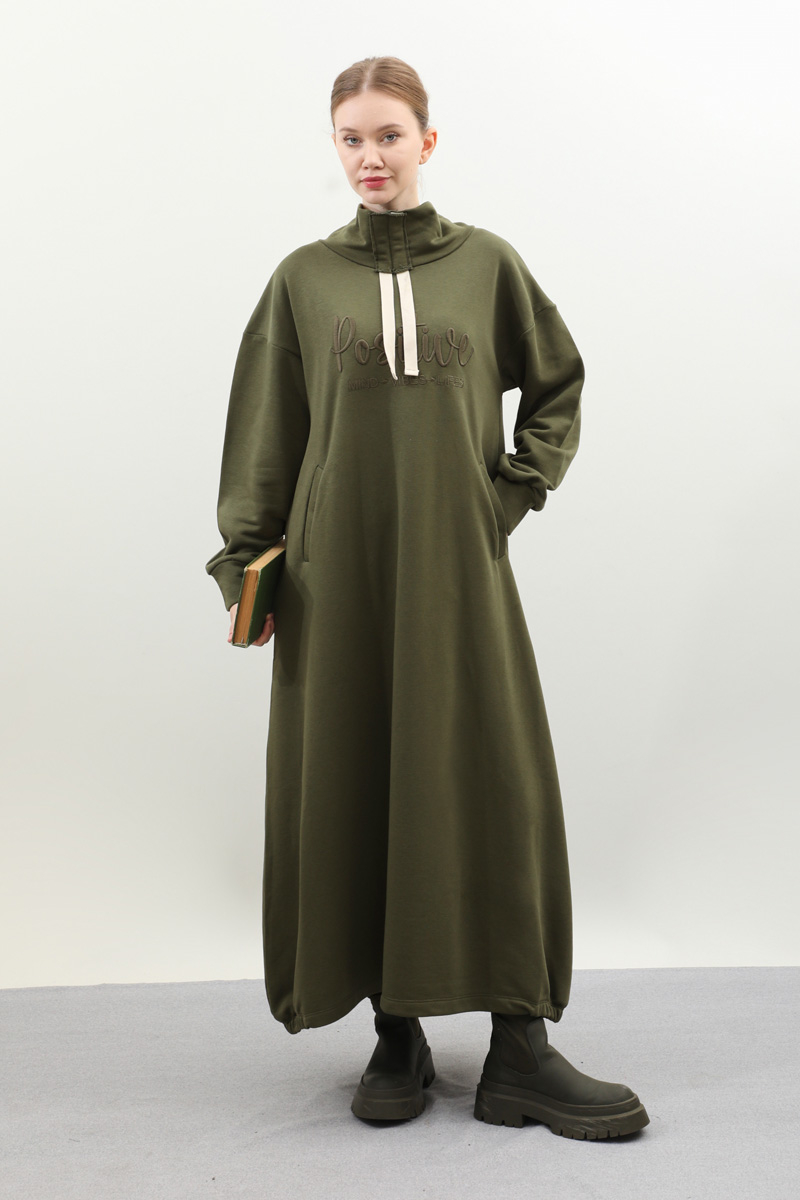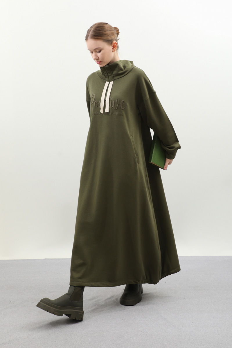 Nakışlı Spor Elbise Haki. Balıkçı yakadır, yaka tünel kordon büzgü detaylıdır, düşük omuzludur, bilekten manşetlidir, filetto ceplidir, nakış detaylıdır, etek yandan lastik detaylıdır. Günlük kullanım ve özel günlerinizde tercih edebilirsiniz.