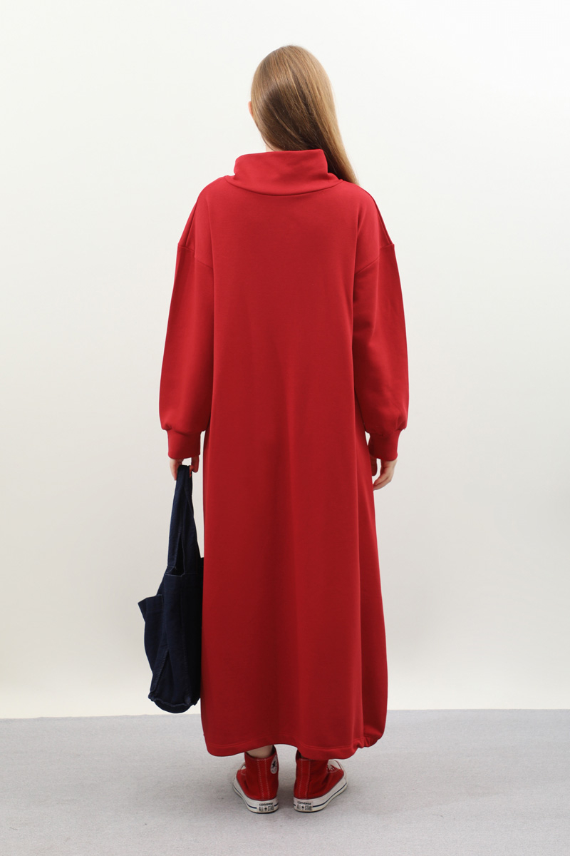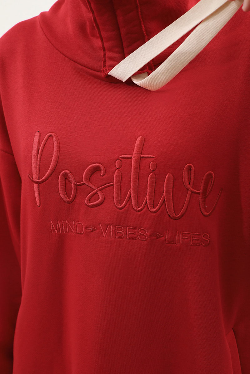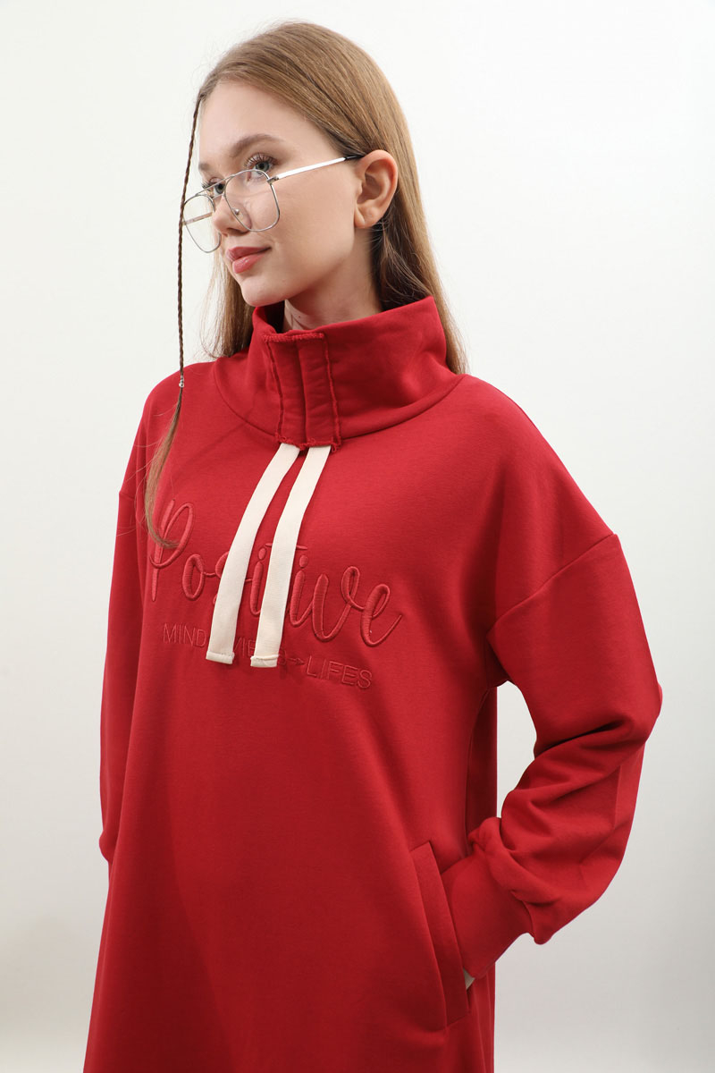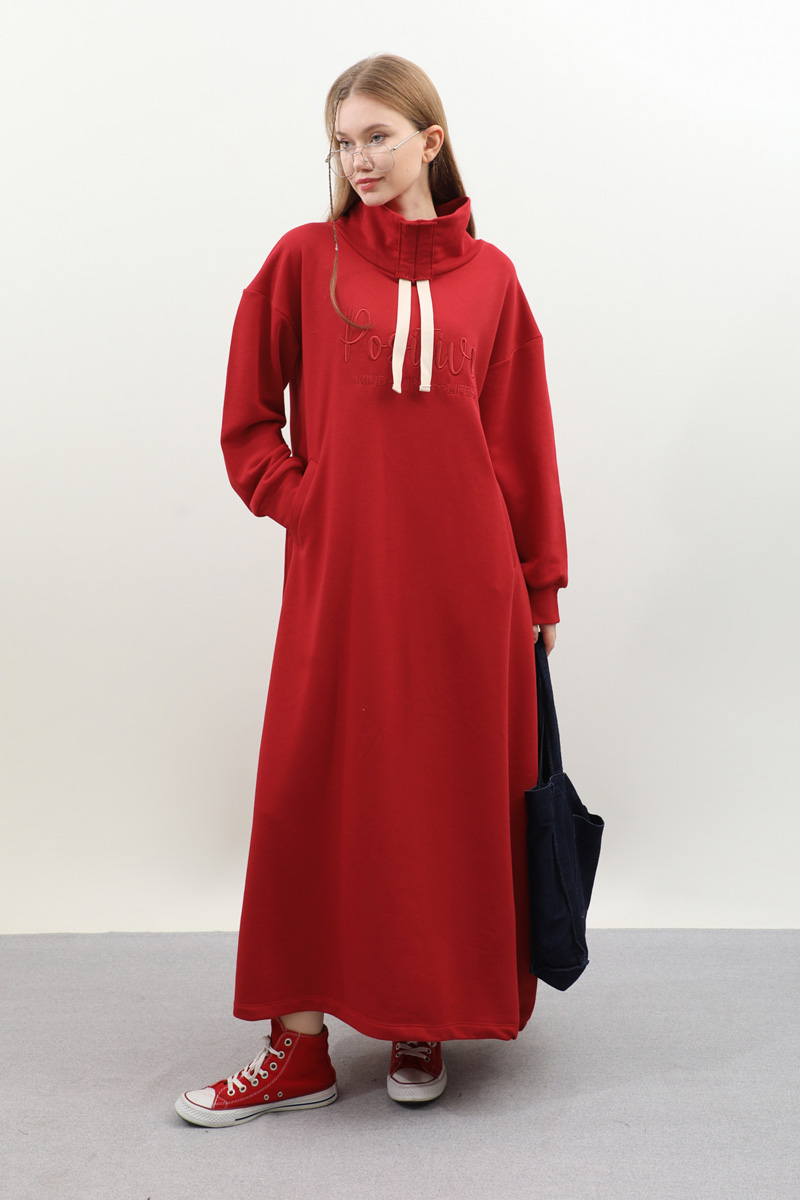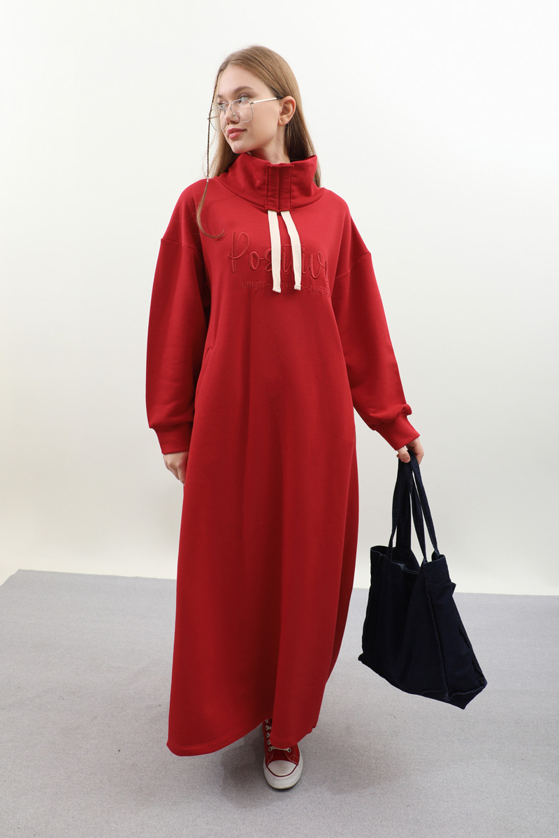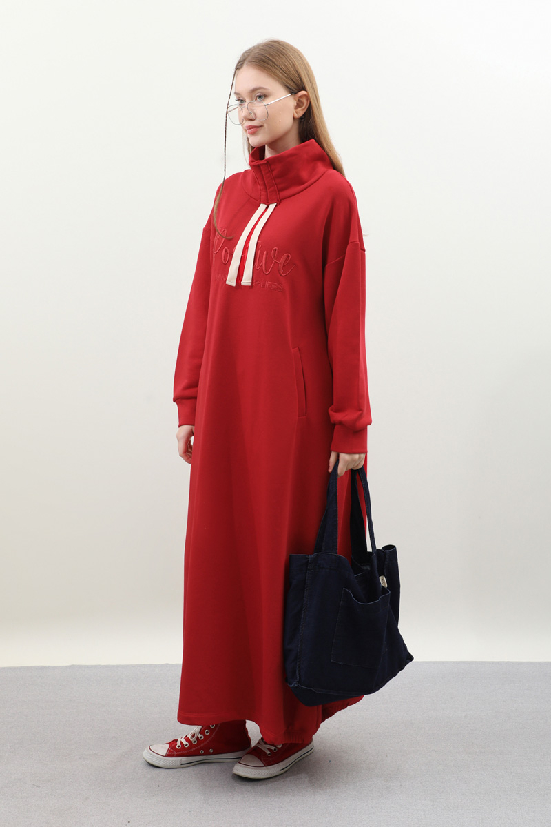 Nakışlı Spor Elbise Kırmızı. Balıkçı yakadır, yaka tünel kordon büzgü detaylıdır, düşük omuzludur, bilekten manşetlidir, filetto ceplidir, nakış detaylıdır, etek yandan lastik detaylıdır. Günlük kullanım ve özel günlerinizde tercih edebilirsiniz.