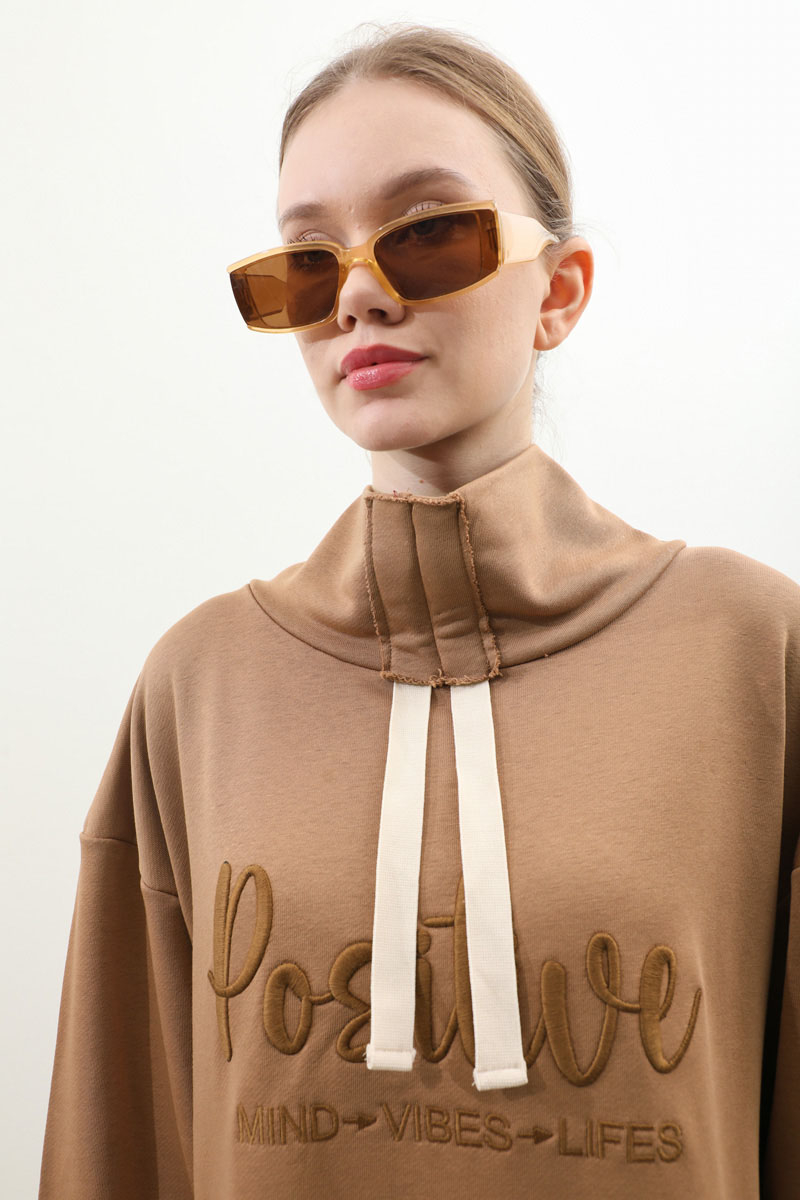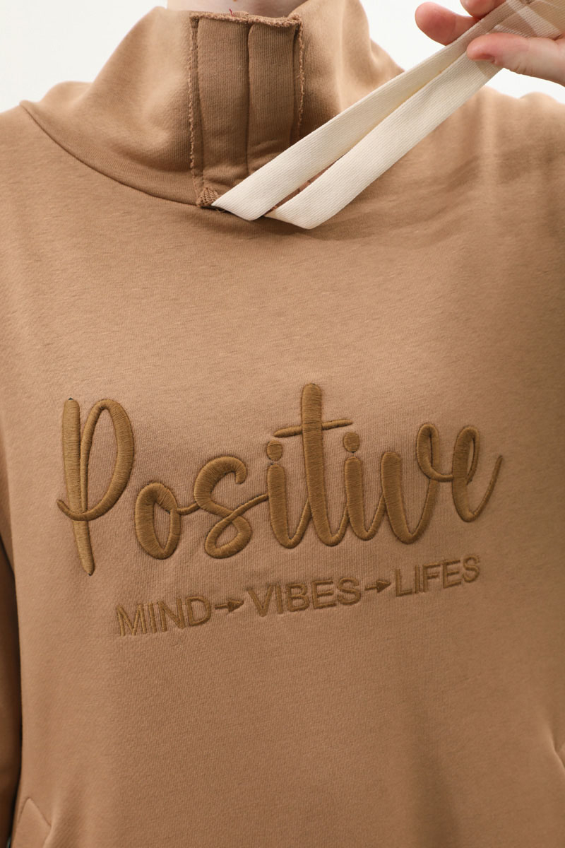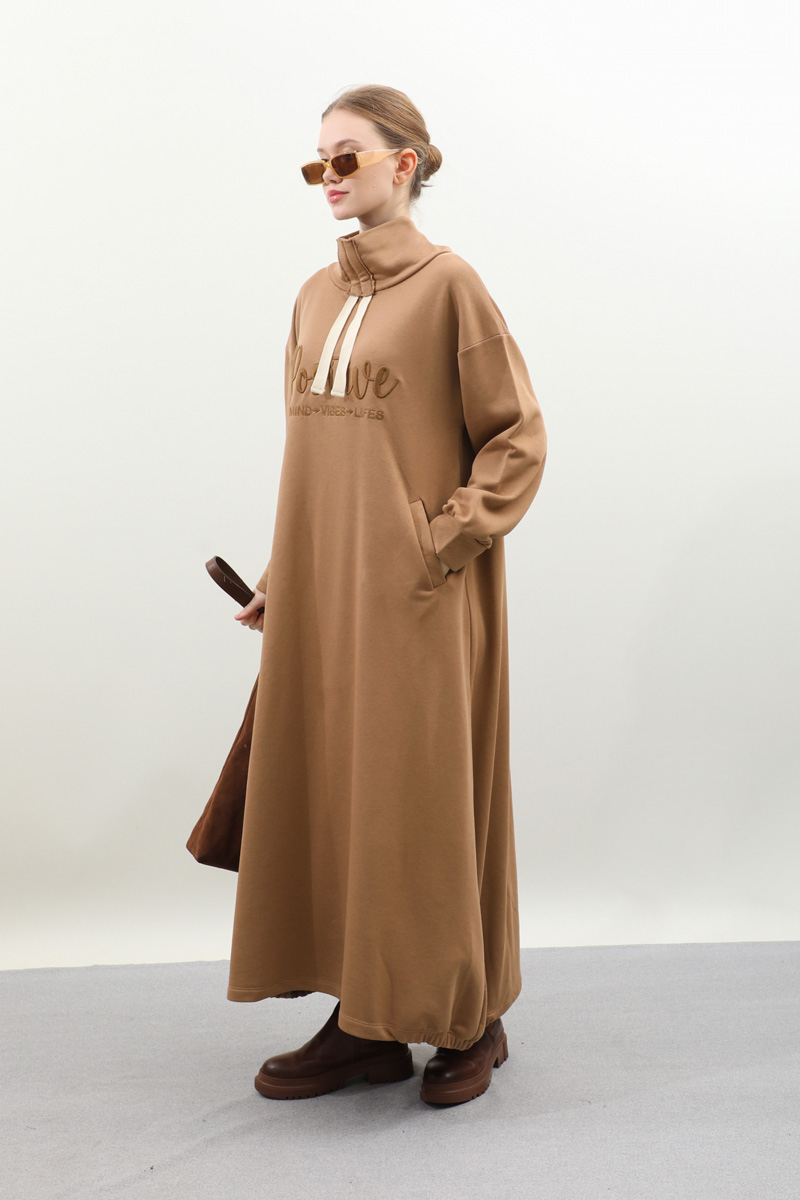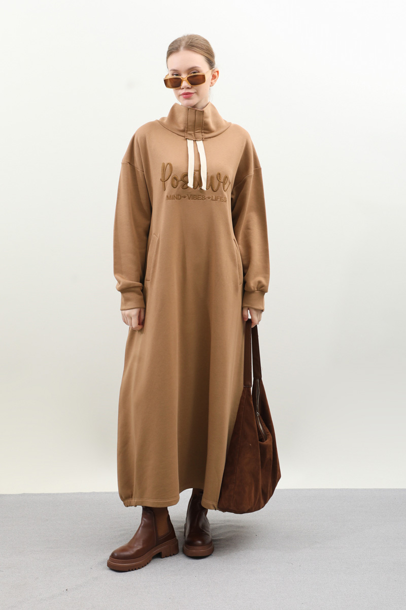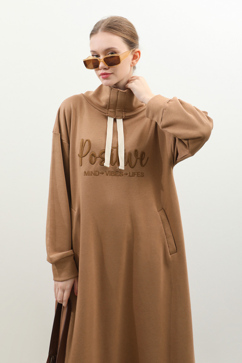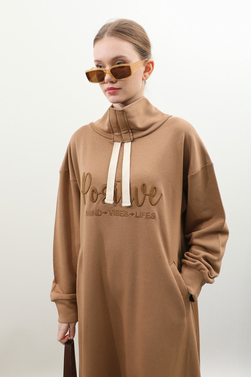 Nakışlı Spor Elbise Taba. Balıkçı yakadır, yaka tünel kordon büzgü detaylıdır, düşük omuzludur, bilekten manşetlidir, filetto ceplidir, nakış detaylıdır, etek yandan lastik detaylıdır. Günlük kullanım ve özel günlerinizde tercih edebilirsiniz.