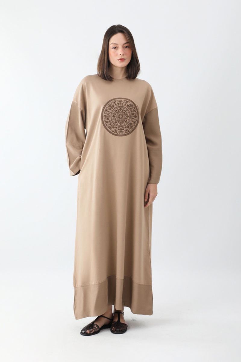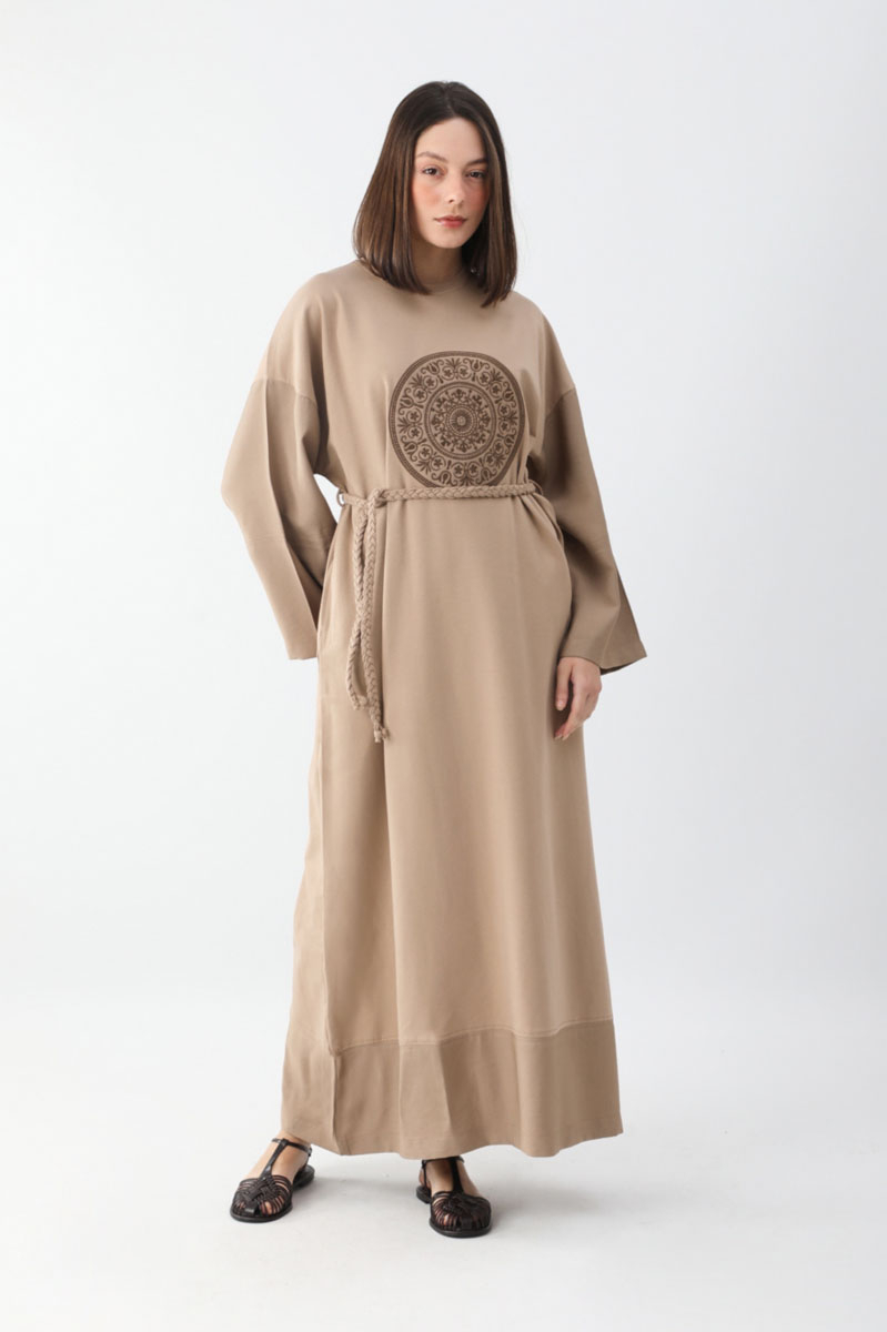 Nakışlı Sweat Elbise Camel. Bisiklet yakadır, düşük omuzludur, önden nakış desenlidir, kol ve etek ucu parça detalıydır, yandan ceplidir, astarsızdır, örgü kuşaklıdır, Günlük kullanım ve özel günlerinizde tercih edebilirsiniz.