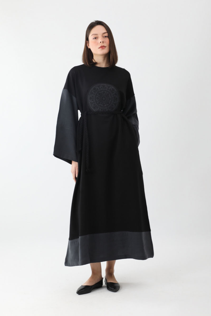 Nakışlı Sweat Elbise Siyah. Bisiklet yakadır, düşük omuzludur, önden nakış desenlidir, kol ve etek ucu parça detalıydır, yandan ceplidir, astarsızdır, örgü kuşaklıdır, Günlük kullanım ve özel günlerinizde tercih edebilirsiniz.