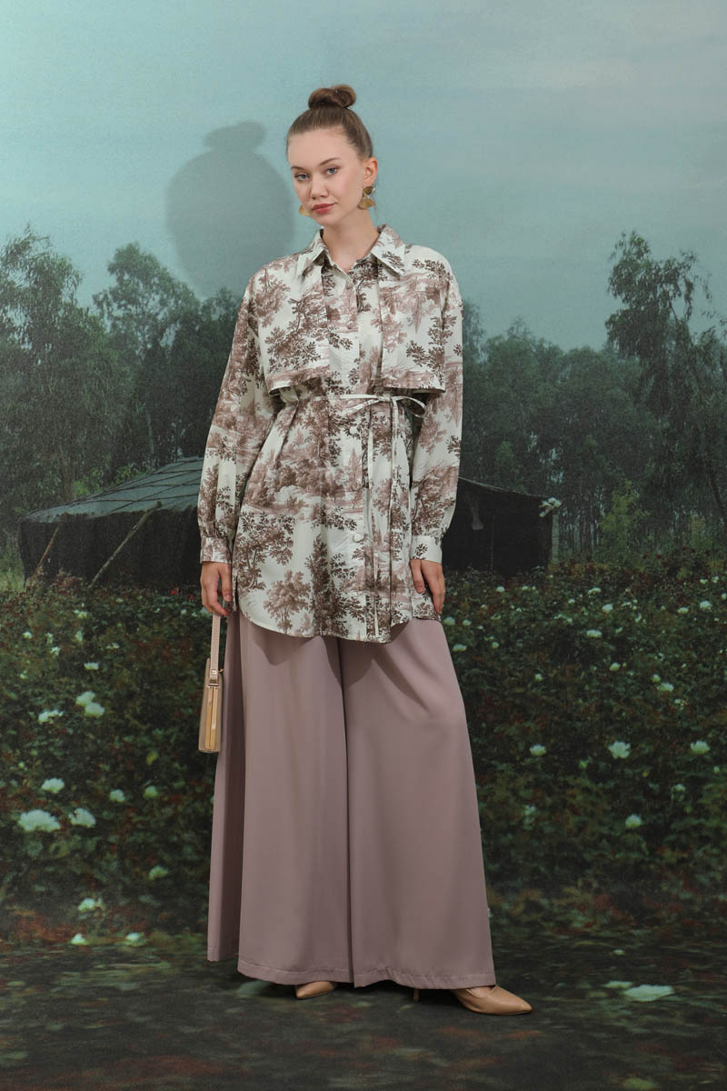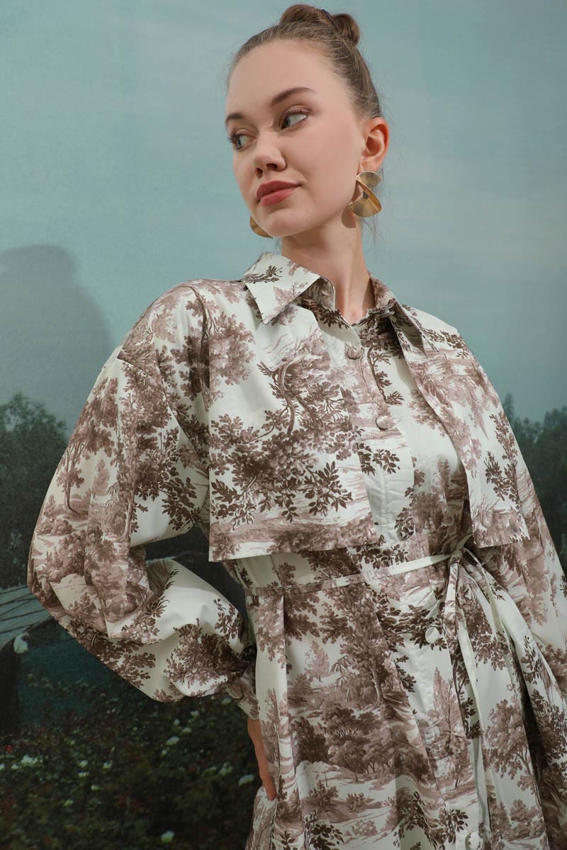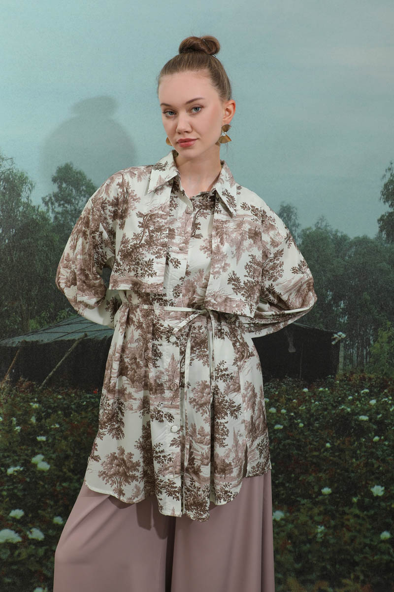 Natural Desen Gömlek Tunik Kahverengi. Rüzgarlıklı, biye kuşaklı, yandan gizli cepli, gömlek yaka, astarsızdır. Günlük şık kombinlerinizde tercih edebilirsiniz.