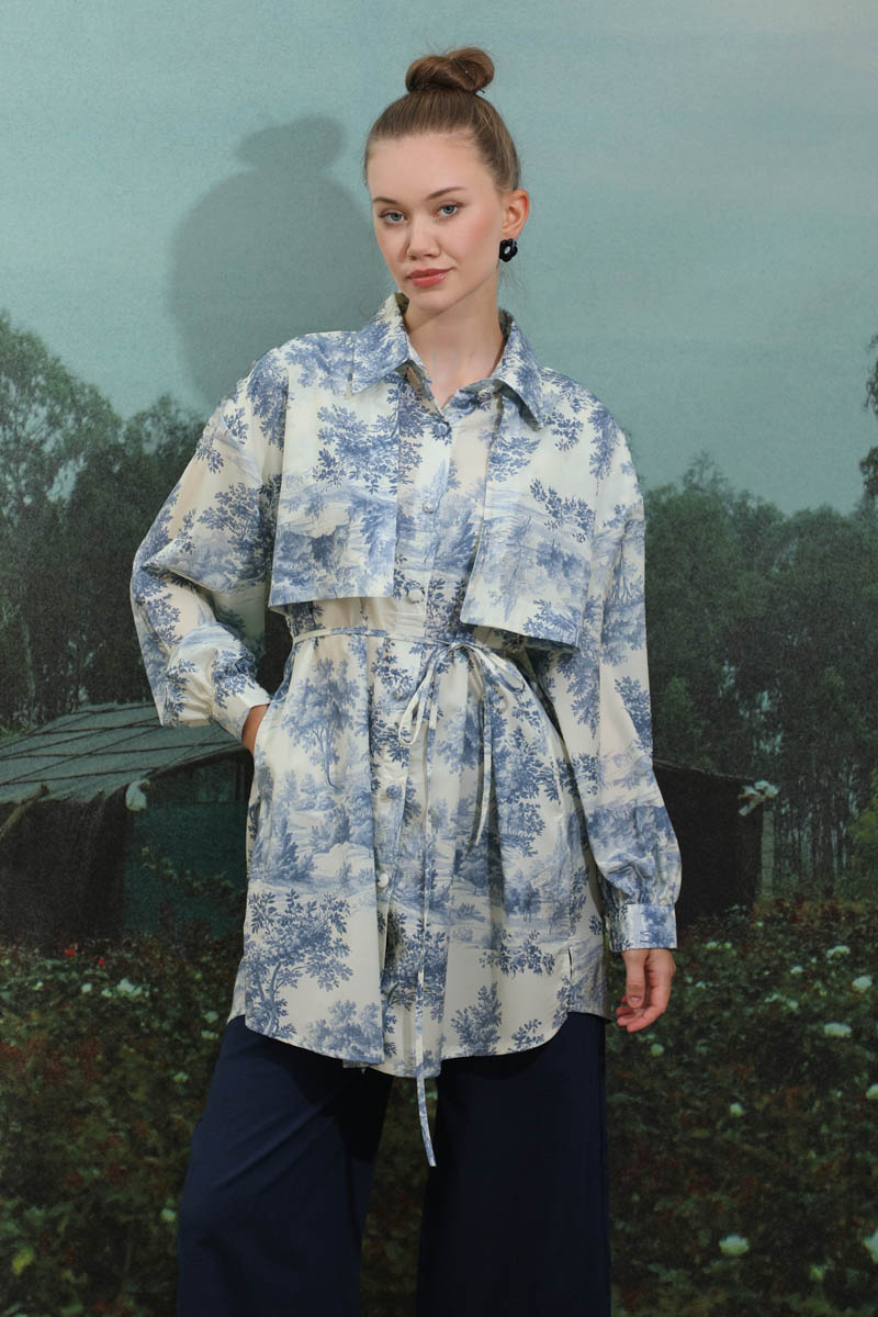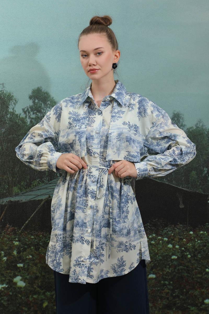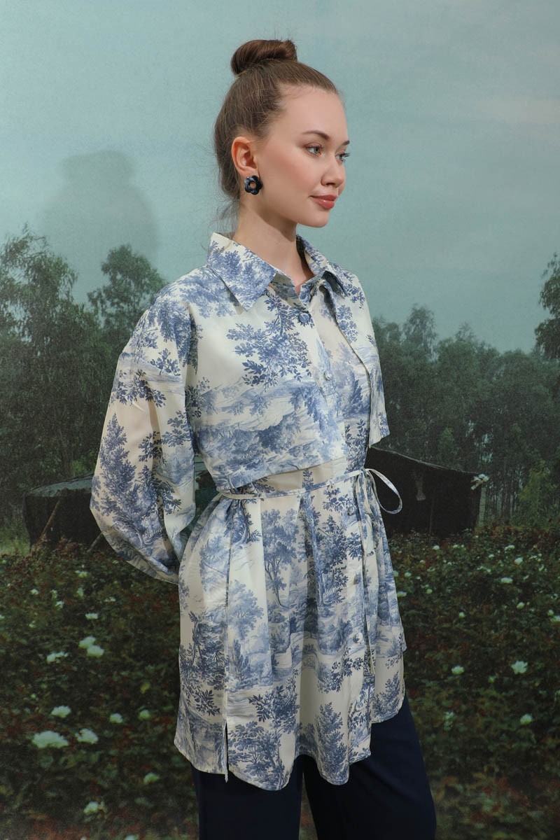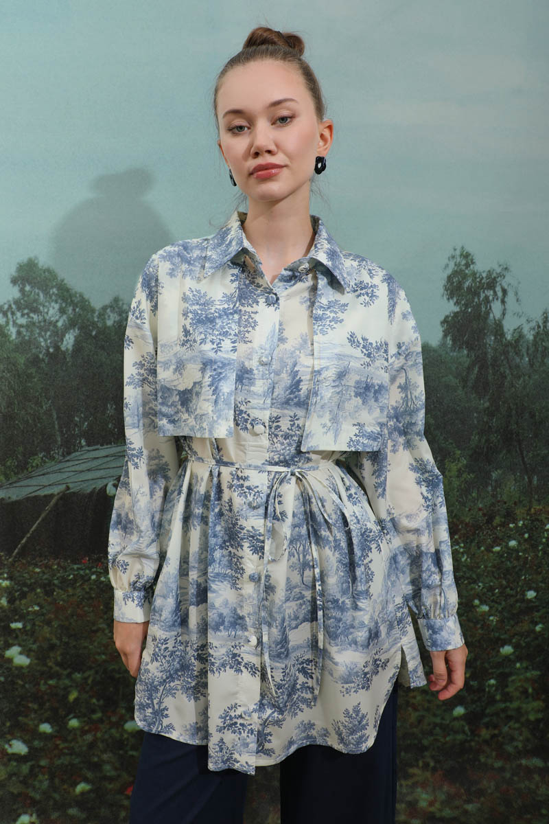 Natural Desen Gömlek Tunik Mavi. Rüzgarlıklı, biye kuşaklı, yandan gizli cepli, gömlek yaka, astarsızdır. Günlük şık kombinlerinizde tercih edebilirsiniz.