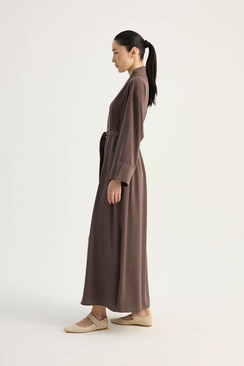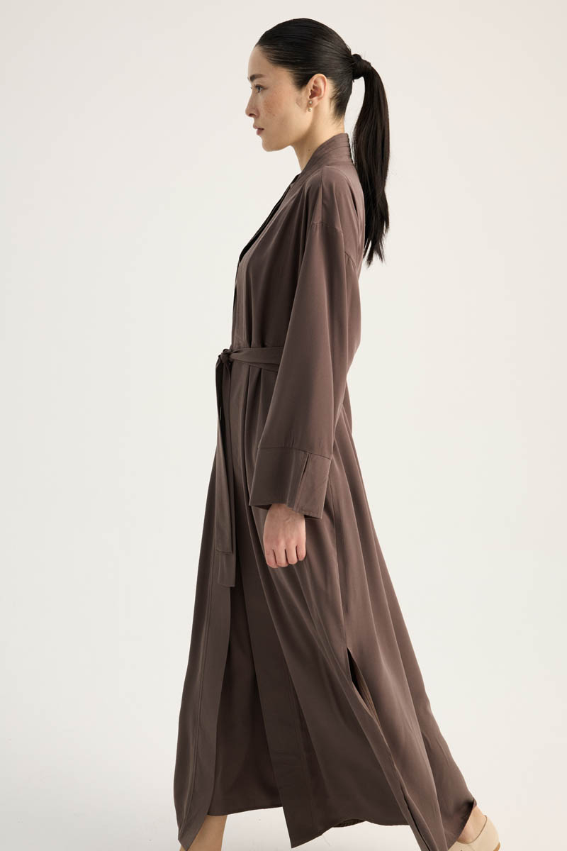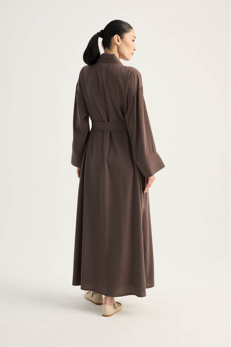 Nervür Detaylı Abaya Takım Kahverengi, iç jilesi bisiklet yakadır, Abaya önden nervür detaylıdır, kolu geniş yırtmaç detaylı olup yandan ceplidir, kuşaklıdır, astarsızdır. Günlük kullanım ve özel günlerinizde tercih edebilirsiniz.