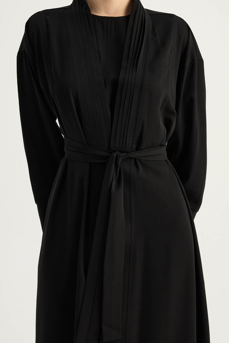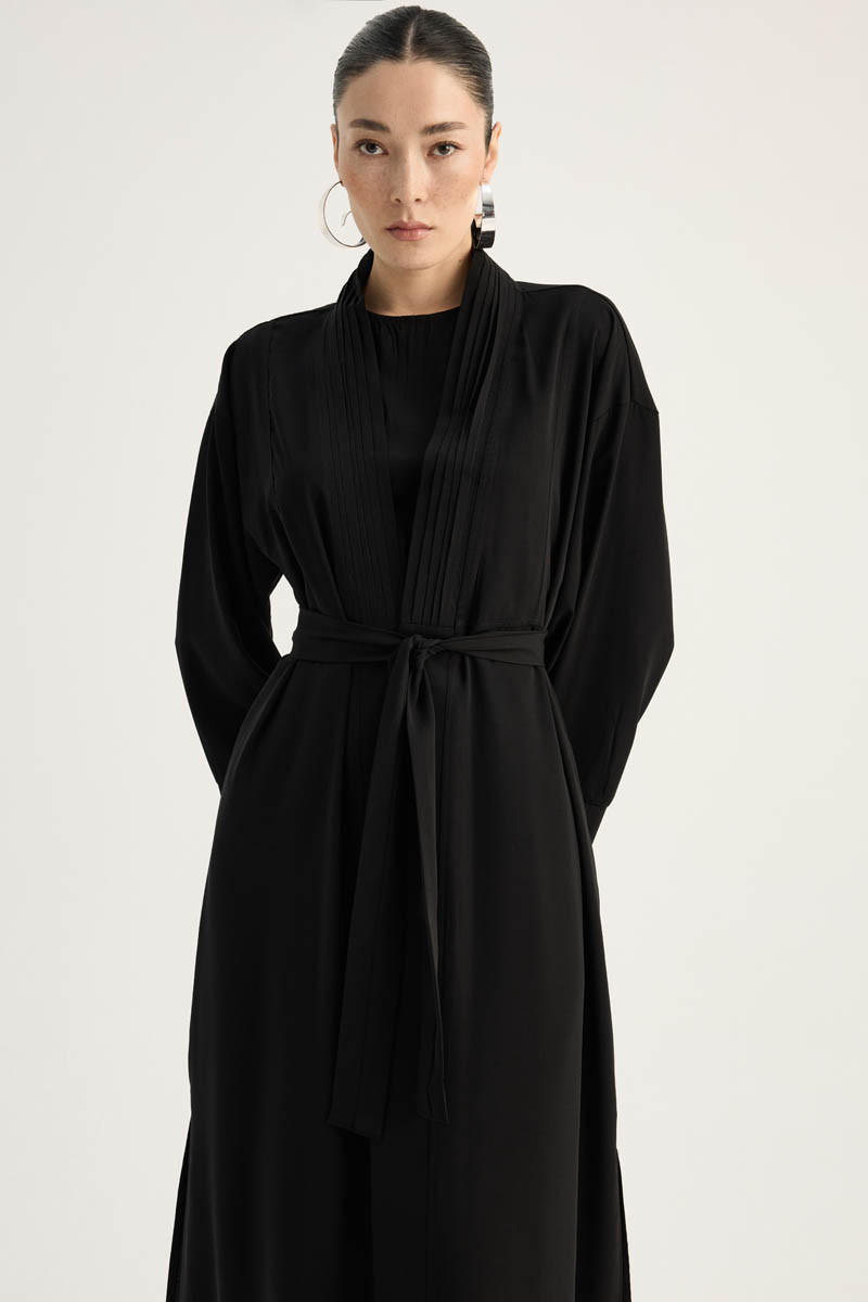 Nervür Detaylı Abaya Takım Siyah, iç jilesi bisiklet yakadır, Abaya önden nervür detaylıdır, kolu geniş yırtmaç detaylı olup yandan ceplidir, kuşaklıdır, astarsızdır. Günlük kullanım ve özel günlerinizde tercih edebilirsiniz.