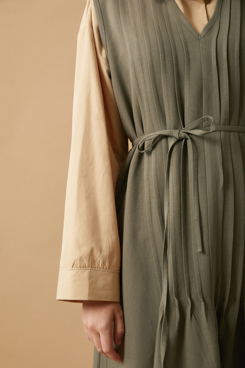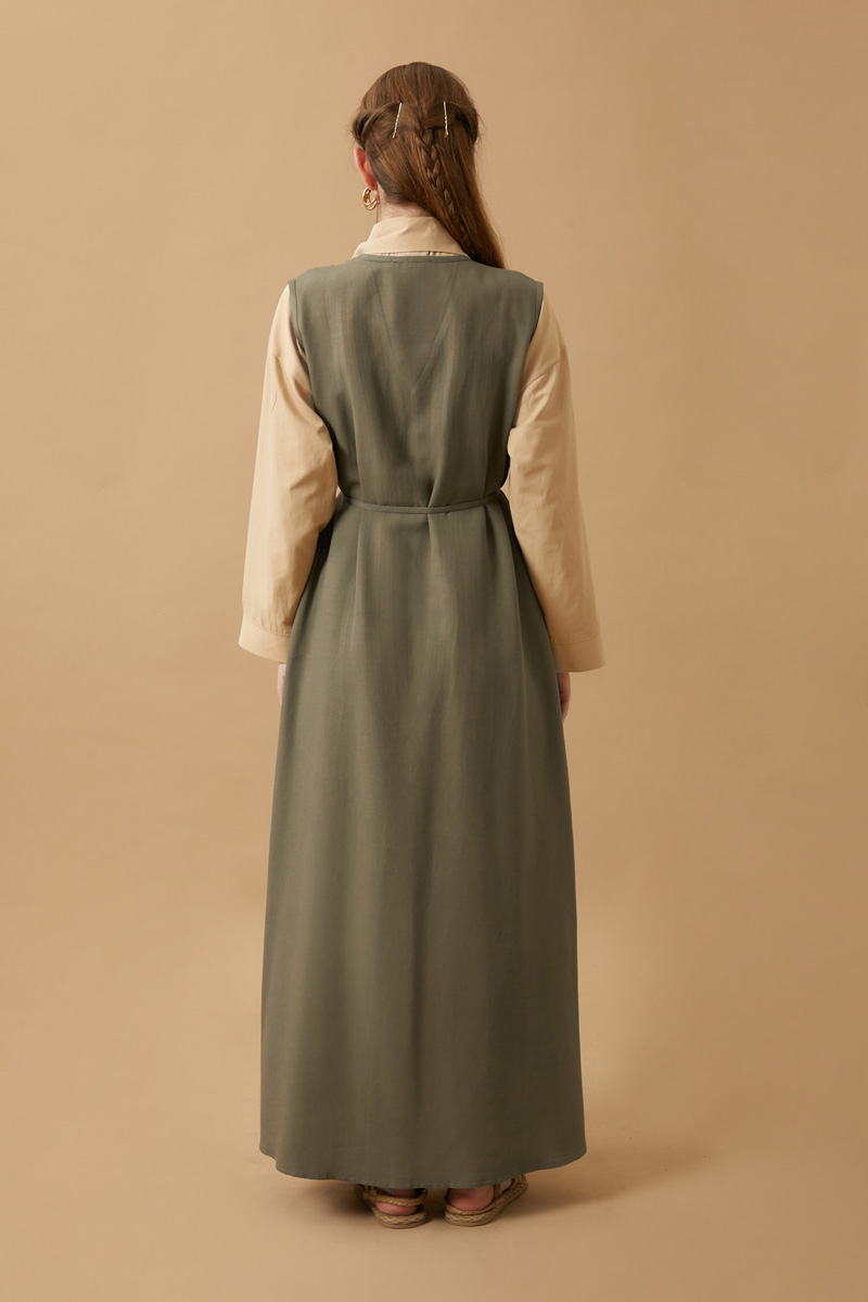 Nervür Detaylı Jile Haki, Zarif tasarımı ve rahat kesimiyle dikkat çeken bu elbise, viskon keten karışımlı kumaşı sayesinde hem nefes alabilir hem de hafif bir yapı sunar. Uzun kolları, manşet detayları ve beli vurgulayan kuşağı ile feminen bir silüet oluşturur.