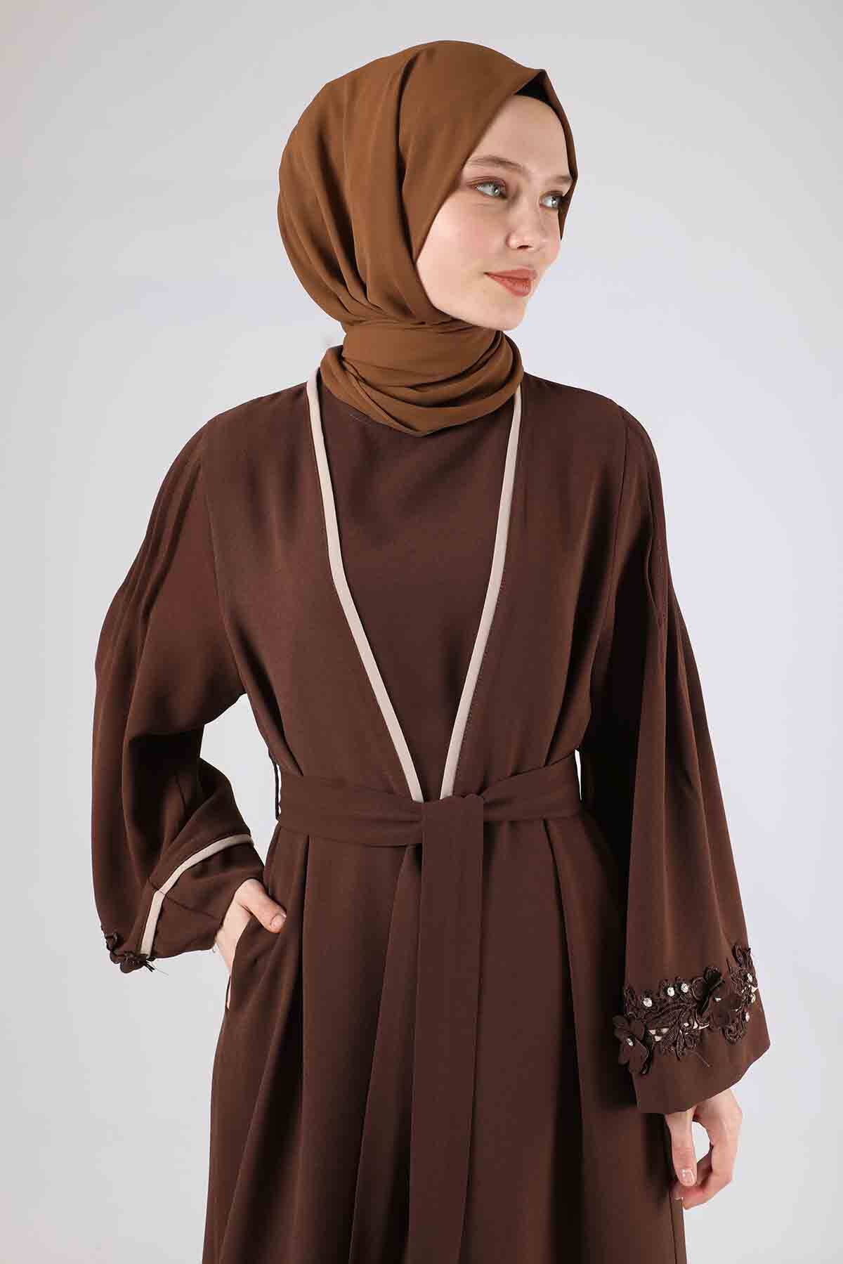 Nervürlü Abaya Takım Kahve. Nervür Detay, Manşetinde çiçek desenli aplike detayı mevcuttur. Pantolon beli lastiklidir.Üçlü takım olarak satılmaktadır.