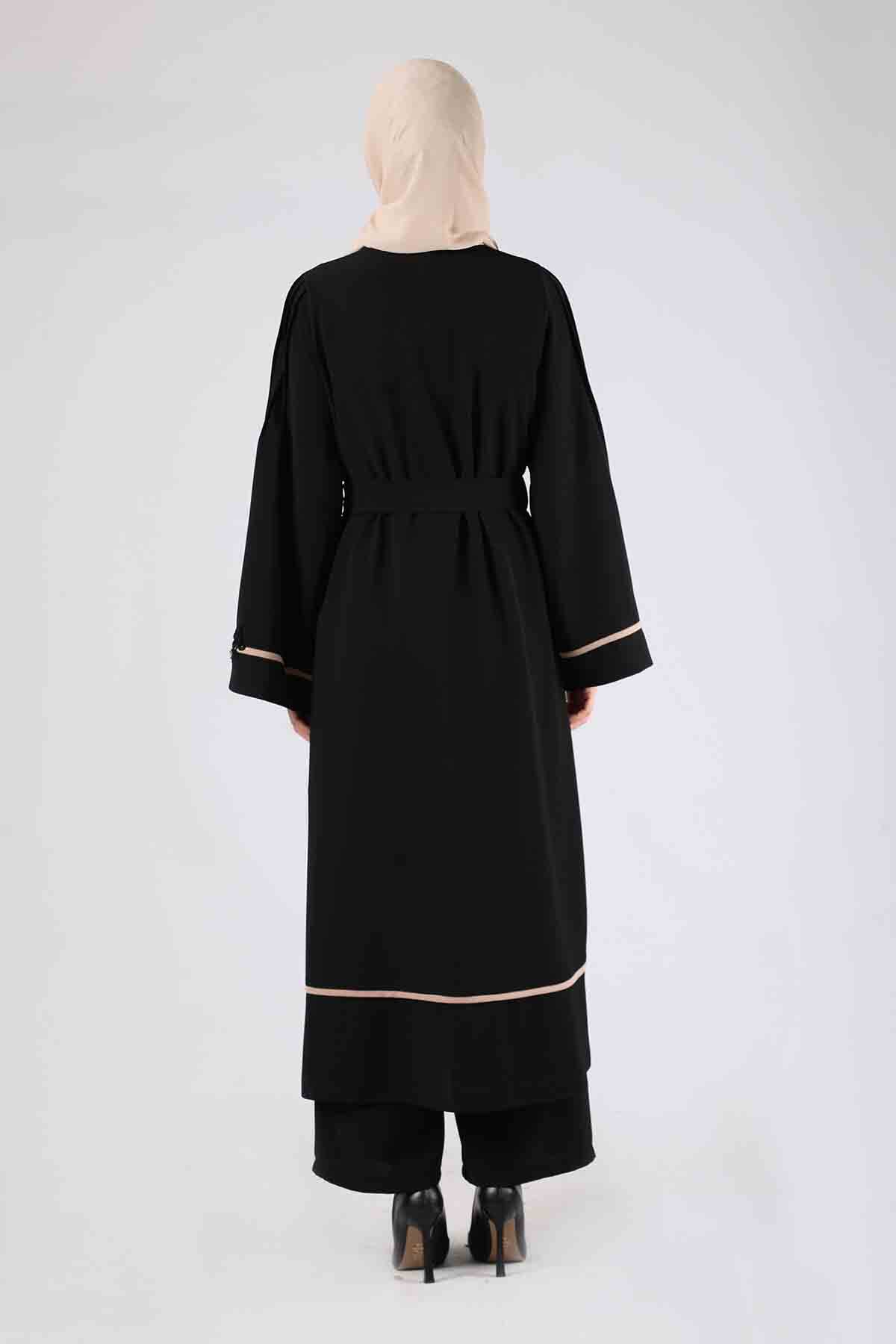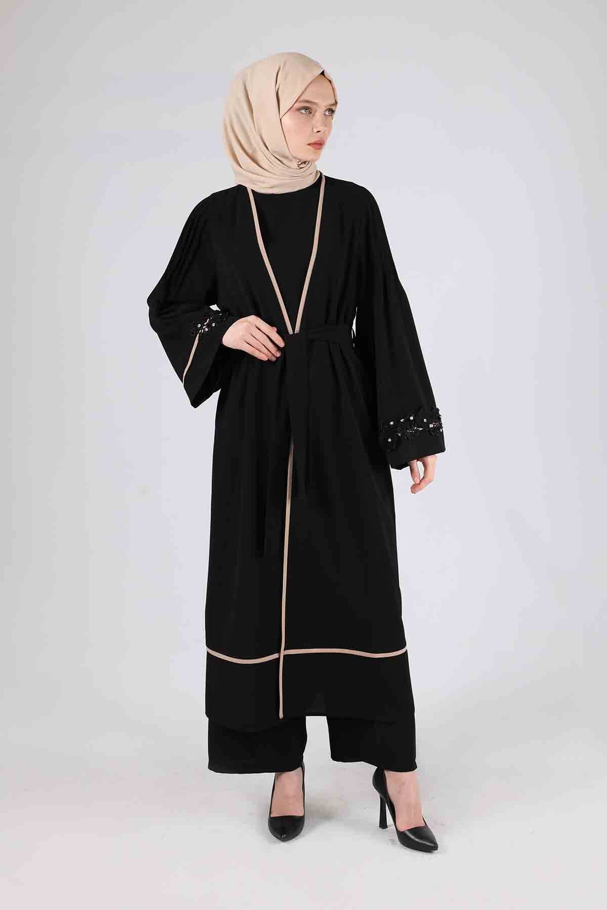 Ribbed Abaya Suit Black. Rib Detail, There is a floral appliqué detail on the cuff. Sold as a set of three.