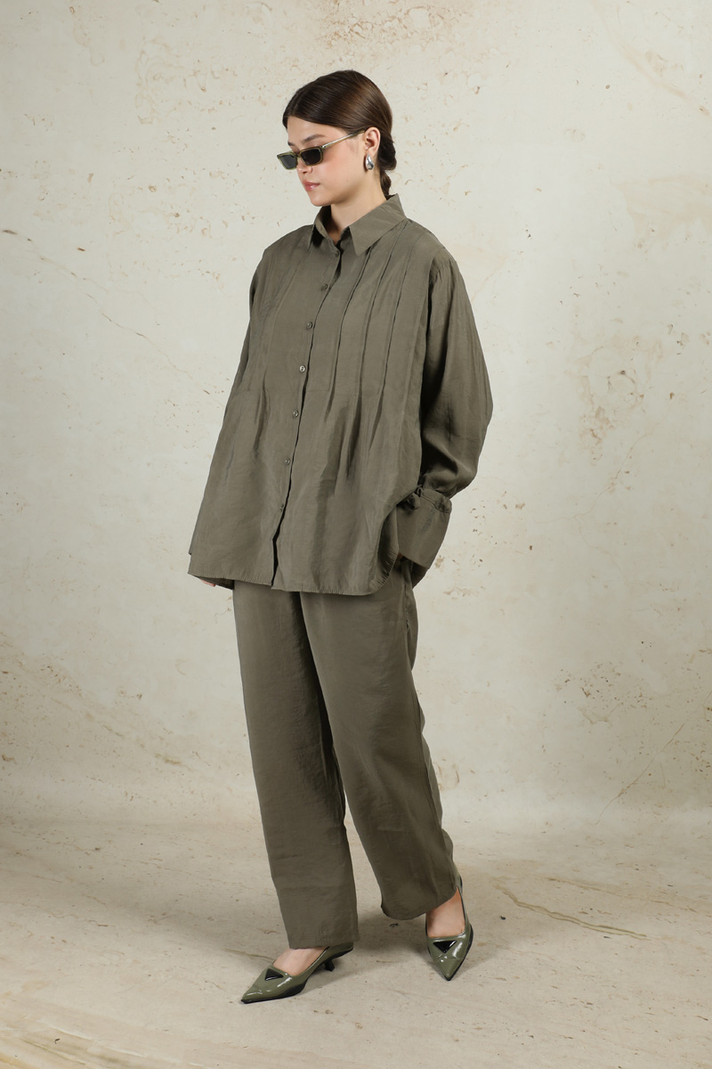 Nervürlü Gömlek Takım Haki. Gömlek yakalıdır. Önü düğmelidir. Ön bedende pile dikişleri mevcuttur. Manşeti ip ile büzülmelidir. Pantolon yandan ceplidir. Pantolon geniş paçadır. Arkada roba ve A pile vardır. Pantolon beli lastiklidir.