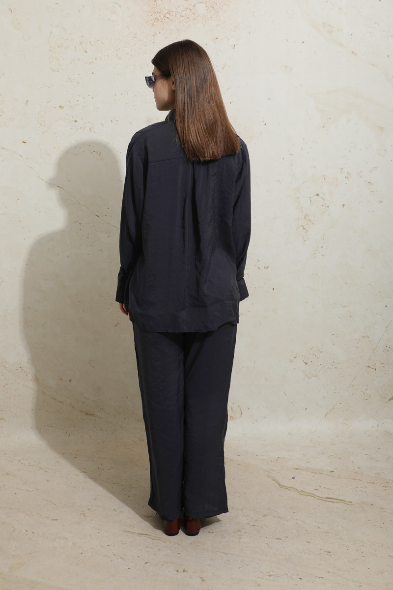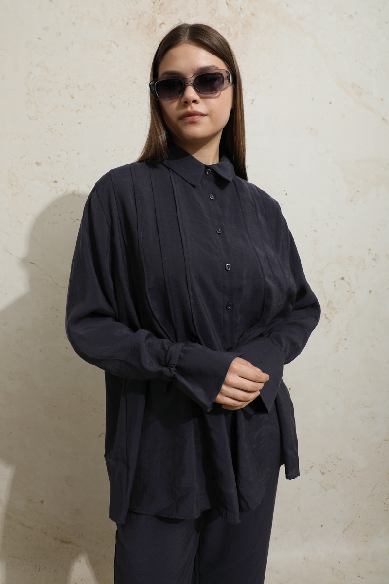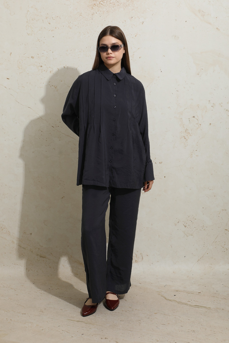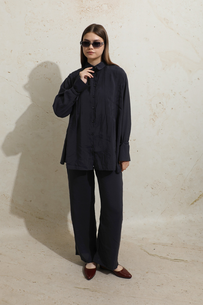 Nervürlü Gömlek Takım koyu lacivert. Gömlek yakalıdır. Önü düğmelidir. Ön bedende pile dikişleri mevcuttur. Manşeti ip ile büzülmelidir. Pantolon yandan ceplidir. Pantolon geniş paçadır. Arkada roba ve A pile vardır. Pantolon beli lastiklidir.