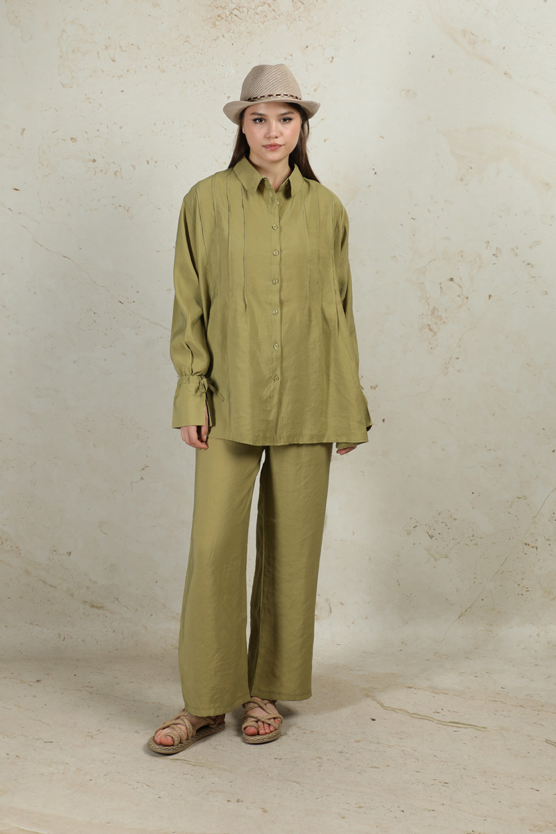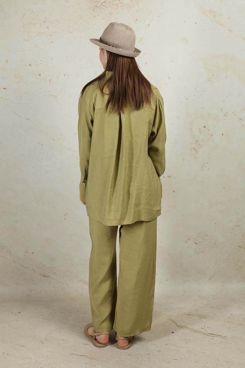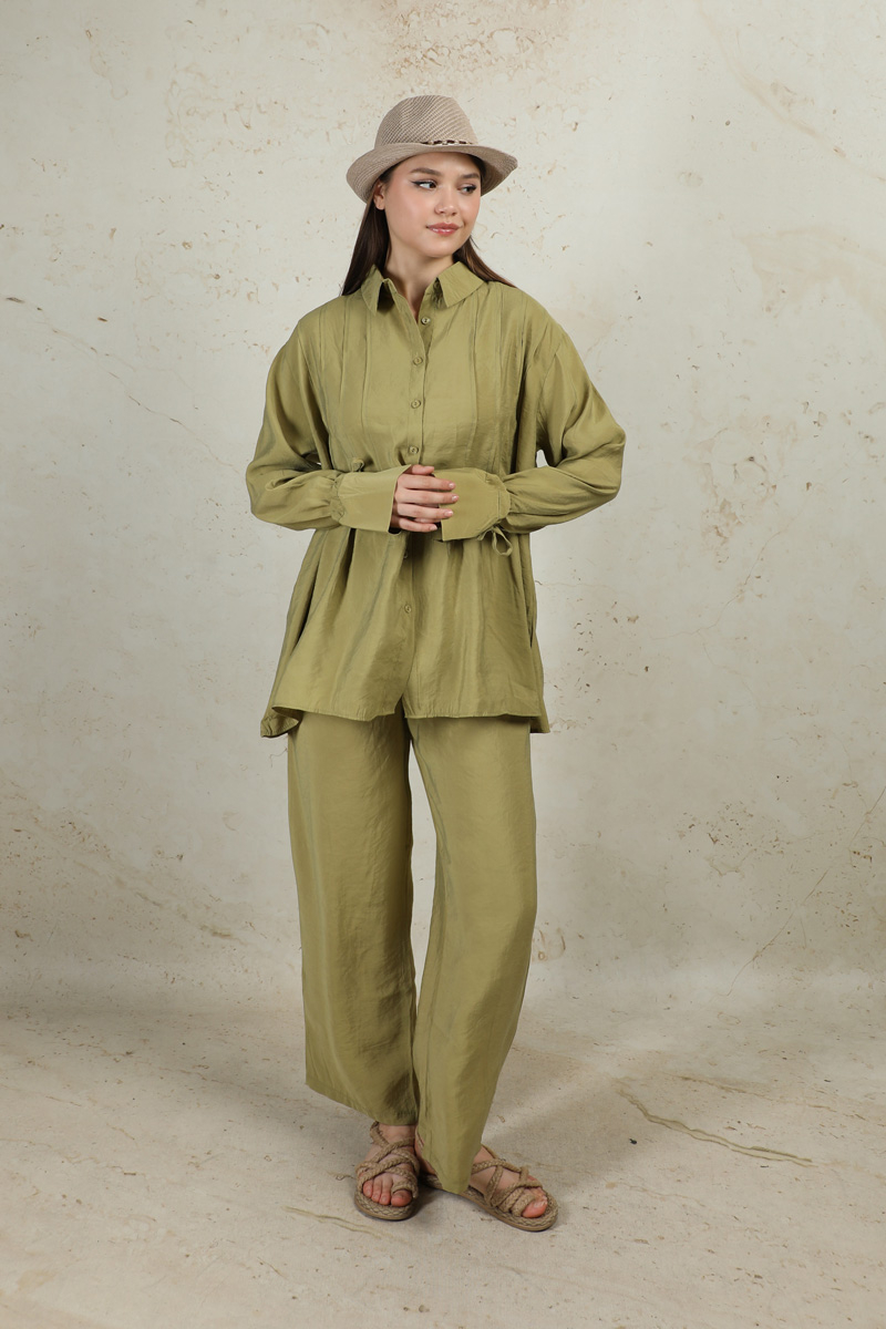 Nervürlü Gömlek Takım Yağ Yeşili. Gömlek yakalıdır. Önü düğmelidir. Ön bedende pile dikişleri mevcuttur. Manşeti ip ile büzülmelidir. Pantolon yandan ceplidir. Pantolon geniş paçadır. Arkada roba ve A pile vardır. Pantolon beli lastiklidir.