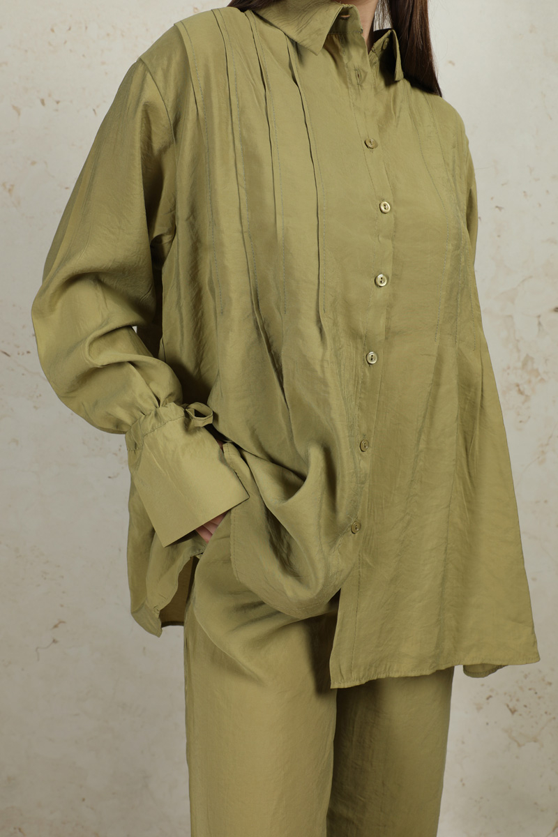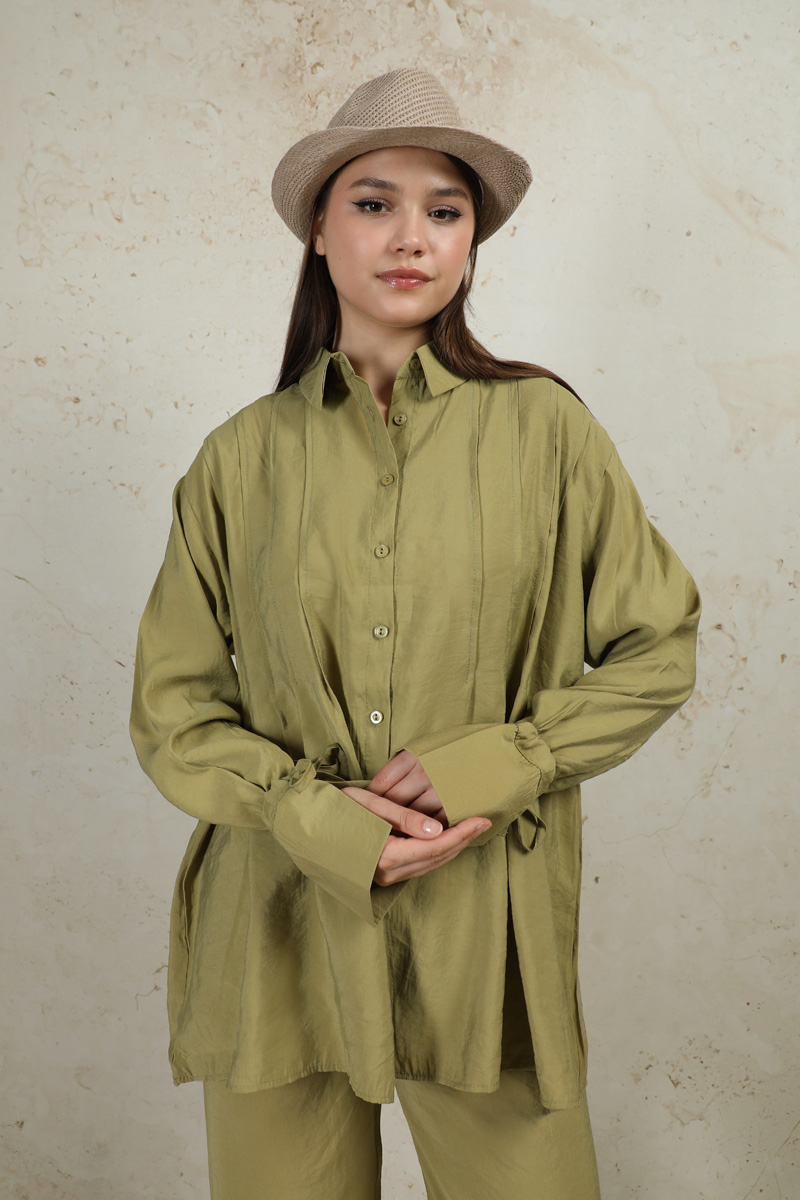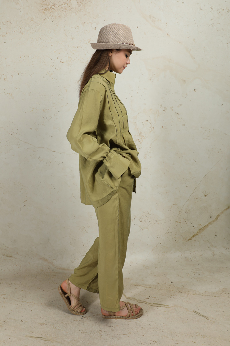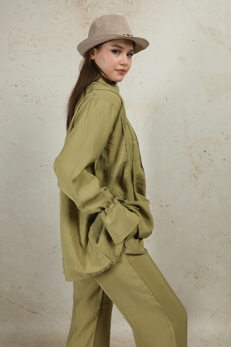 Nervürlü Gömlek Takım Yağ Yeşili. Gömlek yakalıdır. Önü düğmelidir. Ön bedende pile dikişleri mevcuttur. Manşeti ip ile büzülmelidir. Pantolon yandan ceplidir. Pantolon geniş paçadır. Arkada roba ve A pile vardır. Pantolon beli lastiklidir.