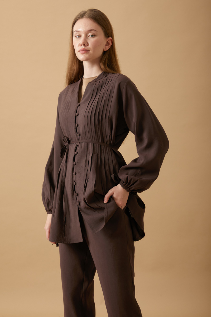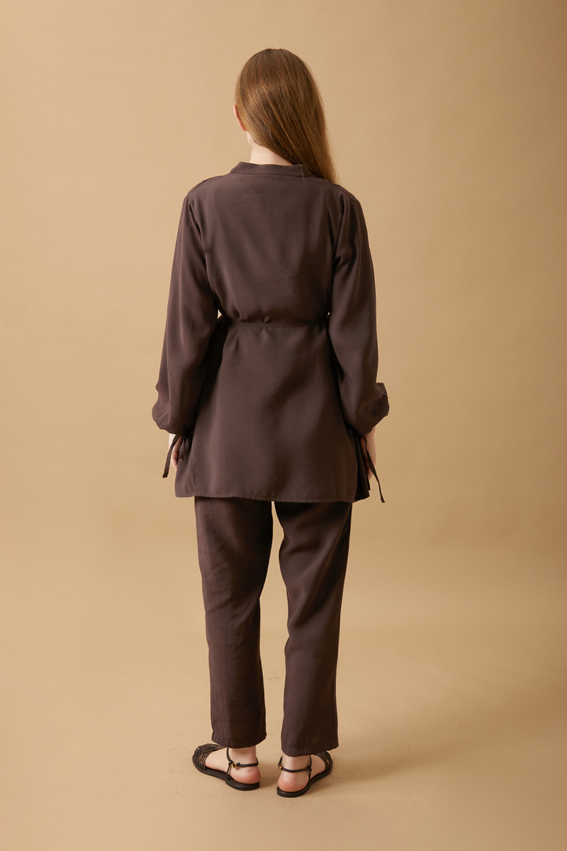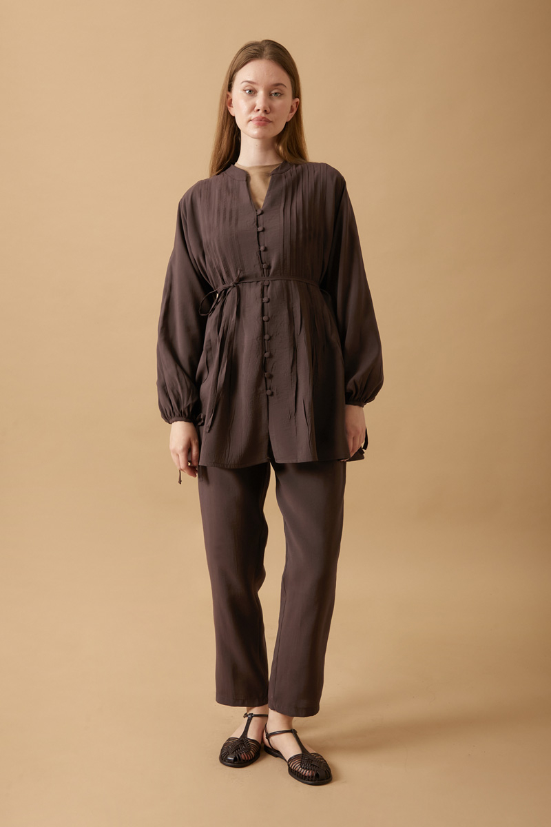 Nervürlü Pantolon Takım Kahverengi. Hakim yakadır, önden nervür detaylı olup düğmelidir, bilekleri büzgü detaylı olup bağlamalıdır, biye kuşaklıdır. Pantalon bol paçadır, belden lastiklidir, yandan ceplidir, Günlük kullanım ve özel günlerinizde tercih edebilirsiniz.