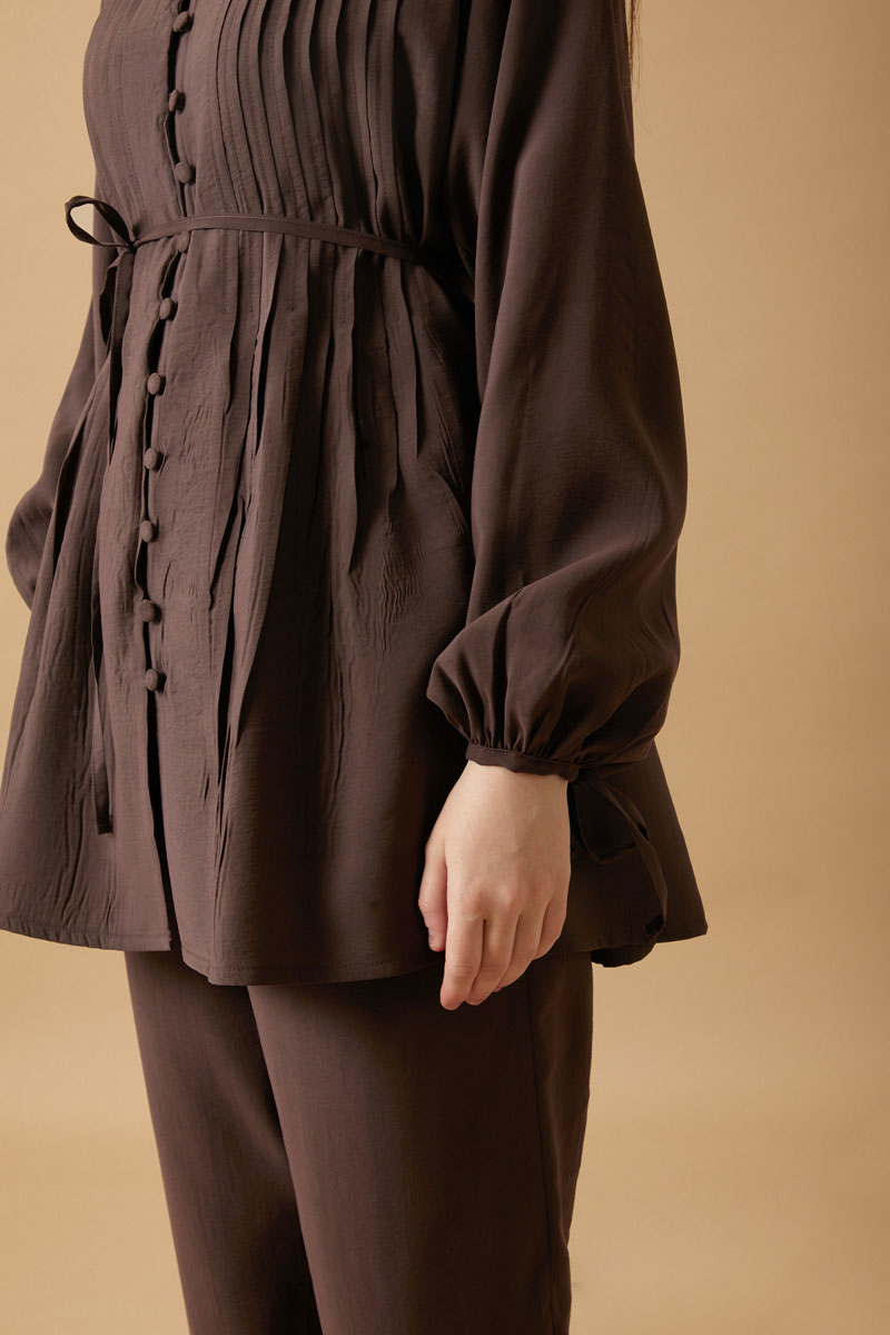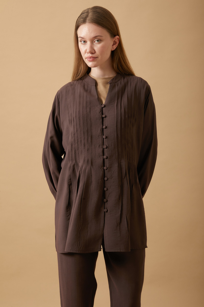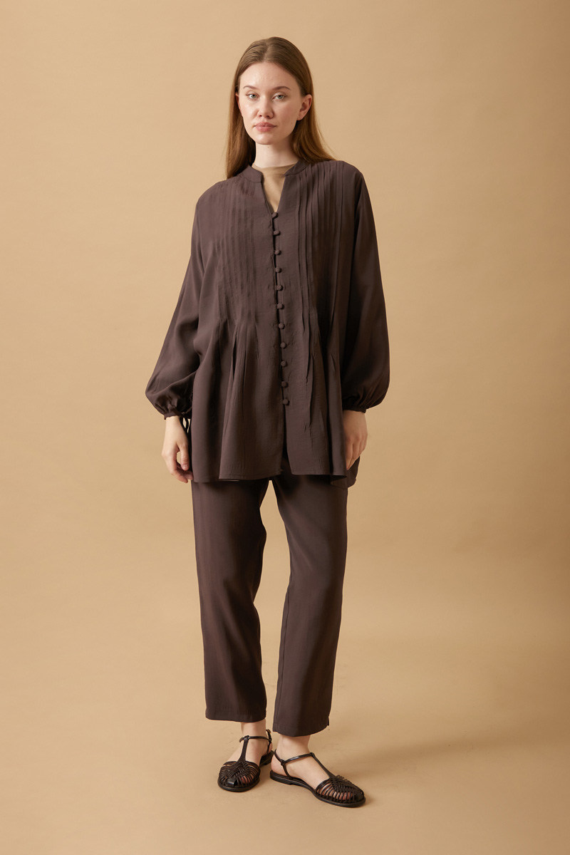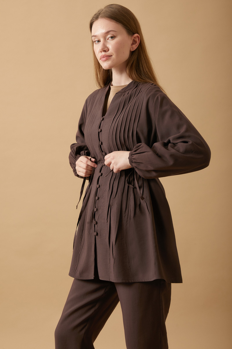 Nervürlü Pantolon Takım Kahverengi. Hakim yakadır, önden nervür detaylı olup düğmelidir, bilekleri büzgü detaylı olup bağlamalıdır, biye kuşaklıdır. Pantalon bol paçadır, belden lastiklidir, yandan ceplidir, Günlük kullanım ve özel günlerinizde tercih edebilirsiniz.