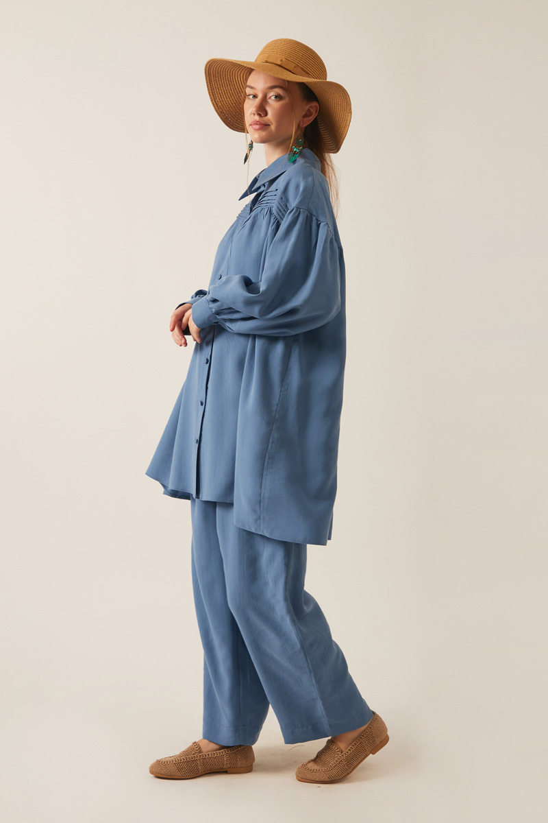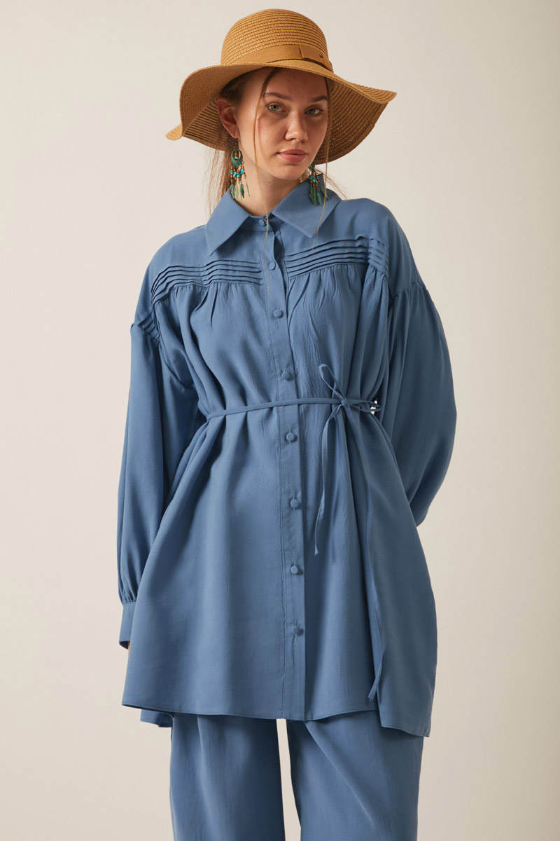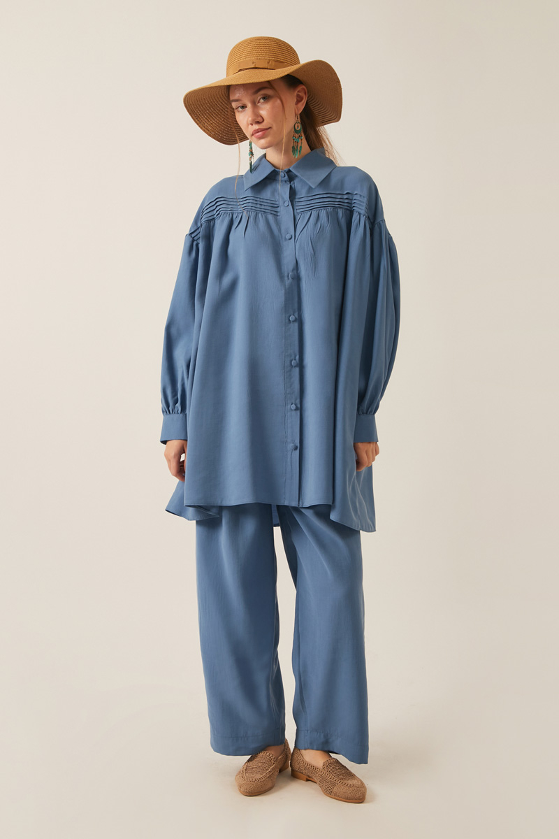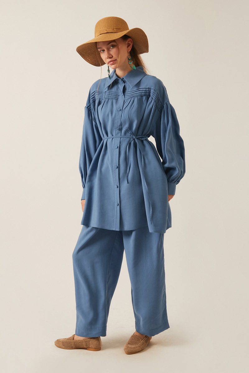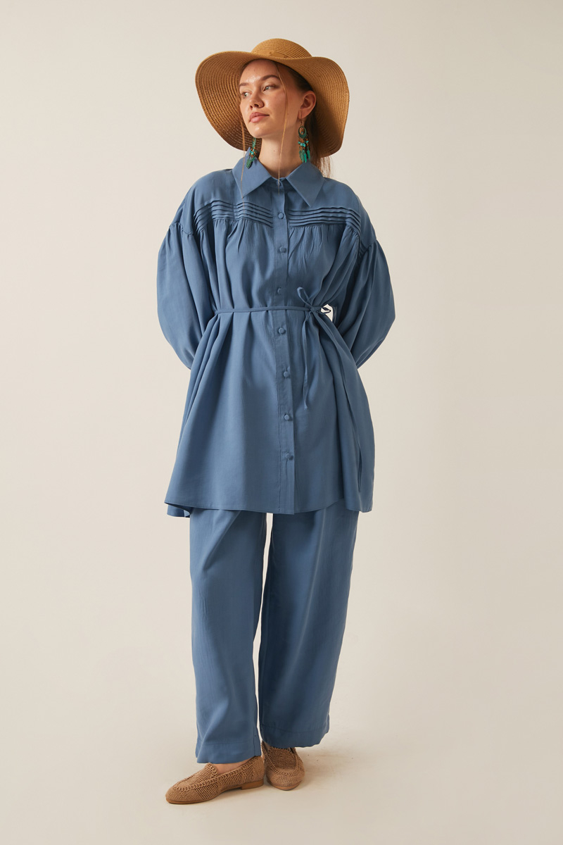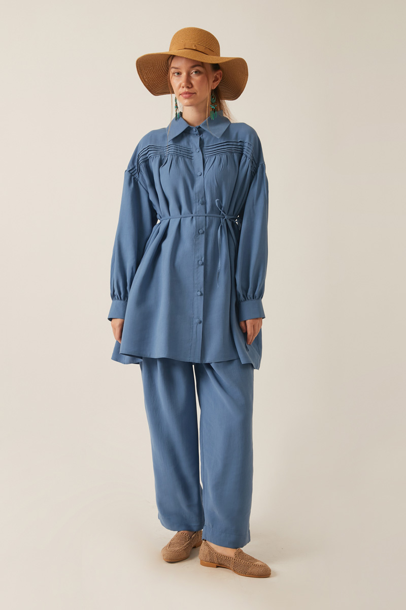Nervürlü Tensel Takım İndigo. Gömlek yakadır, önden nervür ve büzgü detaylıdır, düşük kolludur, biye kuşaklıdır. Pantolon arka belden lastiklidir, önden pilelidir, yandan ceplidir, düğmeli ve fermuarlıdır. Günlük kullanım ve özel günlerinizde tercih edebilirsiniz.