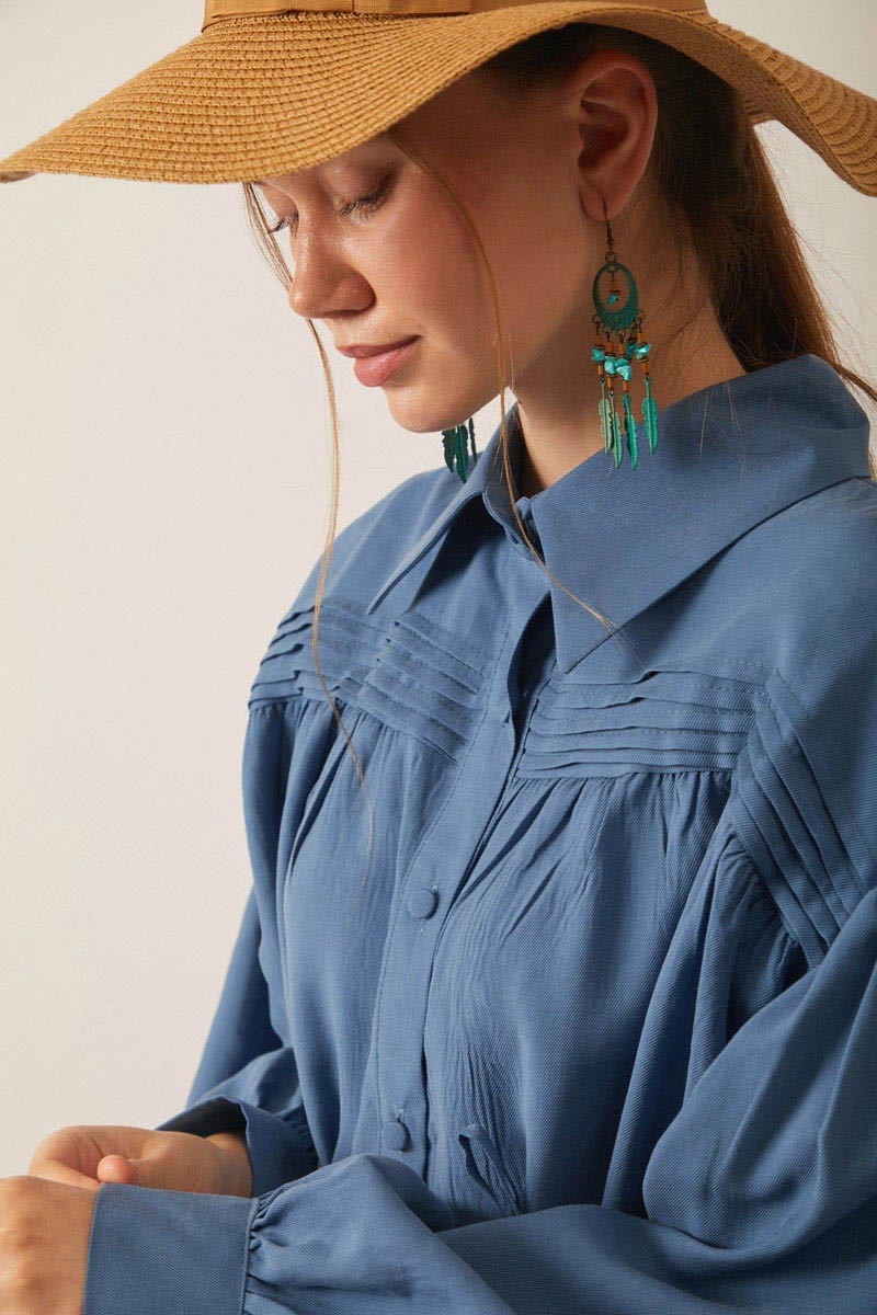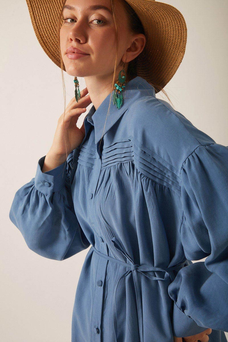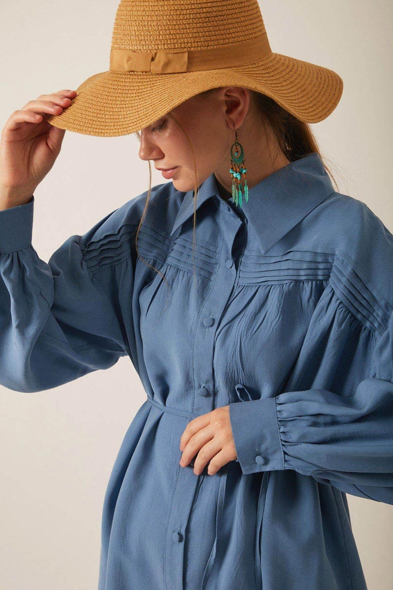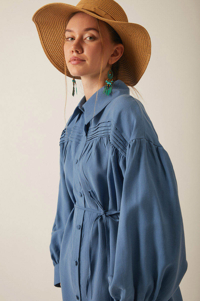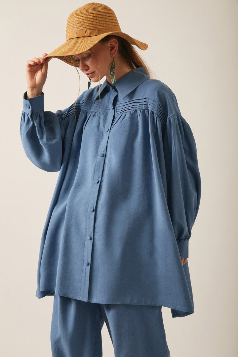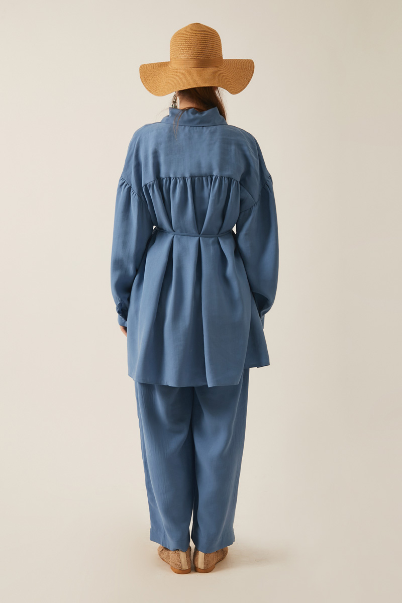 Nervürlü Tensel Takım İndigo. Gömlek yakadır, önden nervür ve büzgü detaylıdır, düşük kolludur, biye kuşaklıdır. Pantolon arka belden lastiklidir, önden pilelidir, yandan ceplidir, düğmeli ve fermuarlıdır. Günlük kullanım ve özel günlerinizde tercih edebilirsiniz.