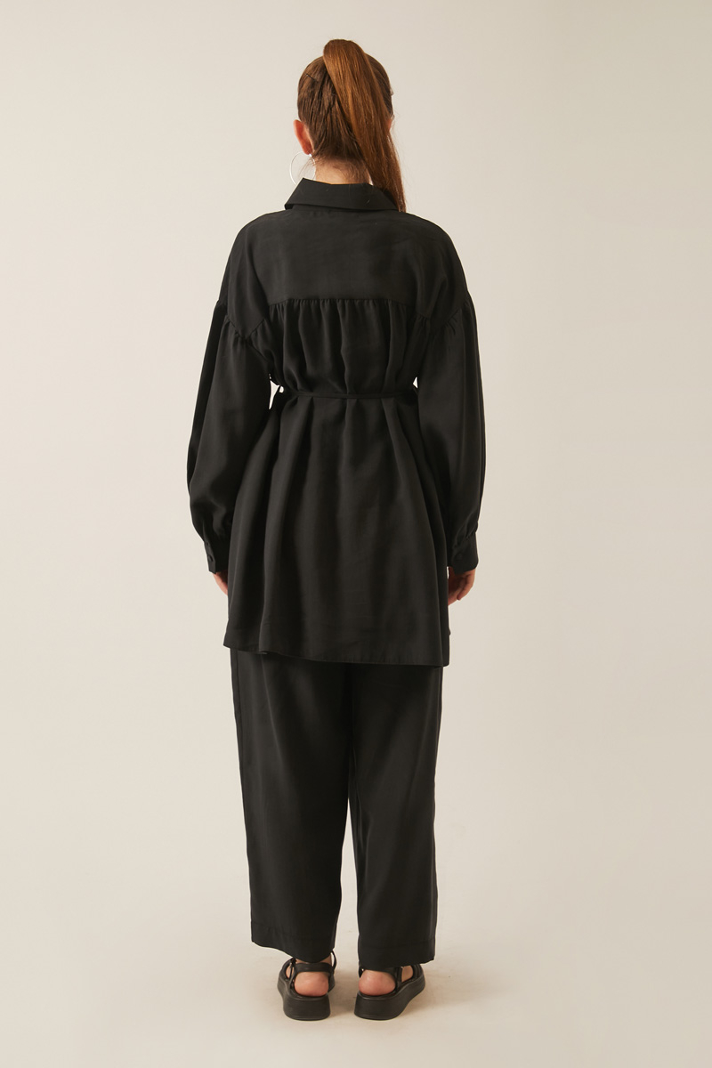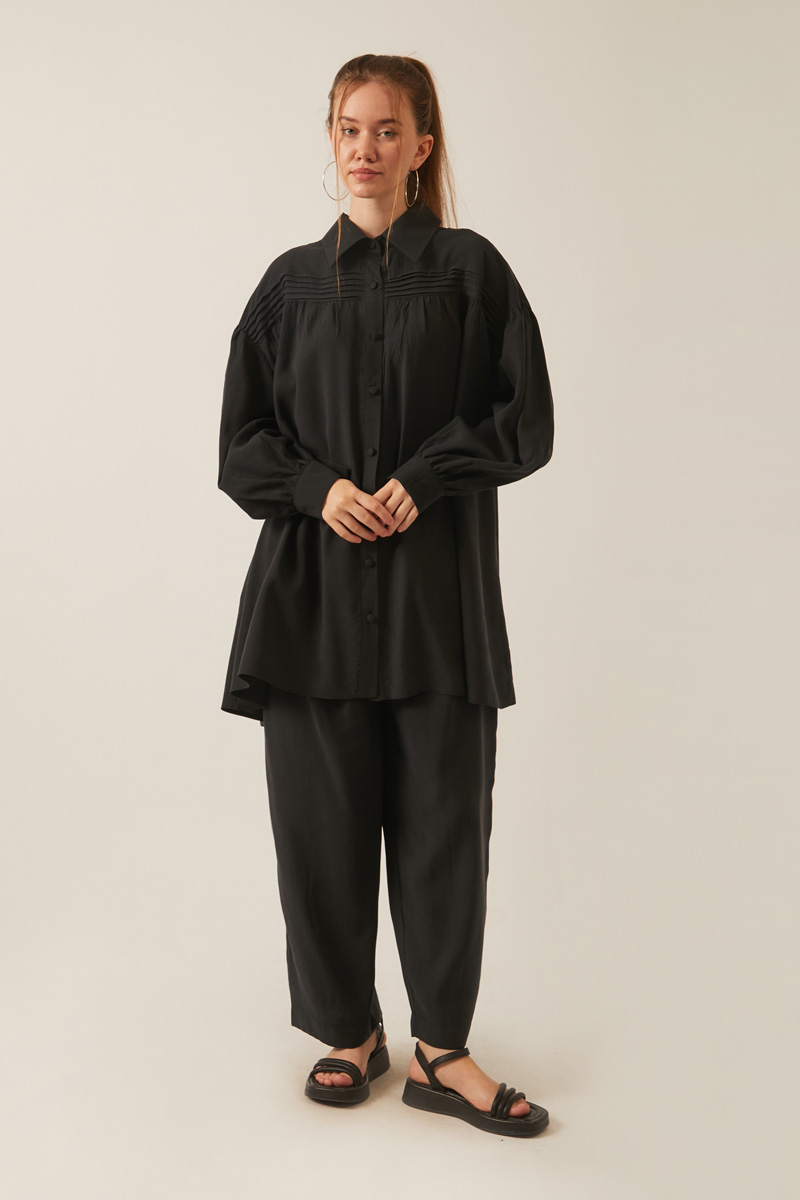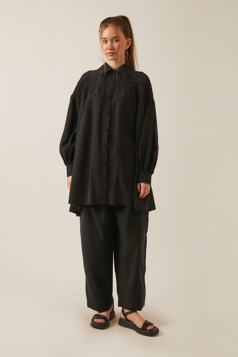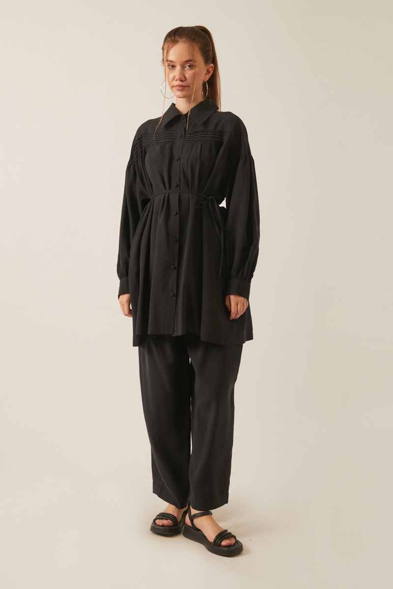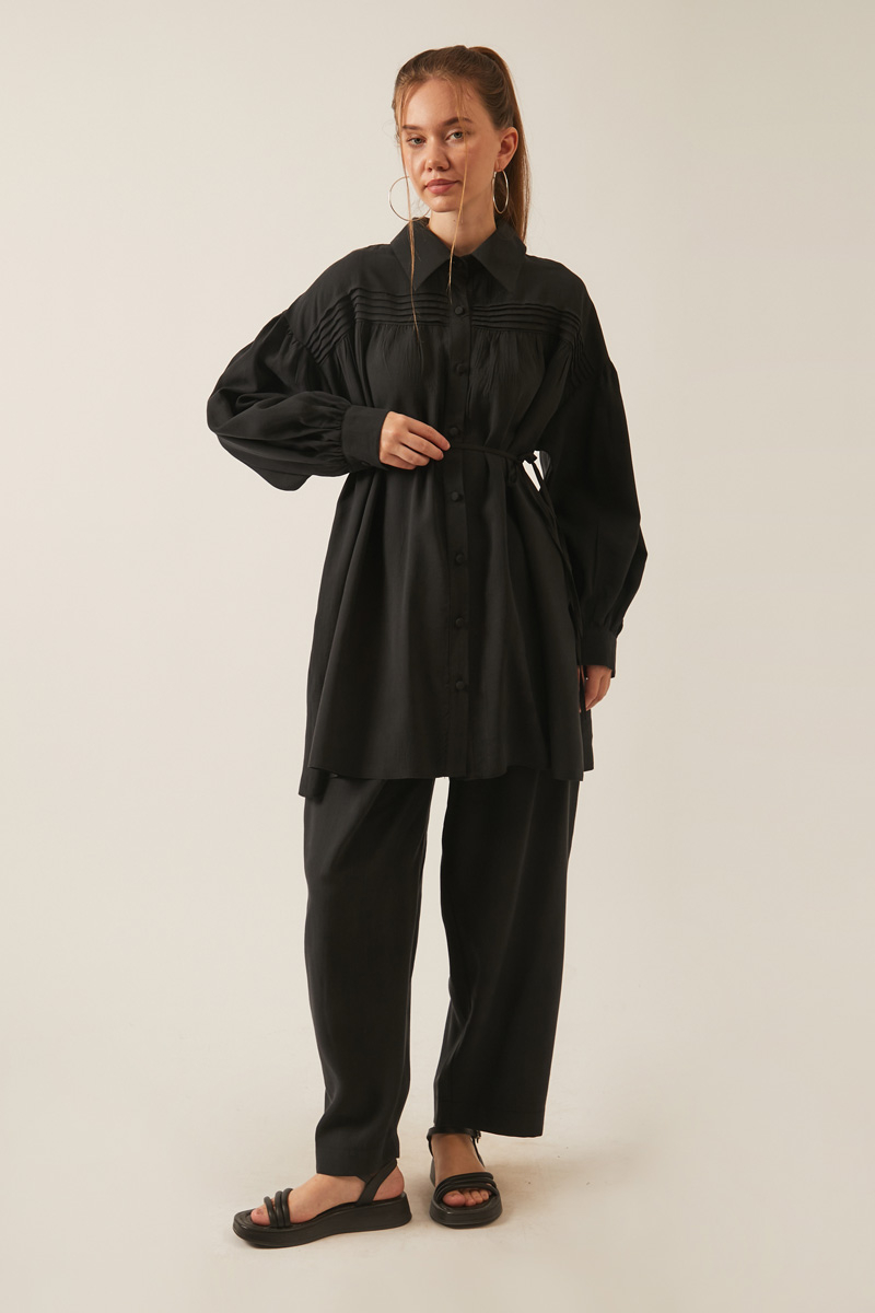 Nervürlü Tensel Takım Siyah. Gömlek yakadır, önden nervür ve büzgü detaylıdır, düşük kolludur, biye kuşaklıdır. Pantolon arka belden lastiklidir, önden pilelidir, yandan ceplidir, düğmeli ve fermuarlıdır. Günlük kullanım ve özel günlerinizde tercih edebilirsiniz.