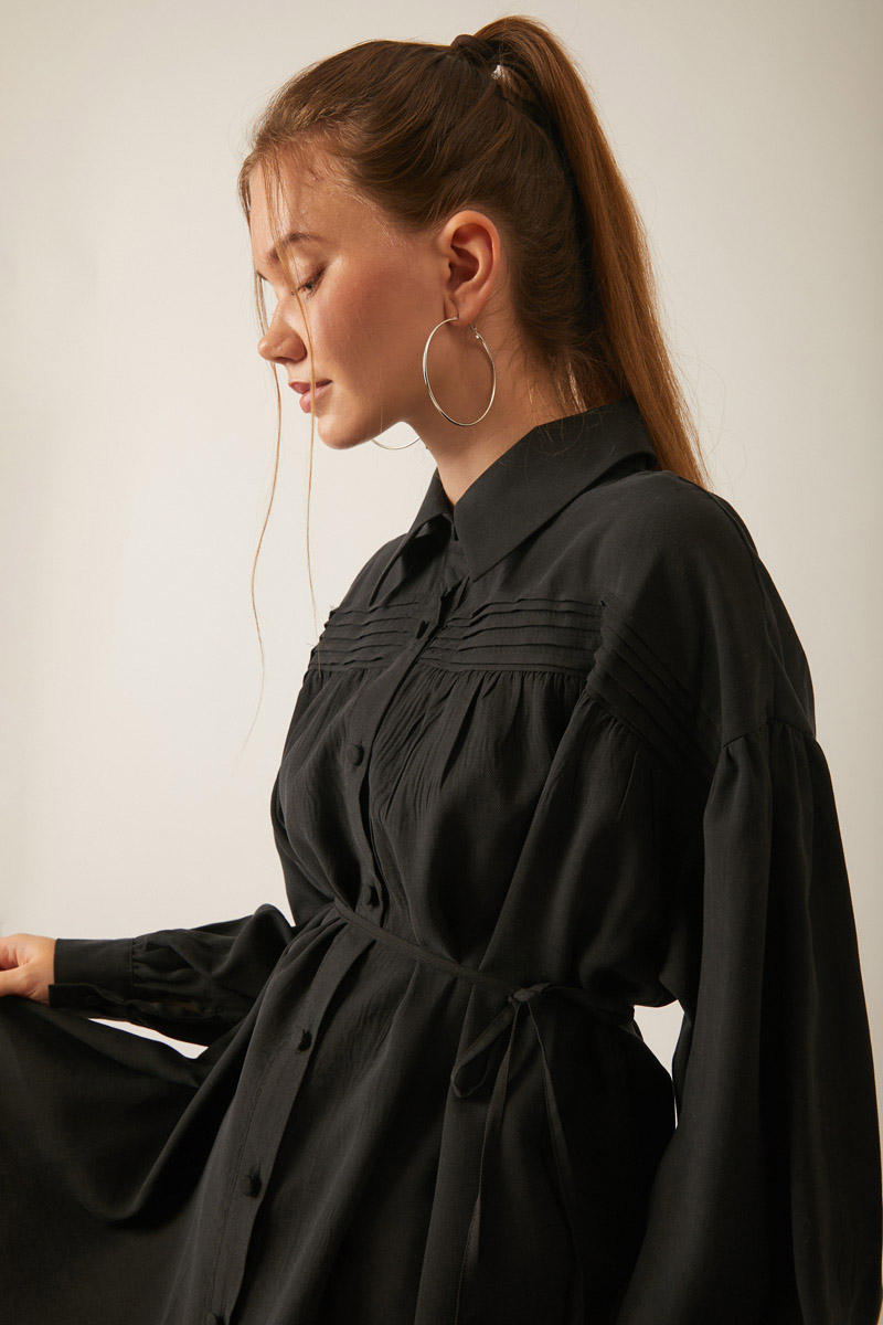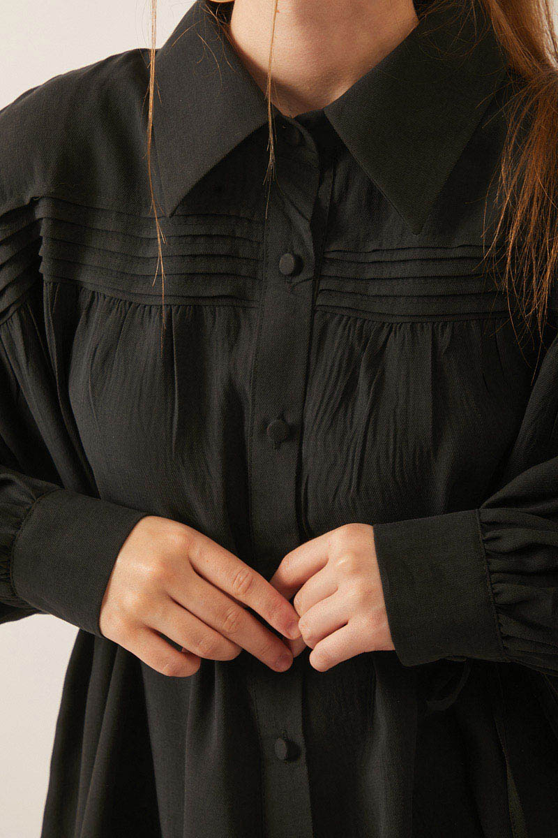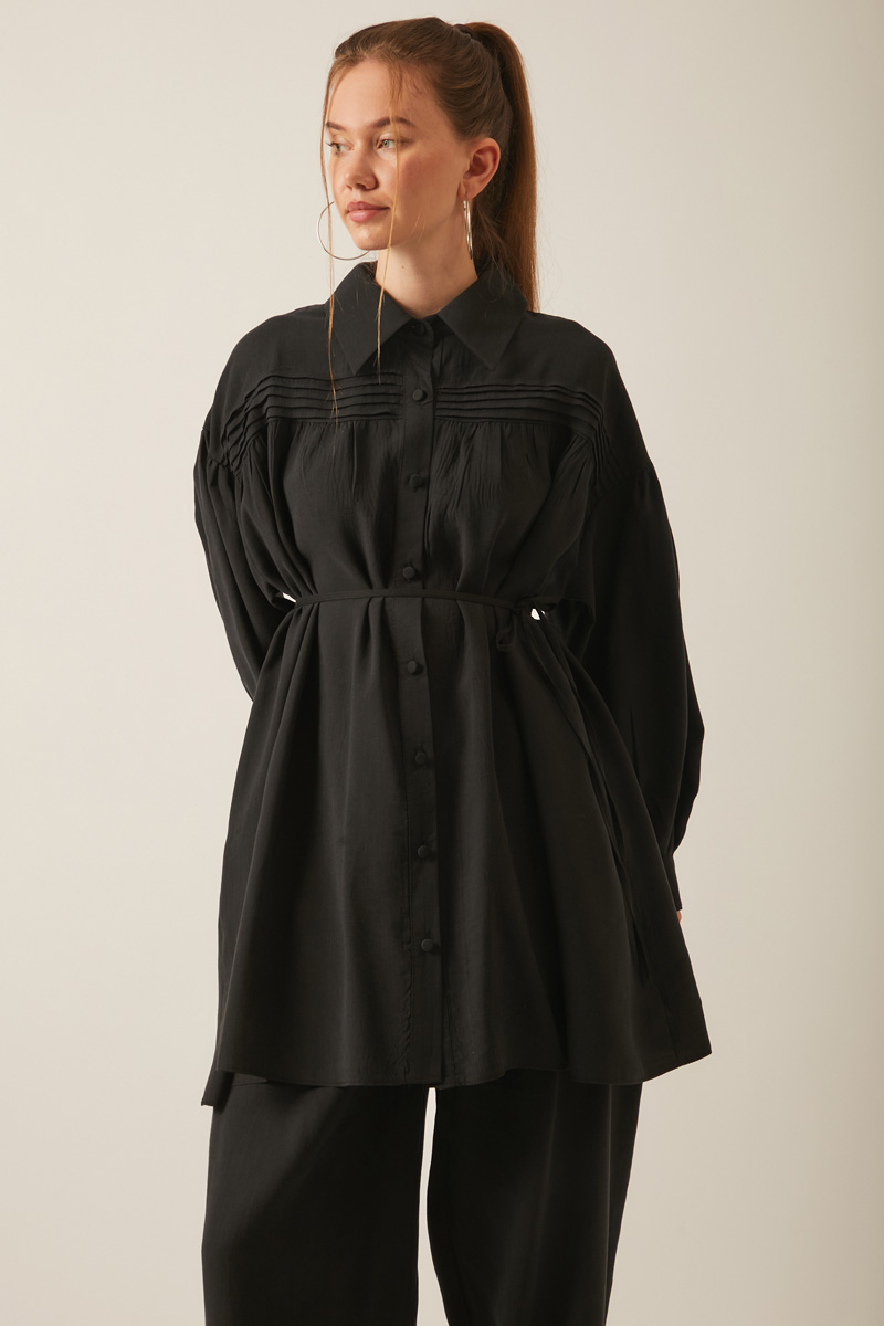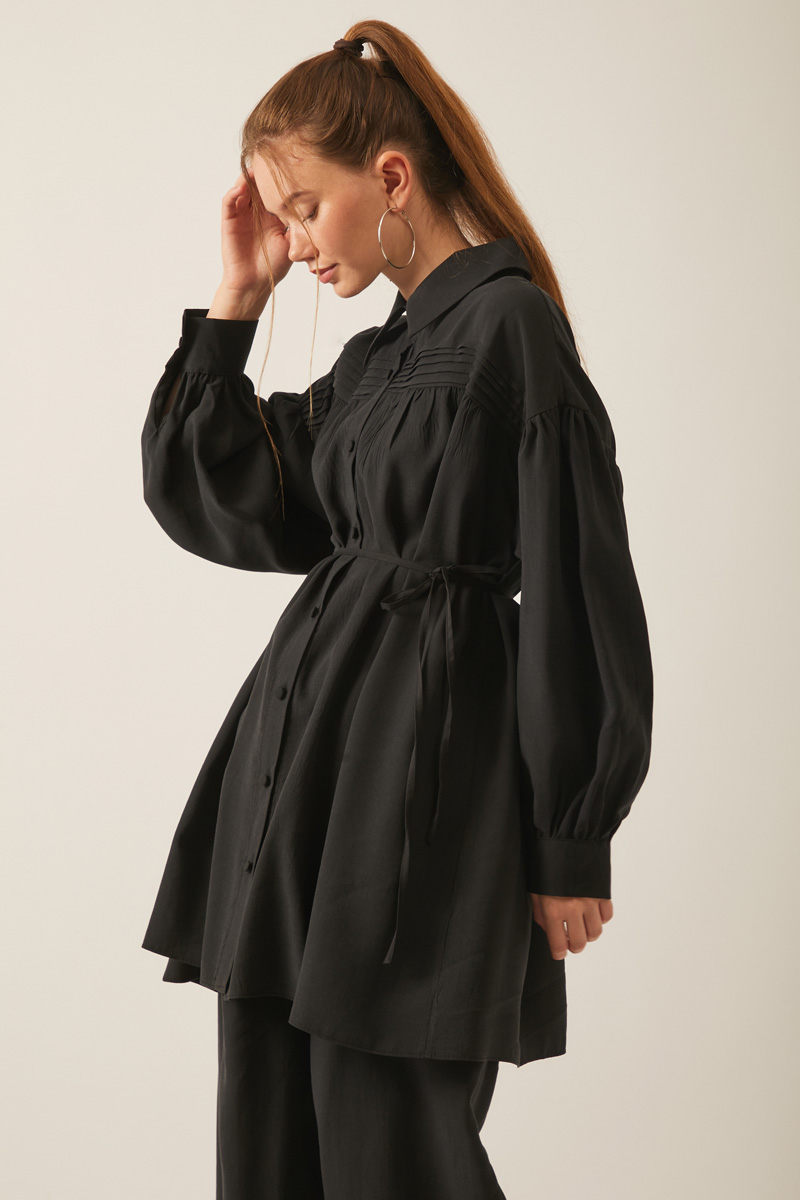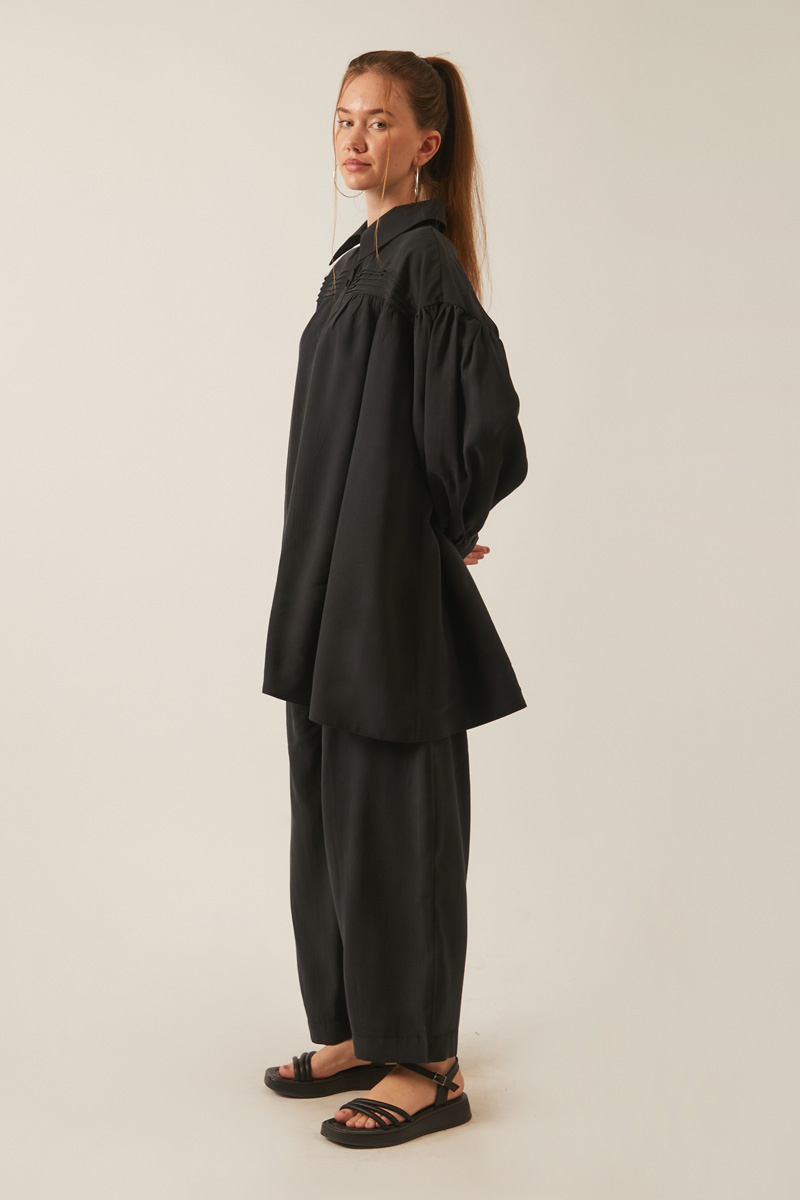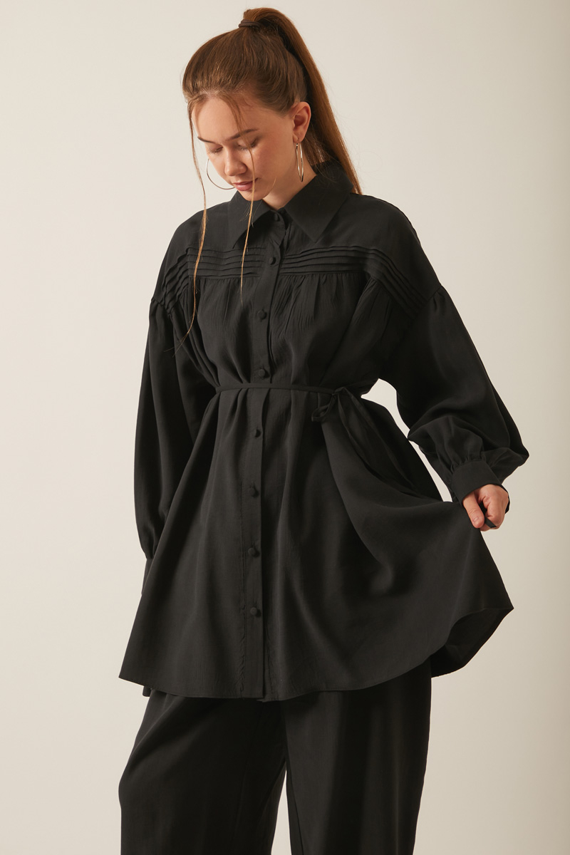 Nervürlü Tensel Takım Siyah. Gömlek yakadır, önden nervür ve büzgü detaylıdır, düşük kolludur, biye kuşaklıdır. Pantolon arka belden lastiklidir, önden pilelidir, yandan ceplidir, düğmeli ve fermuarlıdır. Günlük kullanım ve özel günlerinizde tercih edebilirsiniz.