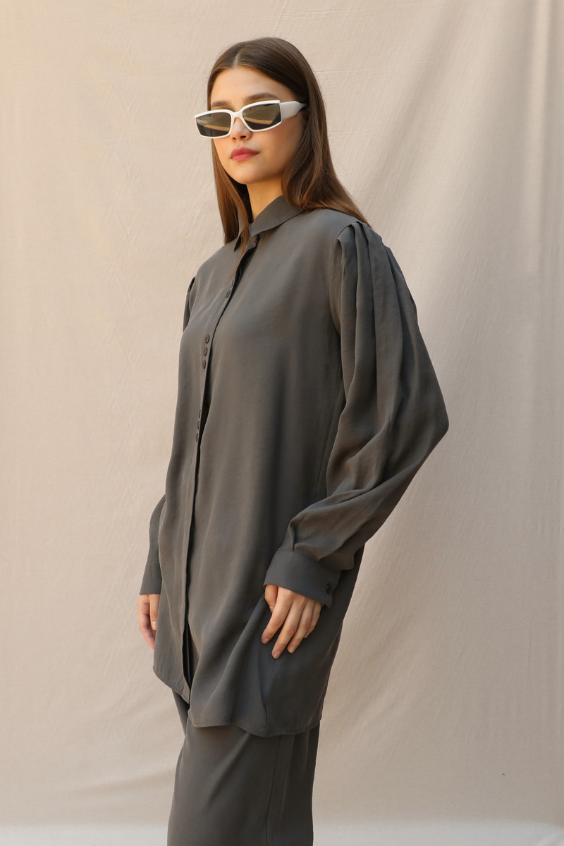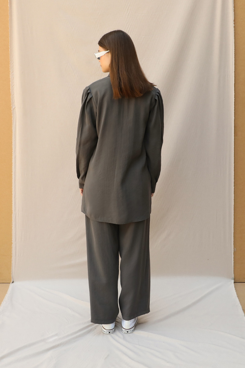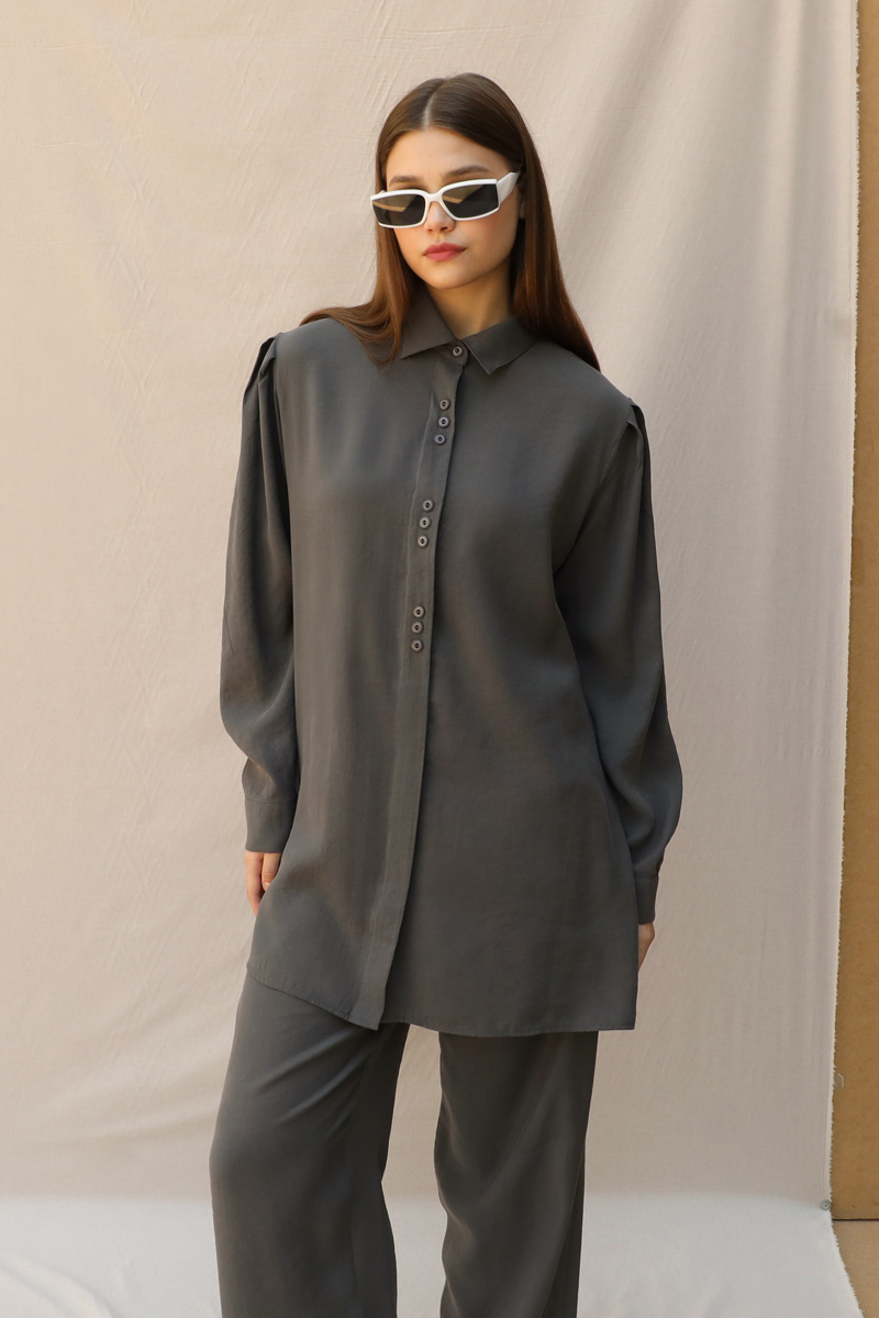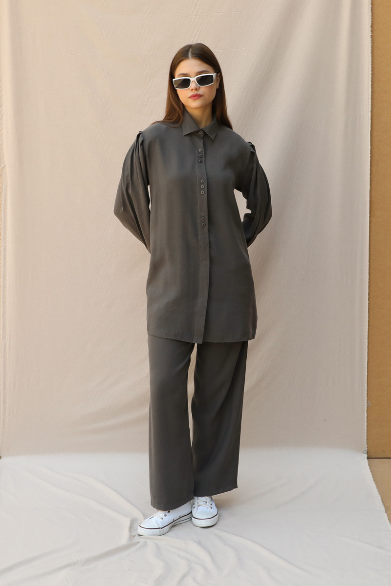 Omuzu Pileli Gömlek Takım Füme. Kolları büzgülüdür. Gömlek yakalıdır. Omuzdan büzgü detaylıdır. Gizli düğmelidir ve ayrı olarak önünde süs düğmeleri mevcuttur. Pantolon beli lastiklidir, bol paçadır. Yaz ve bahar mevsimlerinde tercih edebilirsiniz.