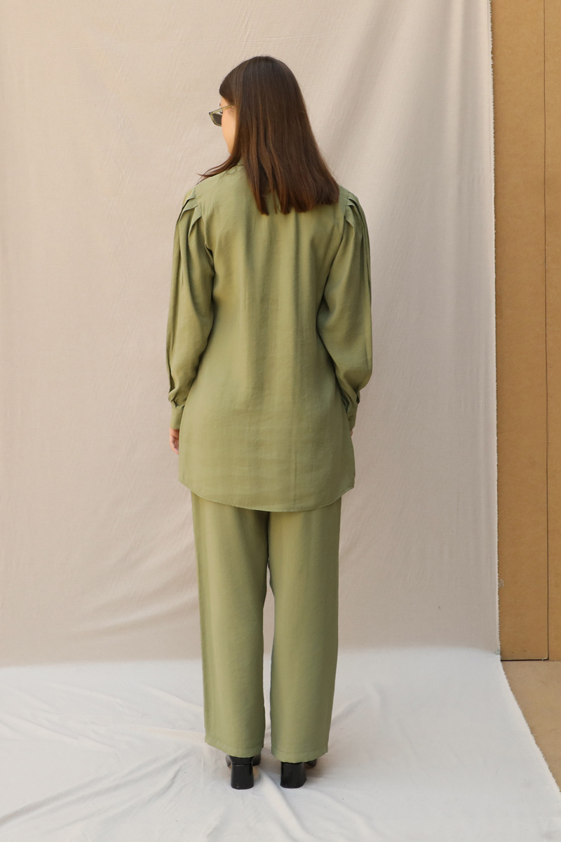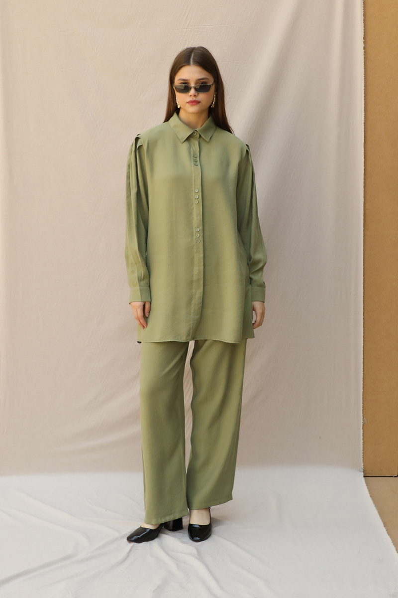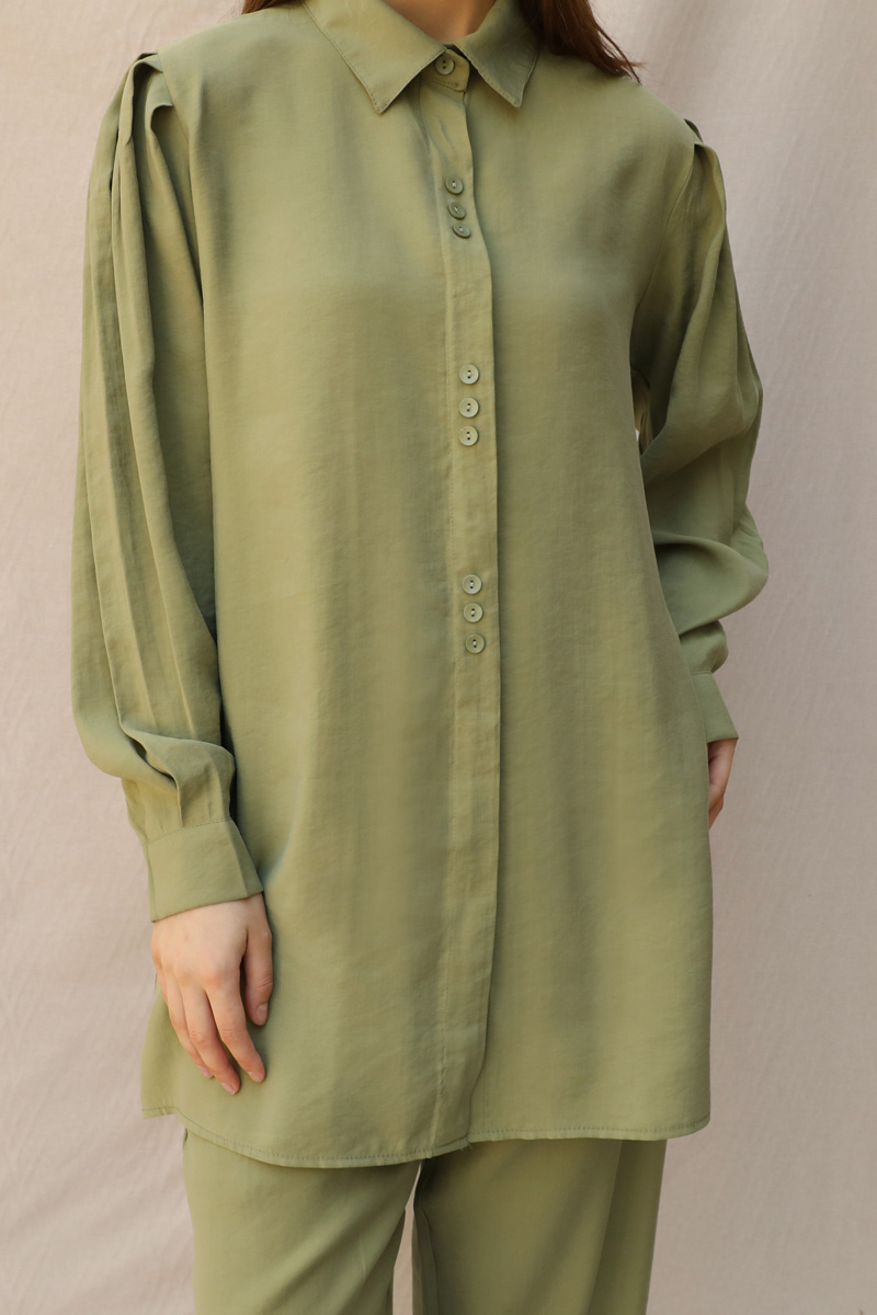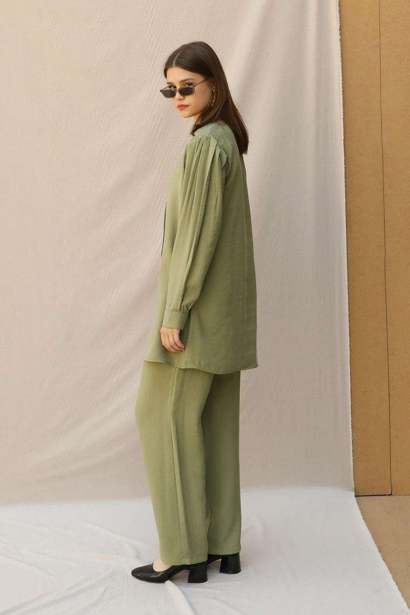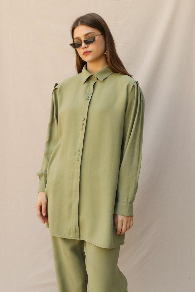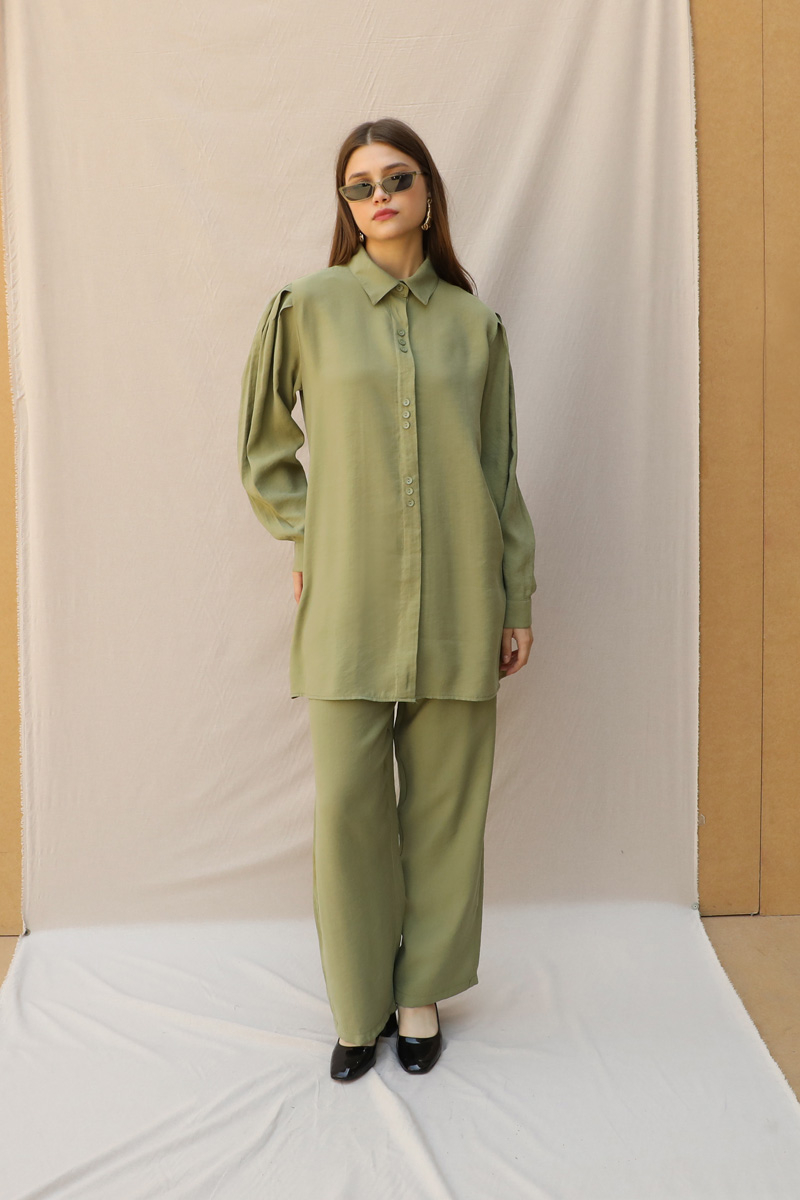 Omuzu Pileli Gömlek Takım Yağ Yeşili