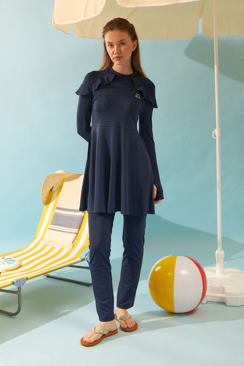 Omzu Fırfırlı Tesettür Mayo Takım Lacivert