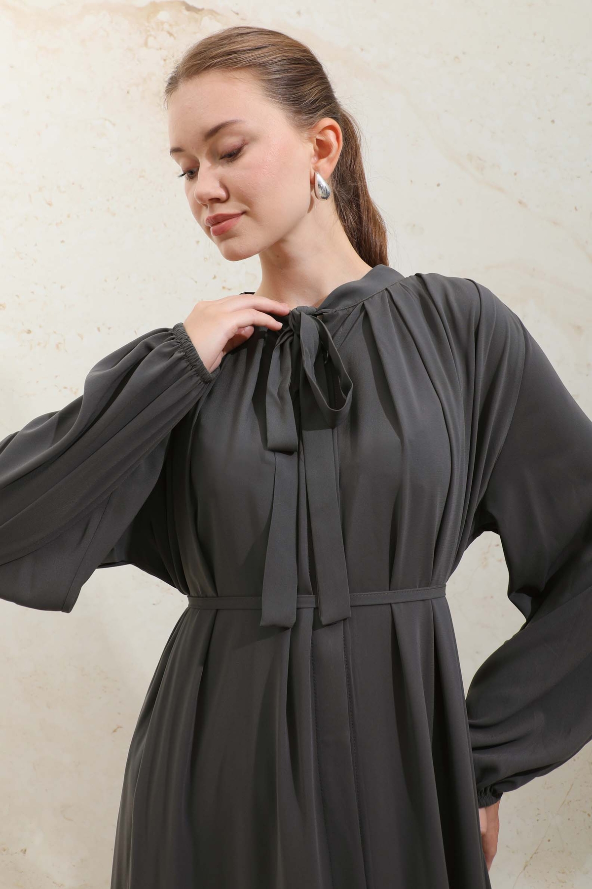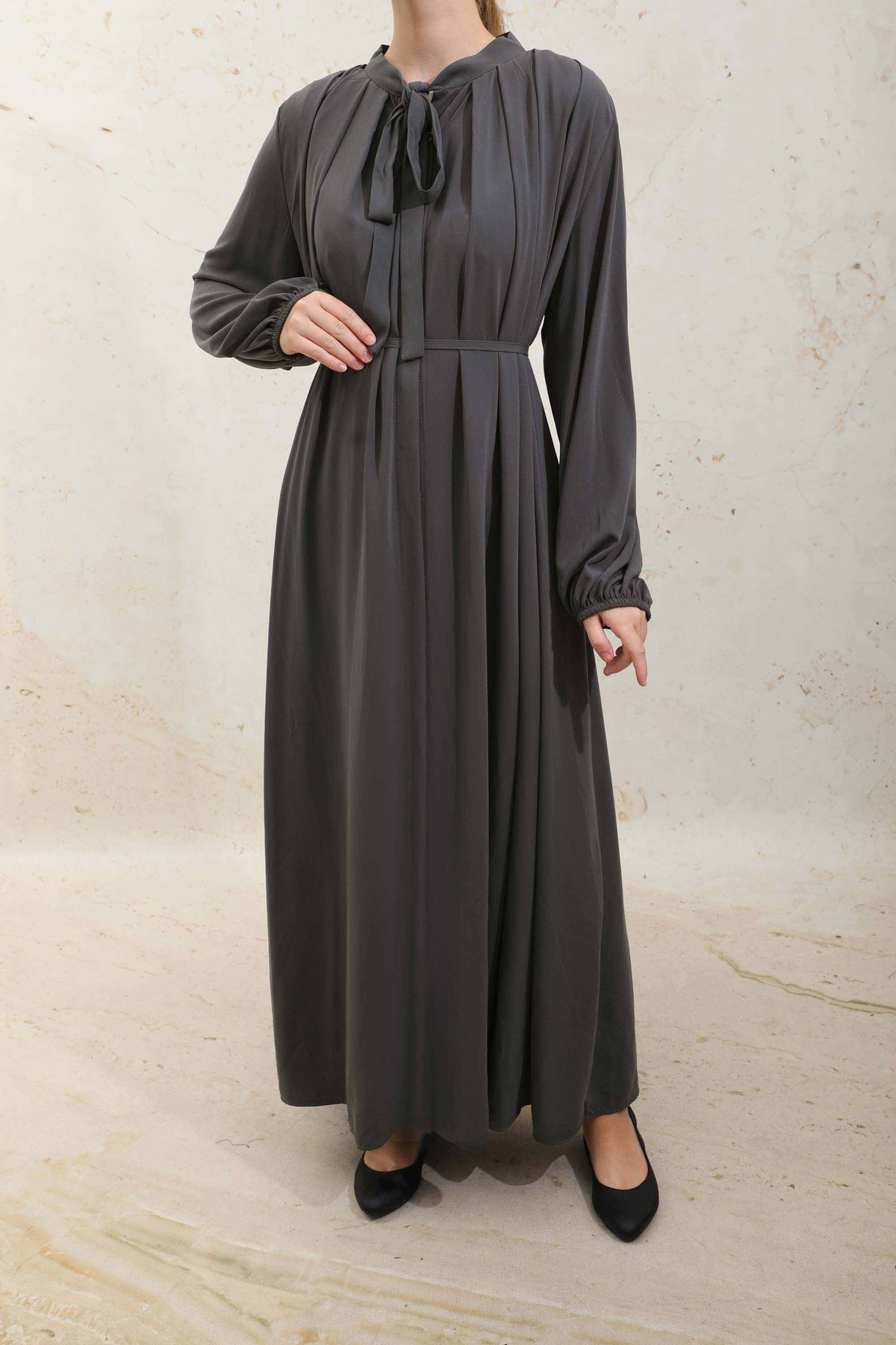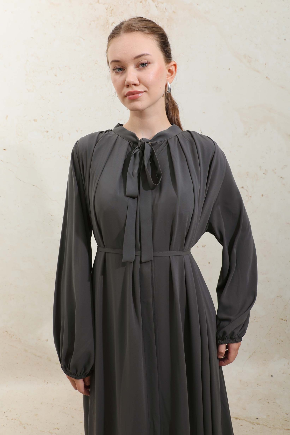 Omzu Pileli Fularlı Elbise Füme.Yakadan omuza doğru kalın pilelidir bu sayede dökümlü bir görünümü vardır. Yakadan fularlı, biye kuşaklı, yandan gizli cepli, önden gizli düğmeli, astarsız, manşeti lastiklidir. Günlük ve şık olarak kombinleyebilirsiniz.