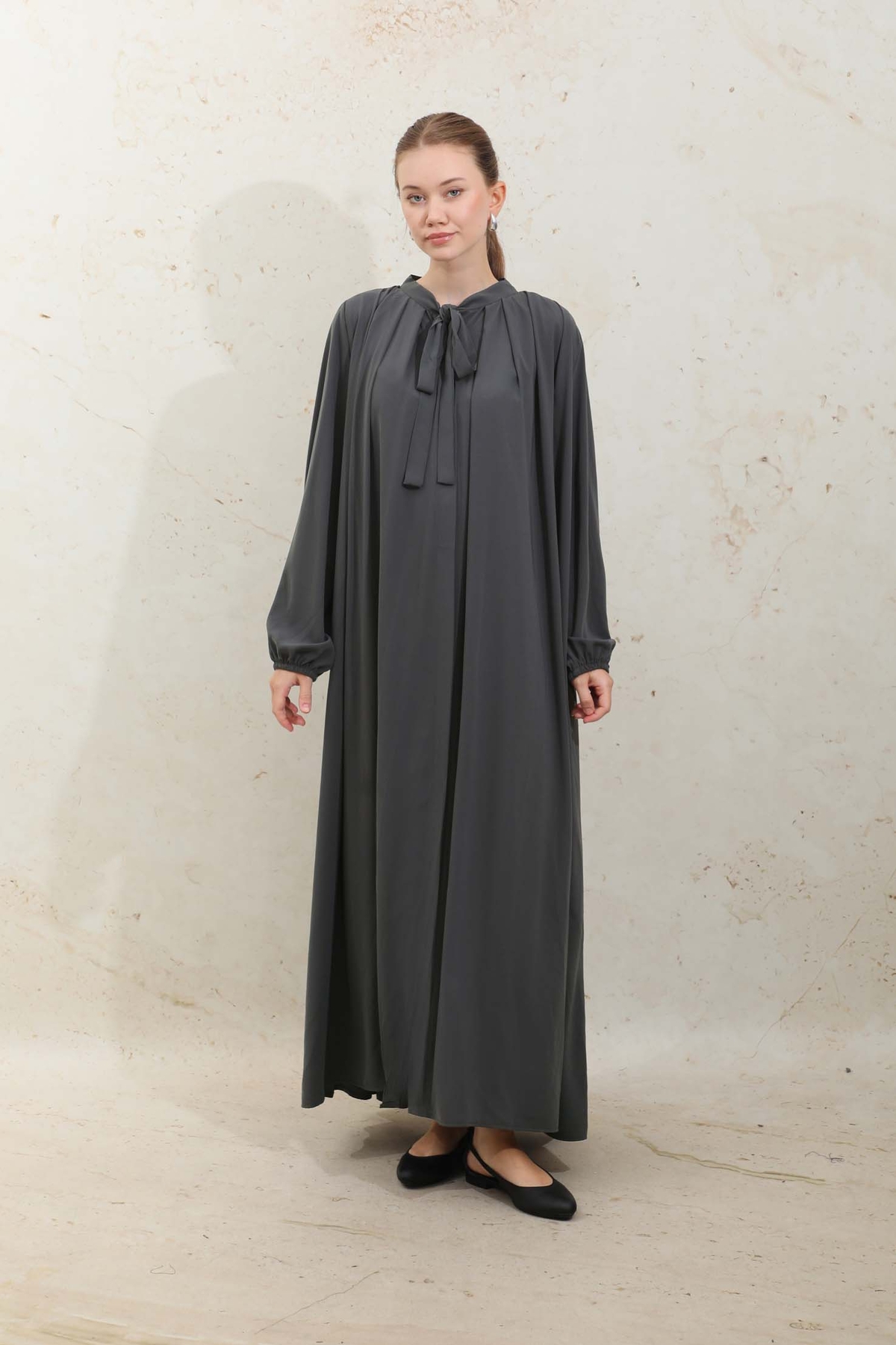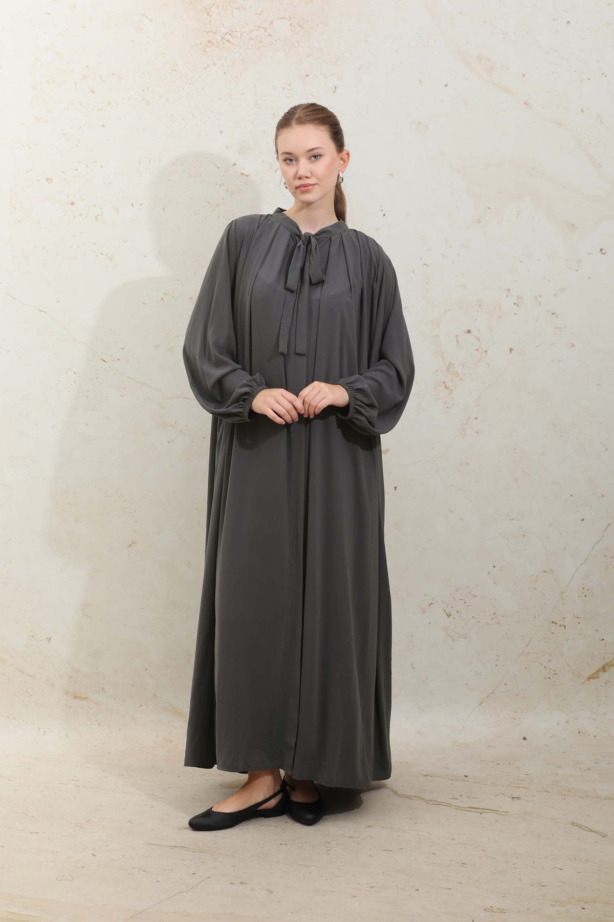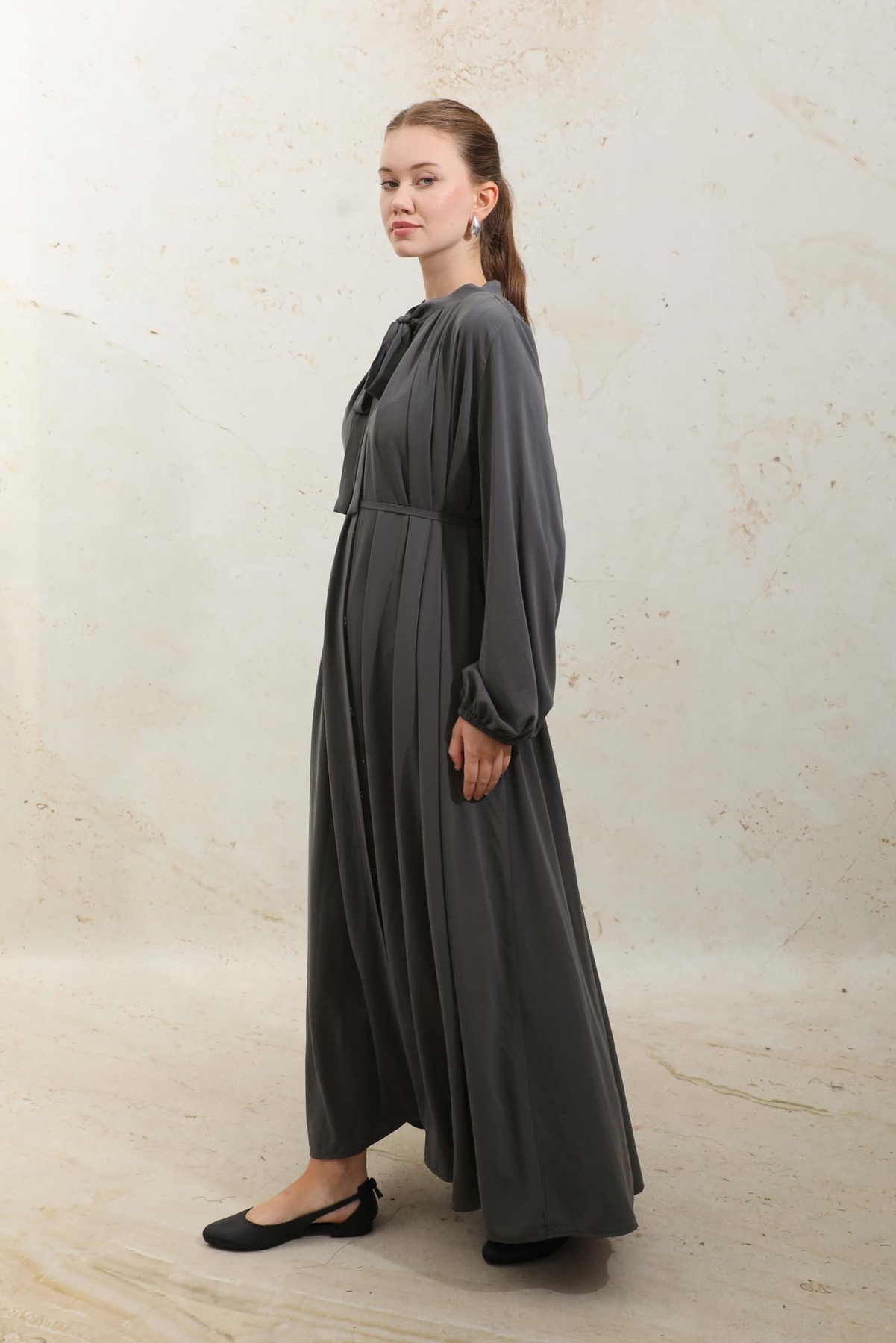 Omzu Pileli Fularlı Elbise Füme.Yakadan omuza doğru kalın pilelidir bu sayede dökümlü bir görünümü vardır. Yakadan fularlı, biye kuşaklı, yandan gizli cepli, önden gizli düğmeli, astarsız, manşeti lastiklidir. Günlük ve şık olarak kombinleyebilirsiniz.