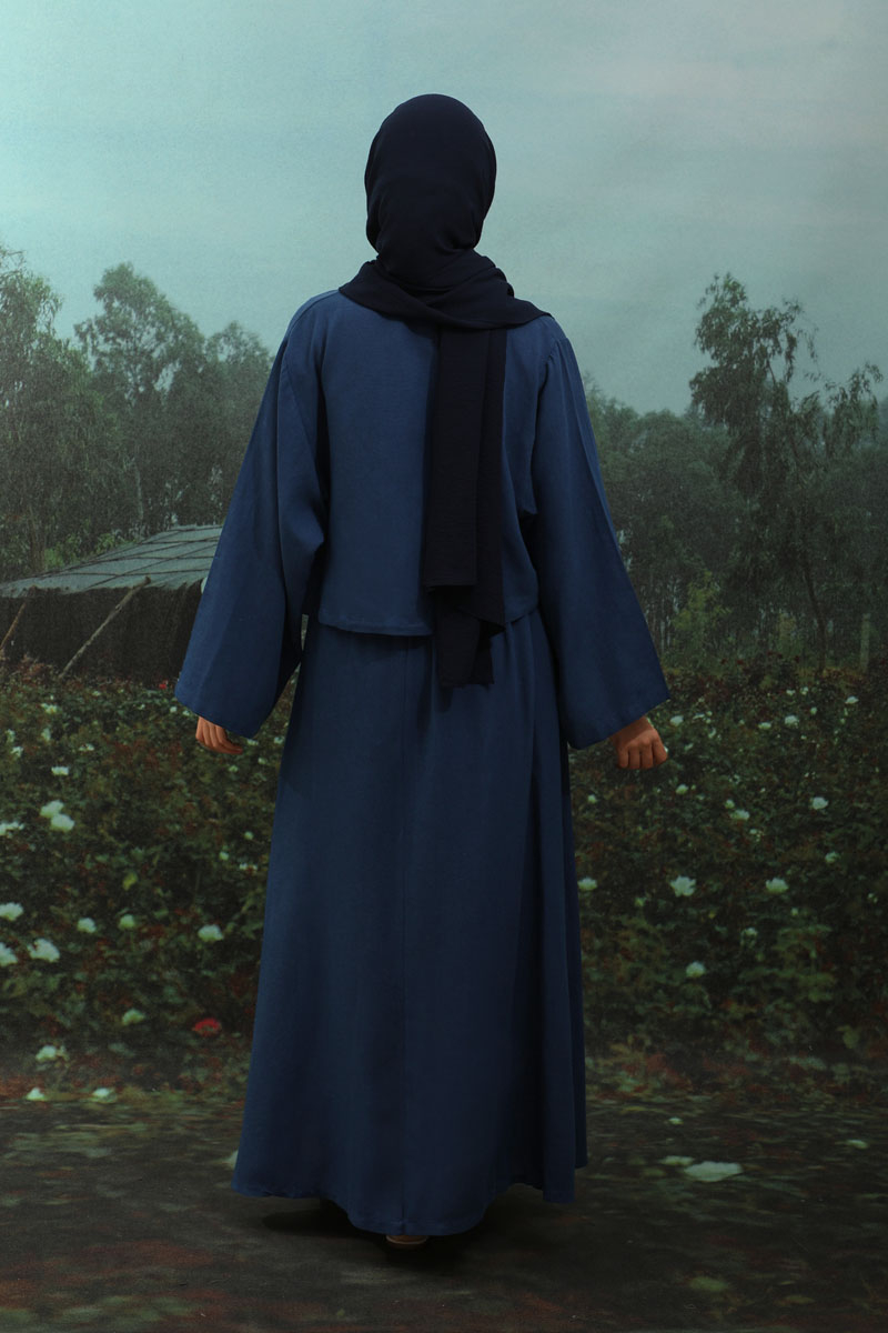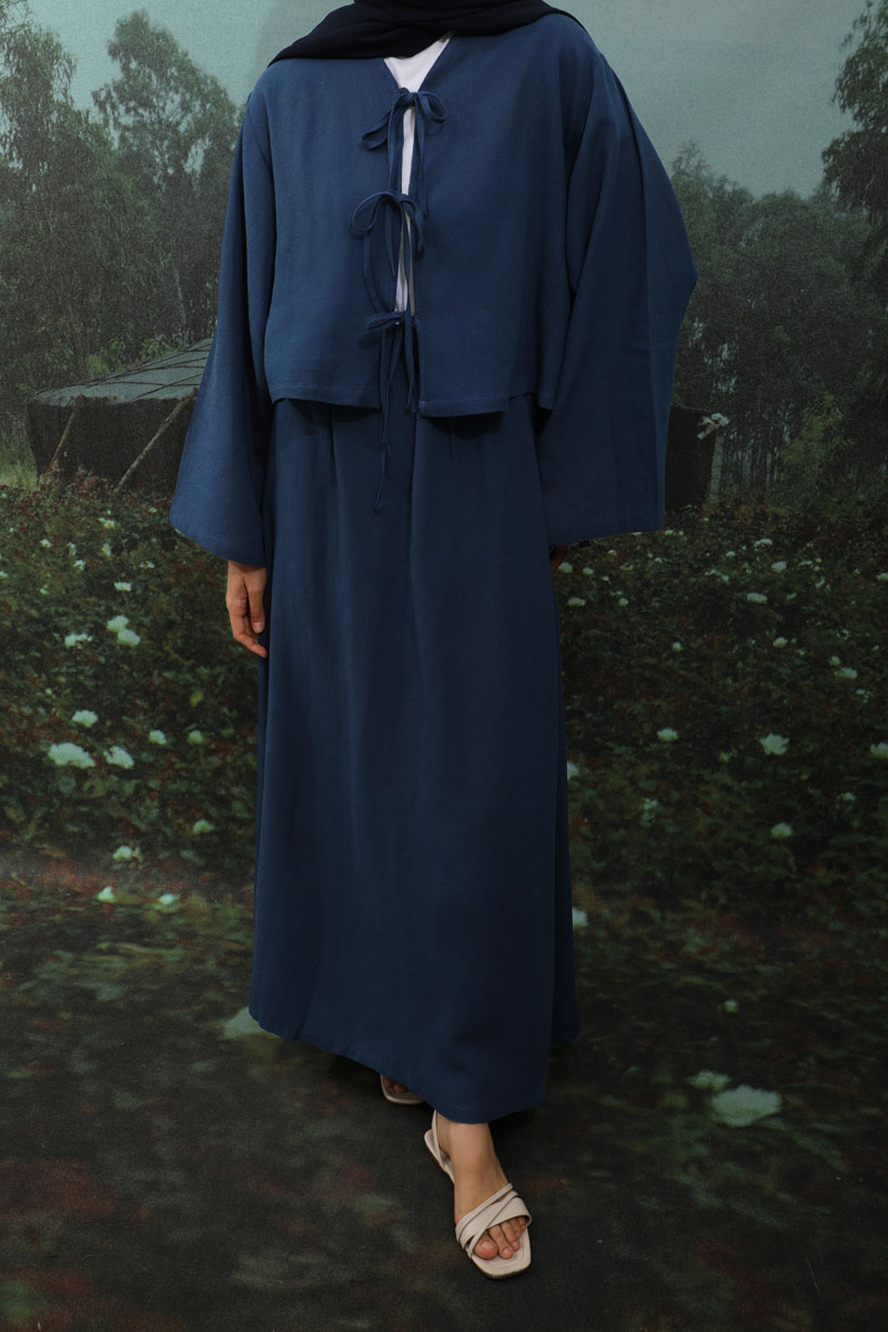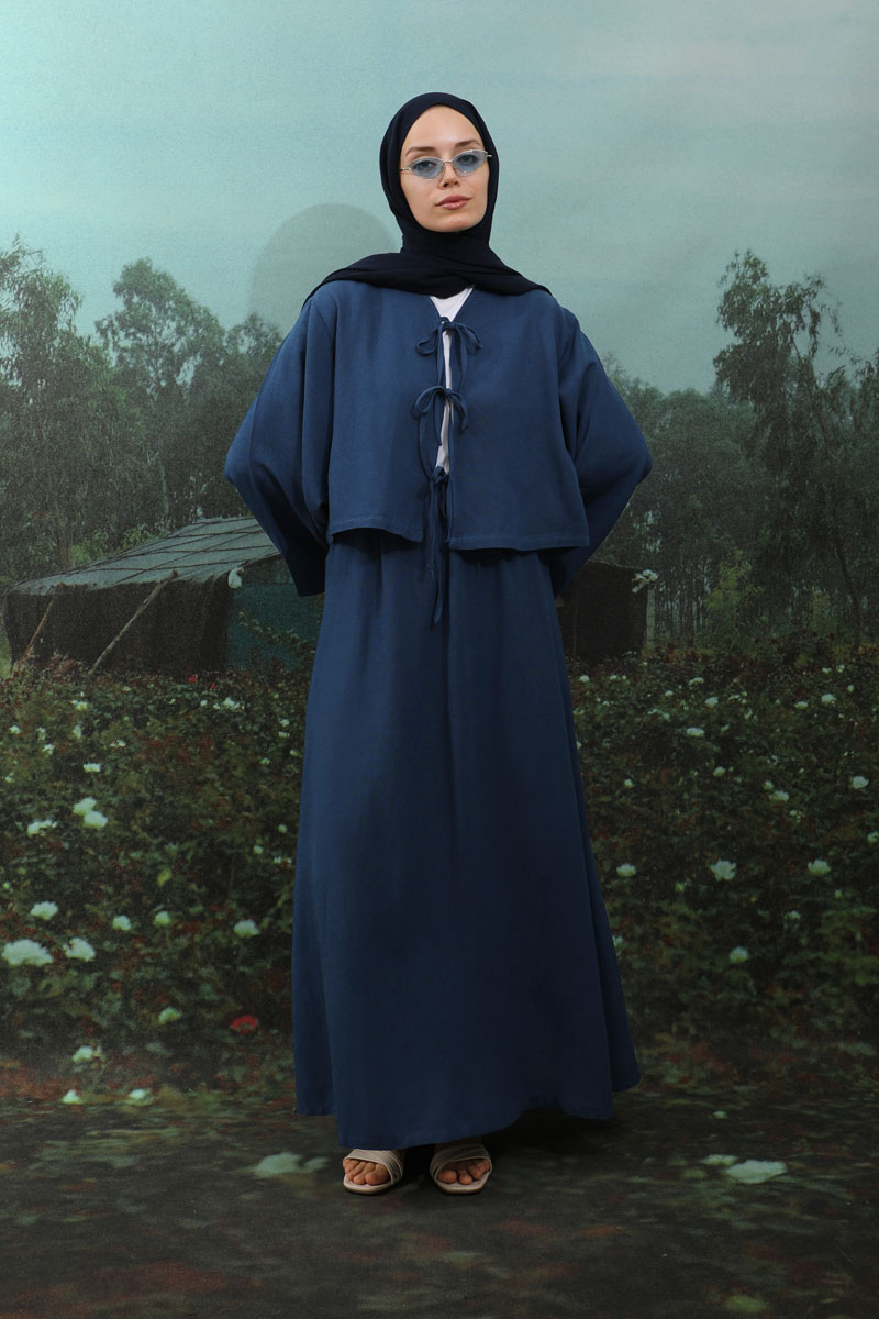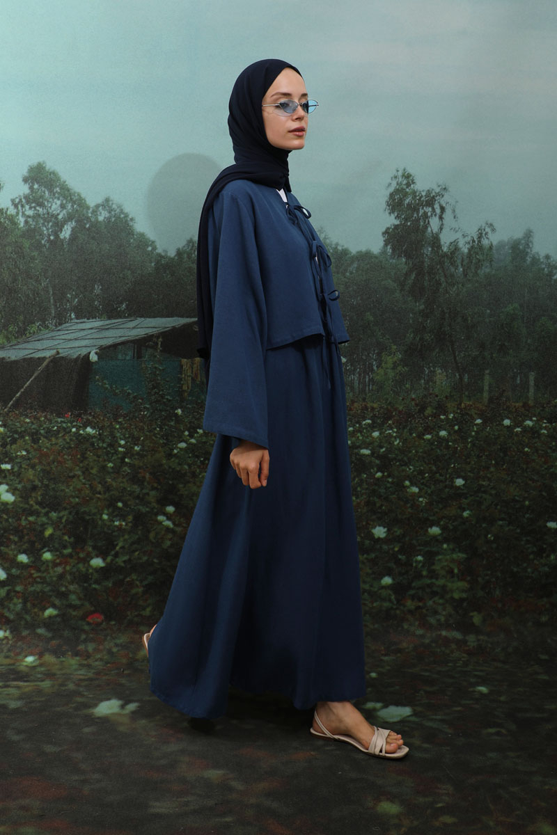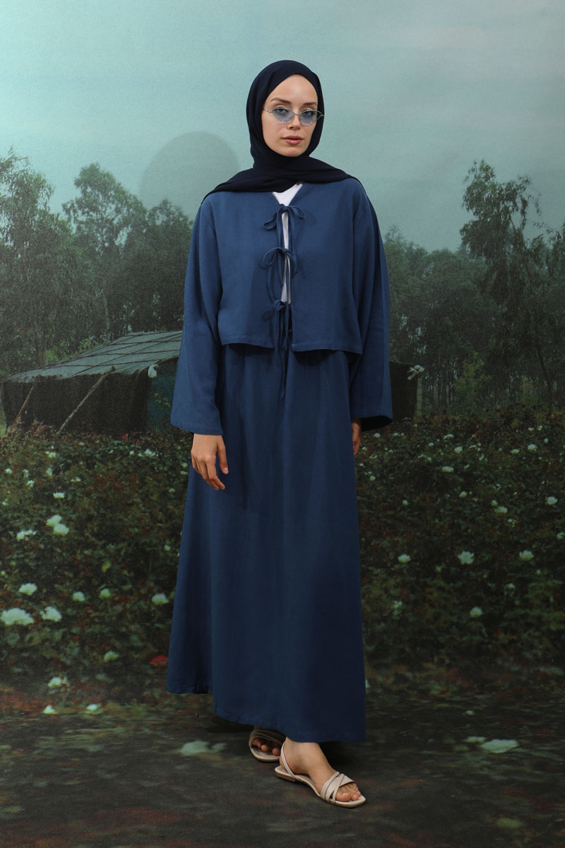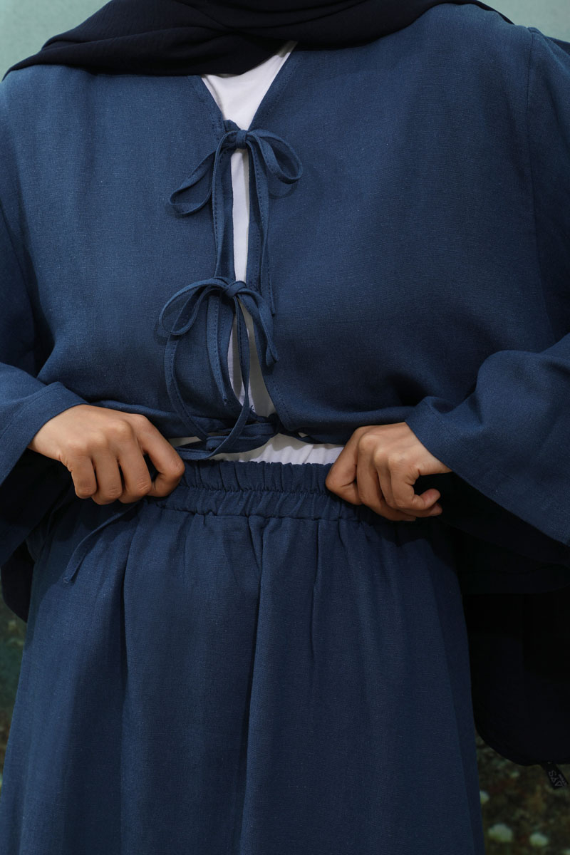 Önden Bağcıklı Etek Takım Lacivert, Kimono Bağcık detaylıdır, düşük omuzludur, geniş kolludur, etek belden lastiklidir, cepsizdir, Astarsızdır. ince keten Kumaş olup yaz mevsimine uygundur.
