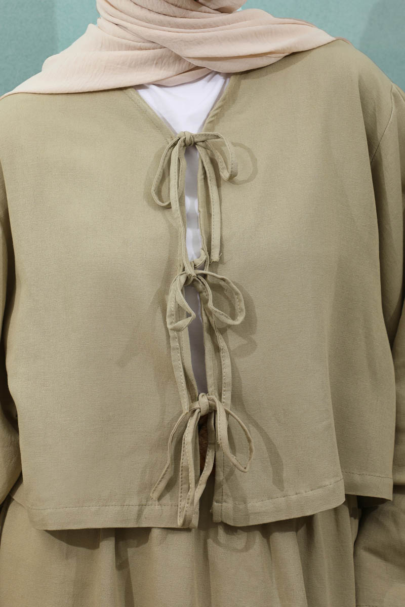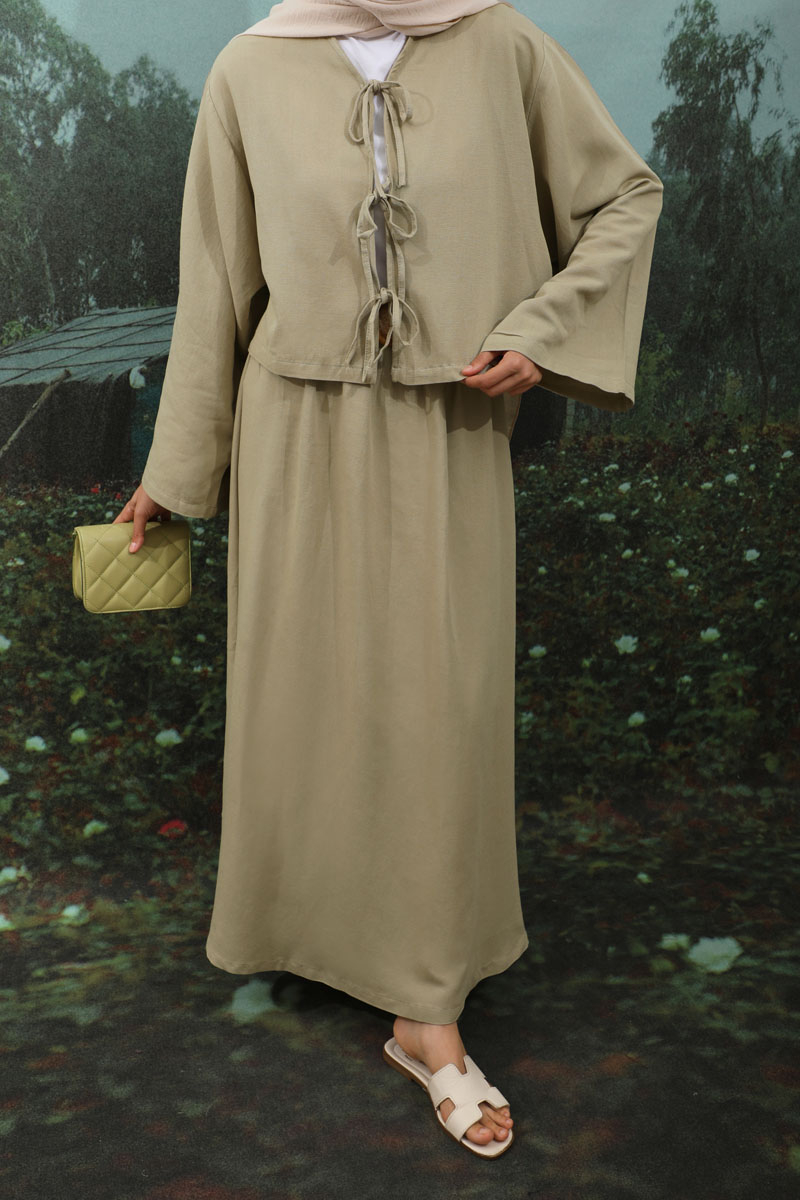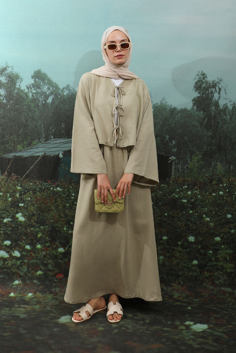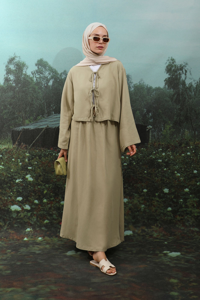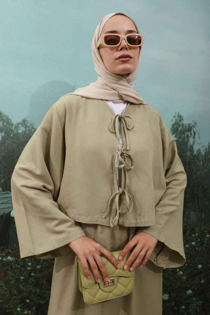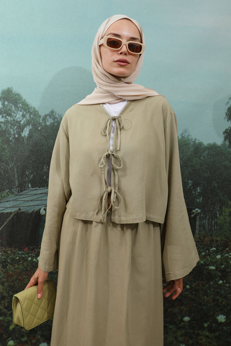 Önden Bağcıklı Etek Takım Mint, Kimono Bağcık detaylıdır, düşük omuzludur, geniş kolludur, etek belden lastiklidir, cepsizdir, Astarsızdır. ince keten Kumaş olup yaz mevsimine uygundur.