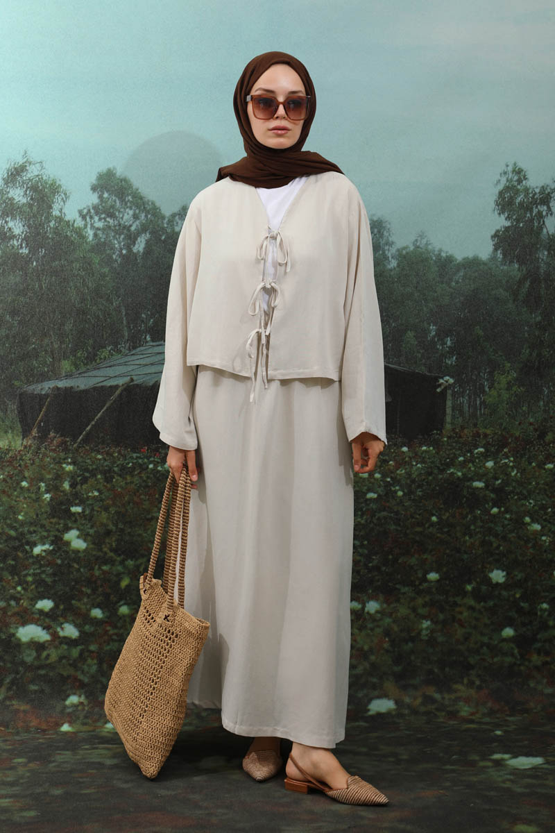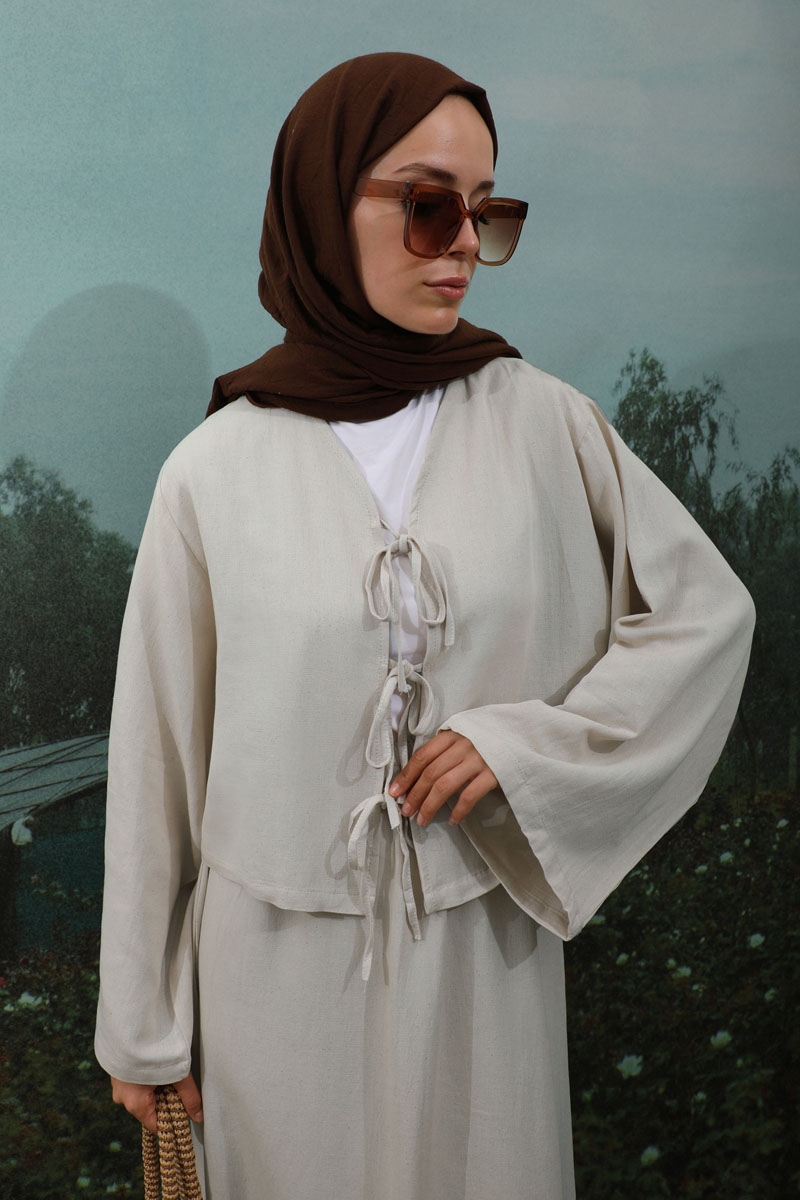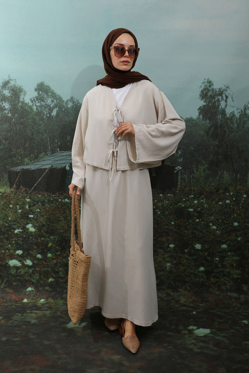 Önden Bağcıklı Etek Takım Taş, Kimono Bağcık detaylıdır, düşük omuzludur, geniş kolludur, etek belden lastiklidir, cepsizdir, Astarsızdır. ince keten Kumaş olup yaz mevsimine uygundur.