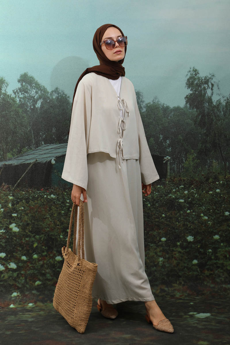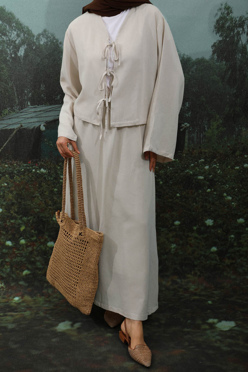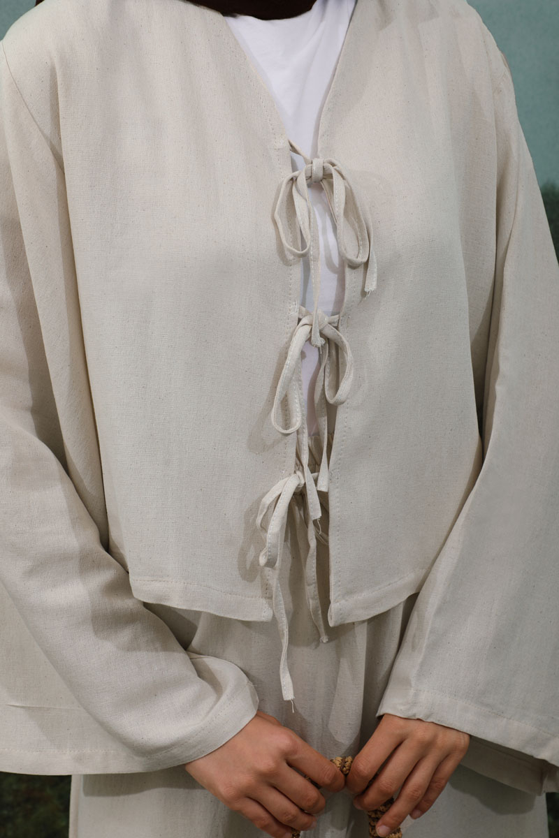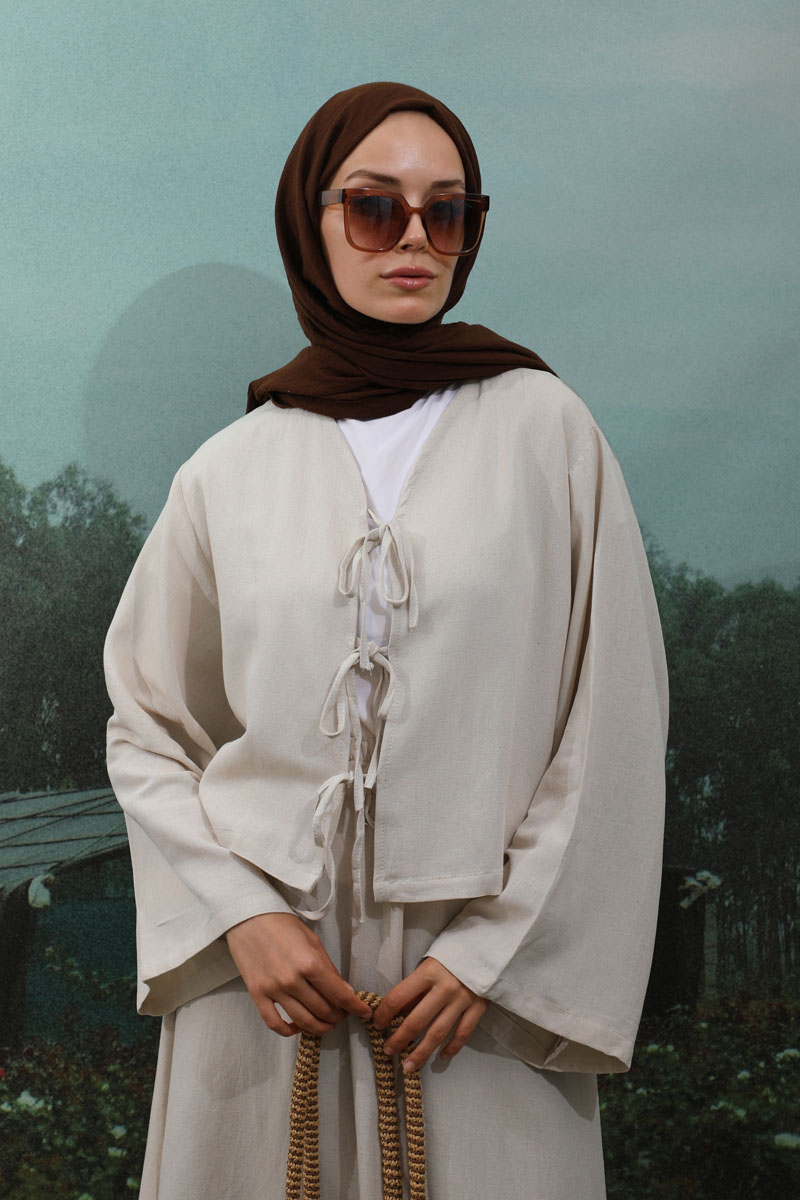 Önden Bağcıklı Etek Takım Taş, Kimono Bağcık detaylıdır, düşük omuzludur, geniş kolludur, etek belden lastiklidir, cepsizdir, Astarsızdır. ince keten Kumaş olup yaz mevsimine uygundur.