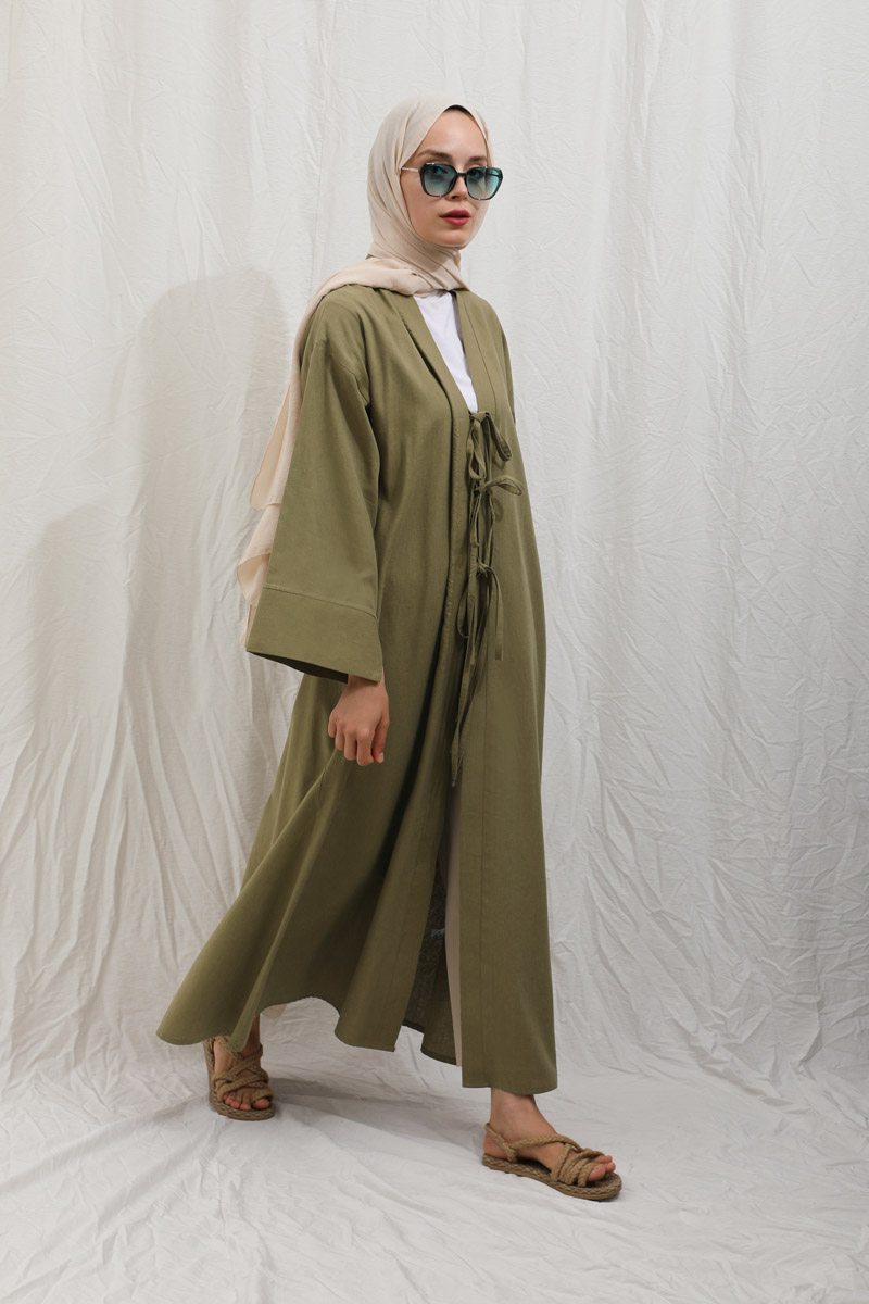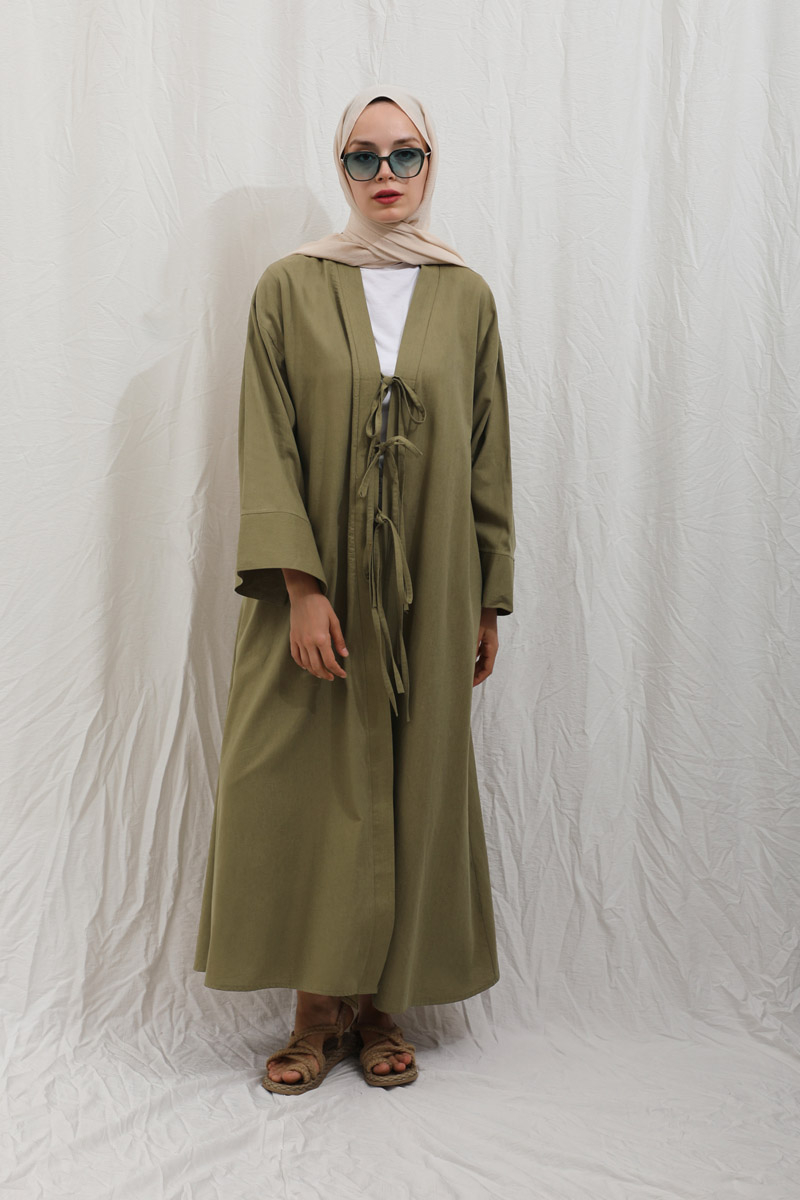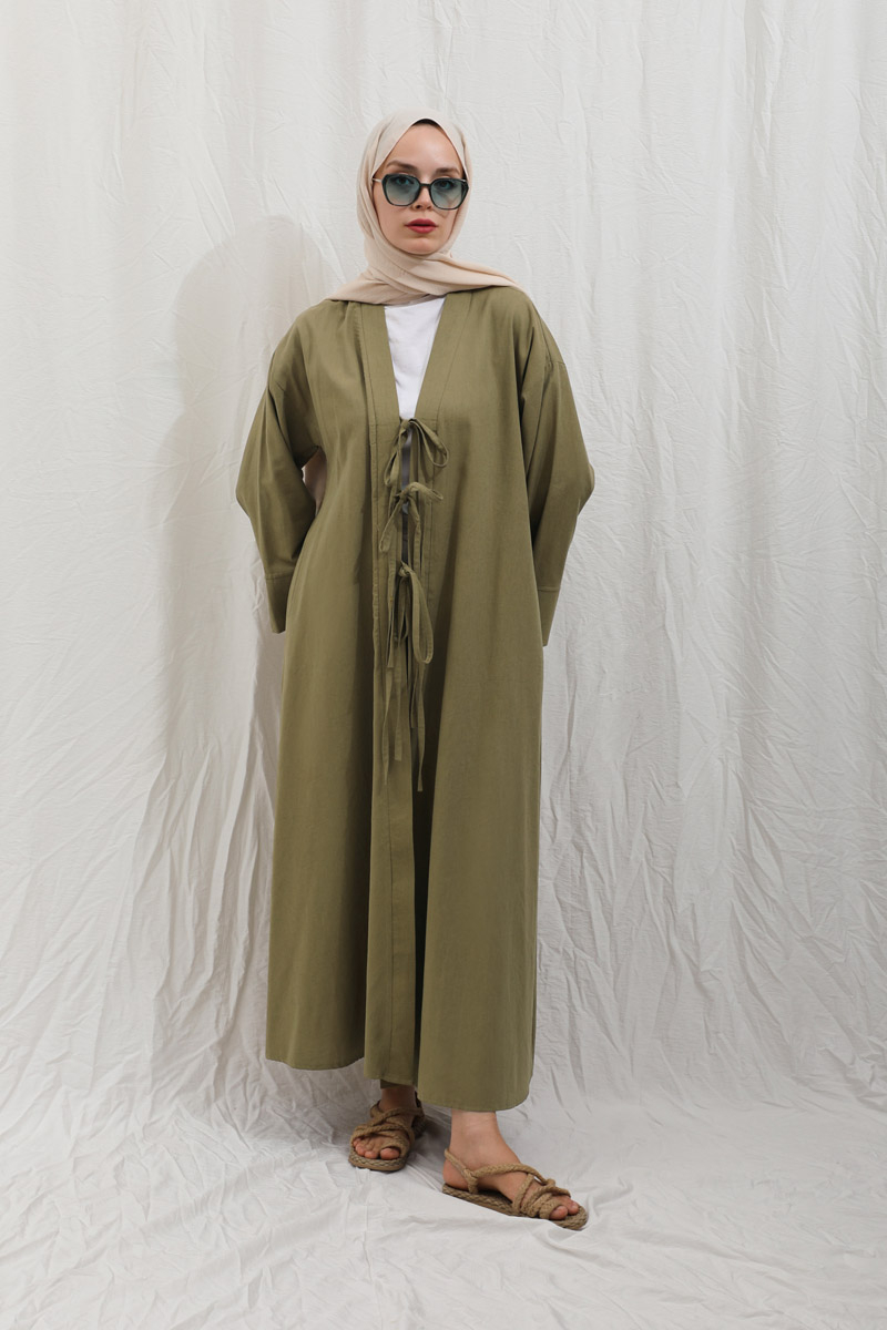 Önden Bağlamalı Abaya Haki. Kaln manşetli, önden üç adet bağcıklı, şal yaka, düşük omuz, yandan gizli cepli, astarsız. Ürün salaştır yaz aylarında giyçık kombinleriniz için konforlu bir parçadır. İçine dilerseniz sıfır kol keten elbiseleeimizden tercih edebilirsiniz.