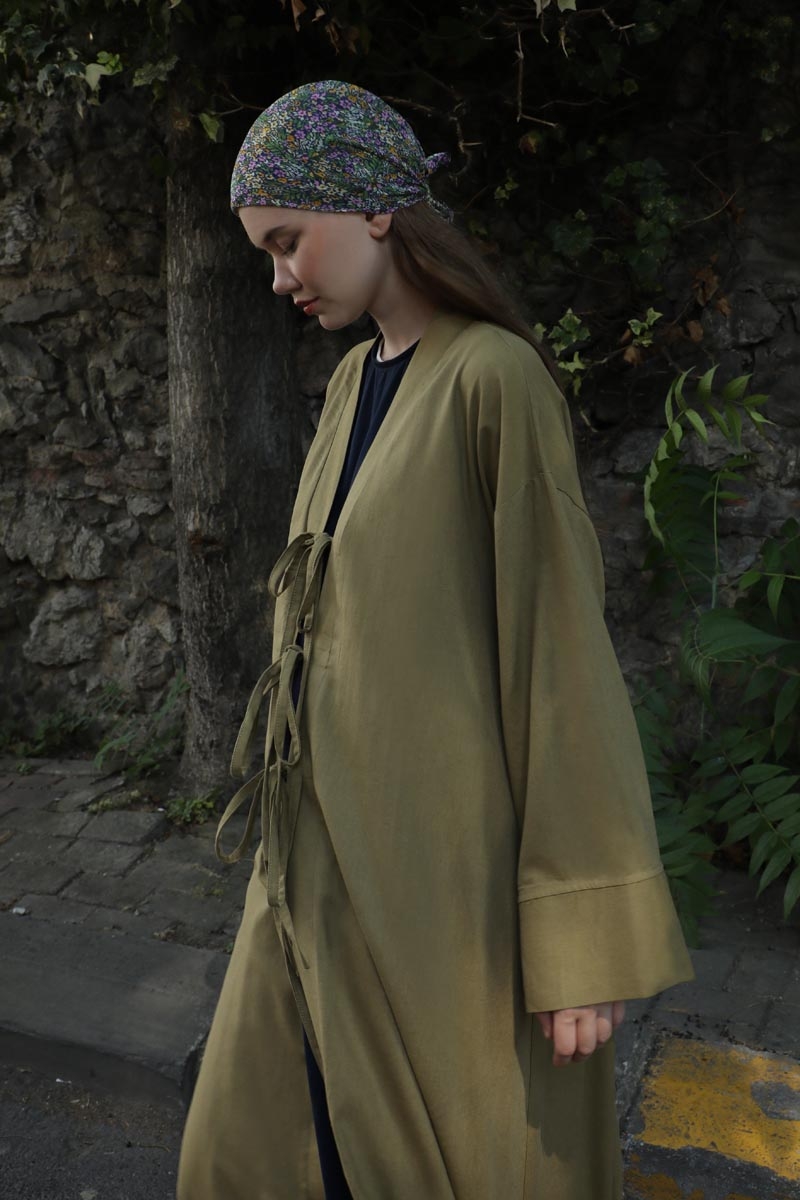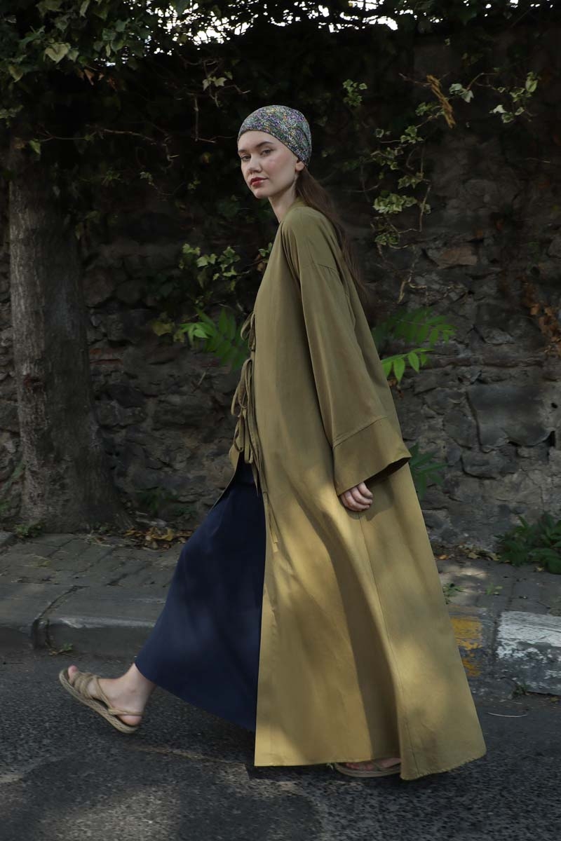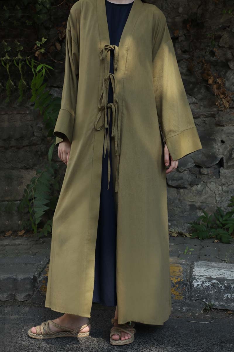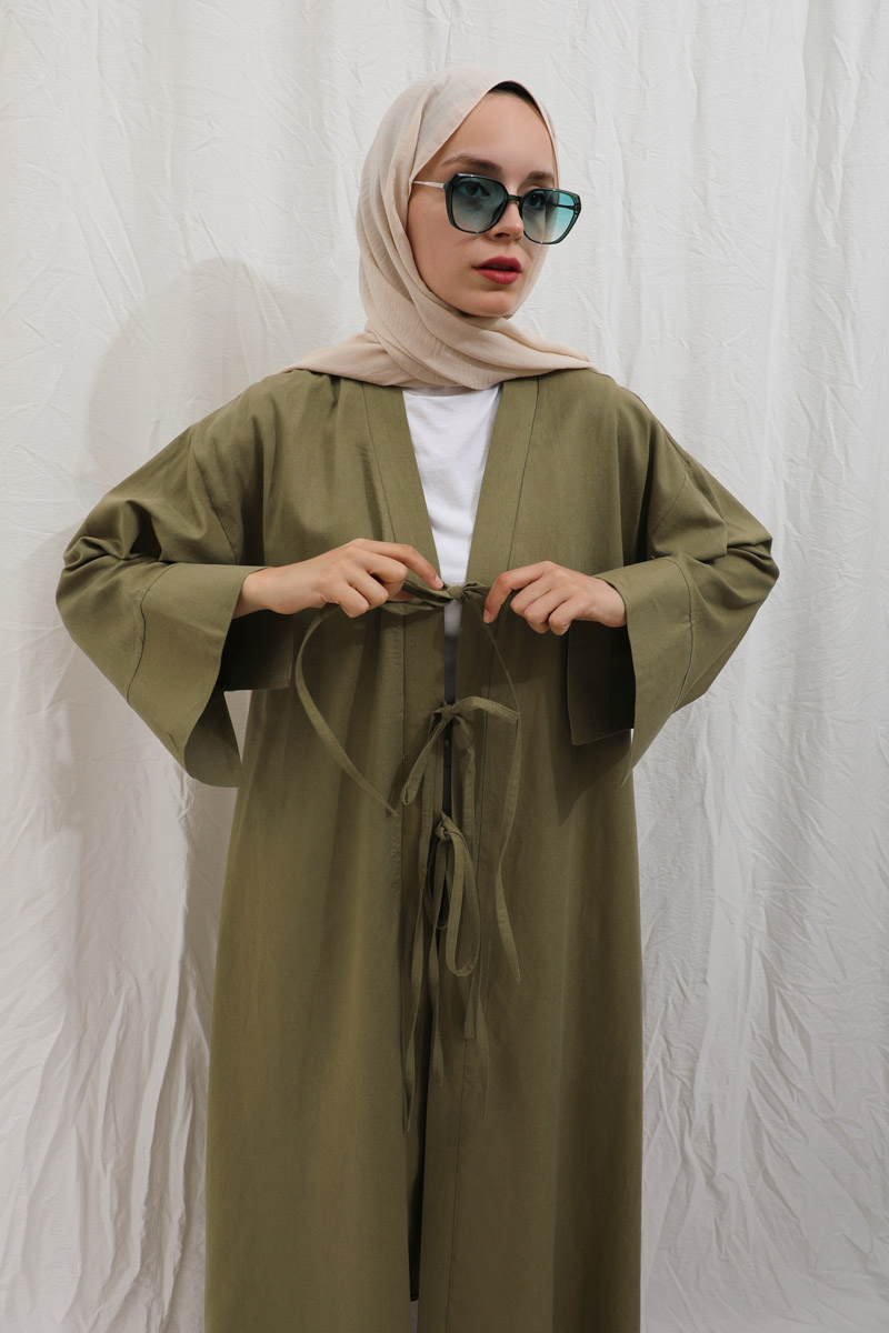 Önden Bağlamalı Abaya Haki. Kaln manşetli, önden üç adet bağcıklı, şal yaka, düşük omuz, yandan gizli cepli, astarsız. Ürün salaştır yaz aylarında giyçık kombinleriniz için konforlu bir parçadır. İçine dilerseniz sıfır kol keten elbiseleeimizden tercih edebilirsiniz.