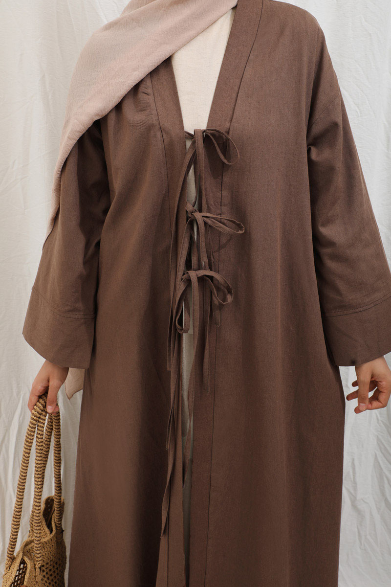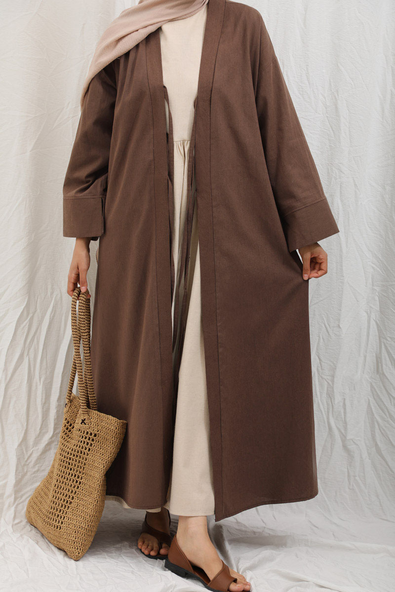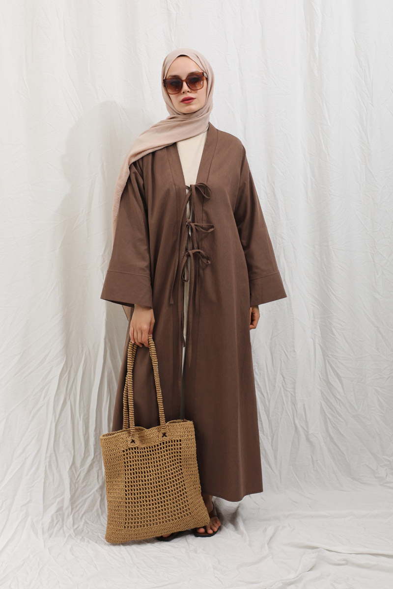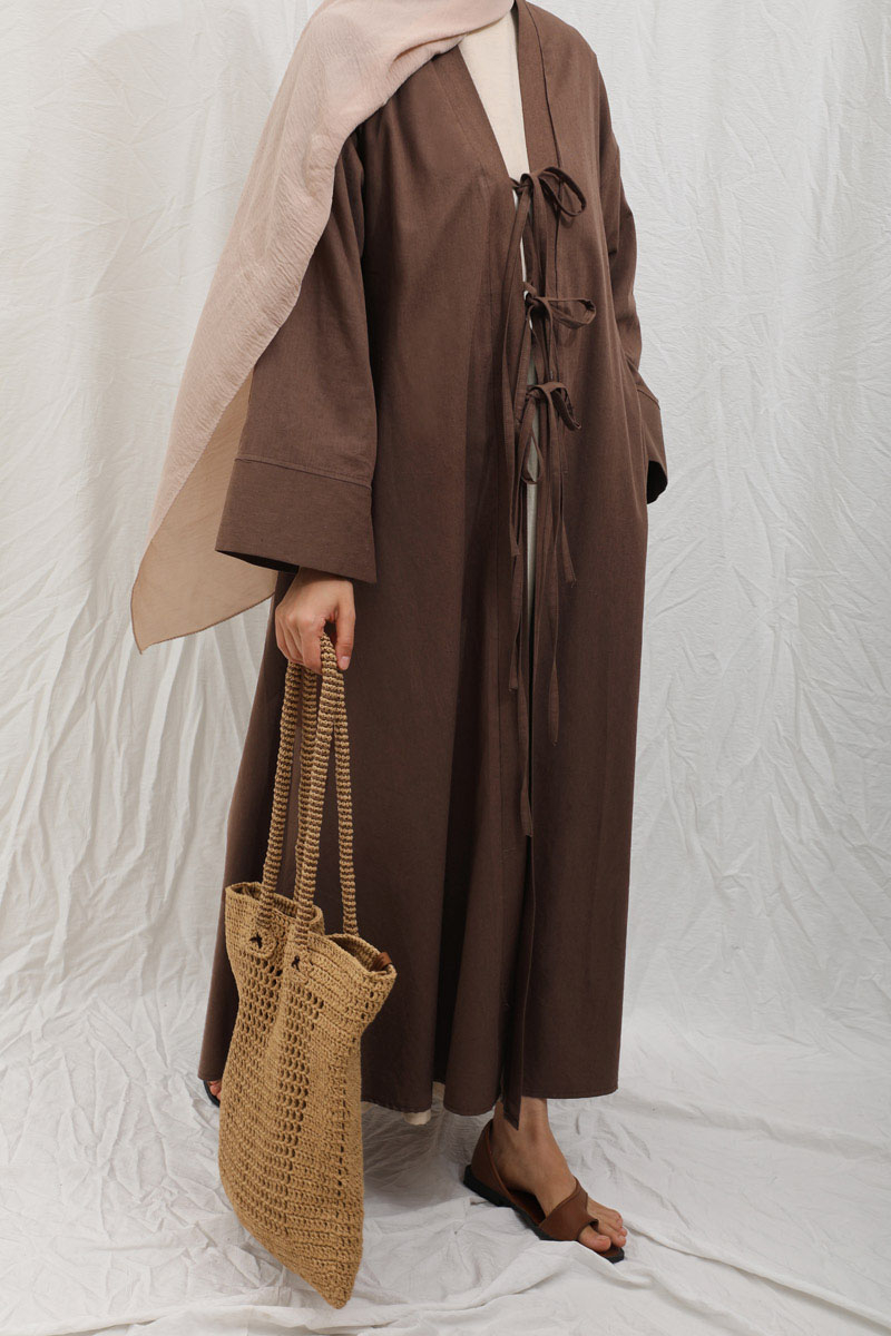 Önden Bağlamalı Abaya Kahverengi. Kaln manşetli, önden üç adet bağcıklı, şal yaka, düşük omuz, yandan gizli cepli, astarsız. Ürün salaştır yaz aylarında giyçık kombinleriniz için konforlu bir parçadır. İçine dilerseniz sıfır kol keten elbiseleeimizden tercih edebilirsiniz.
