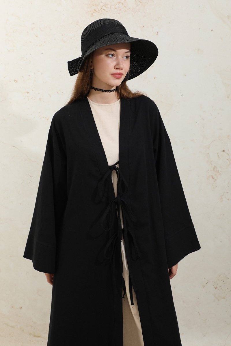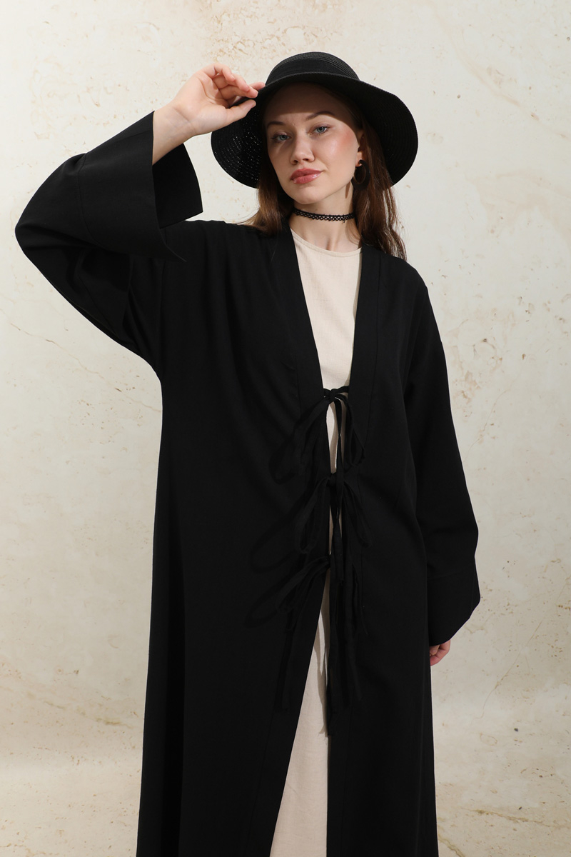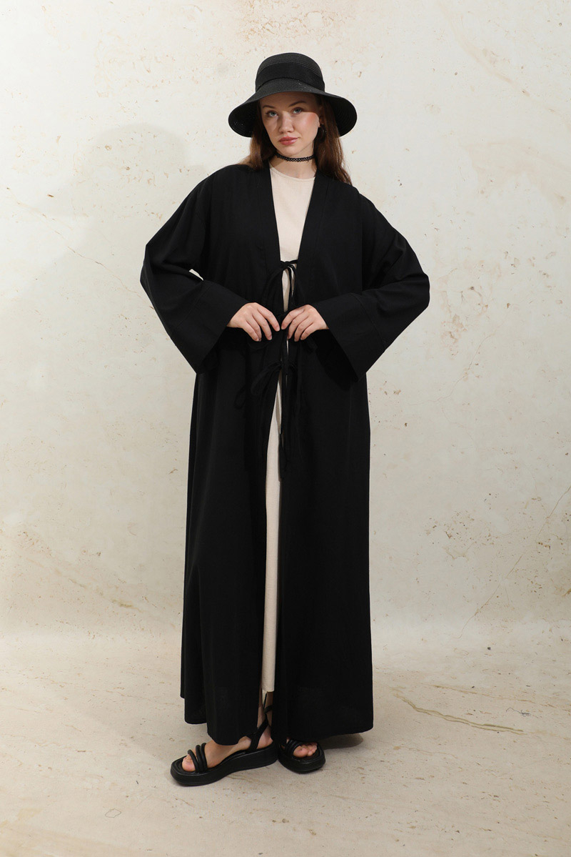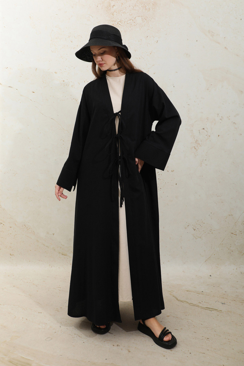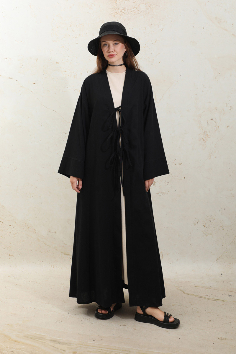 Önden Bağlamalı Abaya Siyah. Kaln manşetli, önden üç adet bağcıklı, şal yaka, düşük omuz, yandan gizli cepli, astarsız. Ürün salaştır yaz aylarında giyçık kombinleriniz için konforlu bir parçadır. İçine dilerseniz sıfır kol keten elbiseleeimizden tercih edebilirsiniz.
