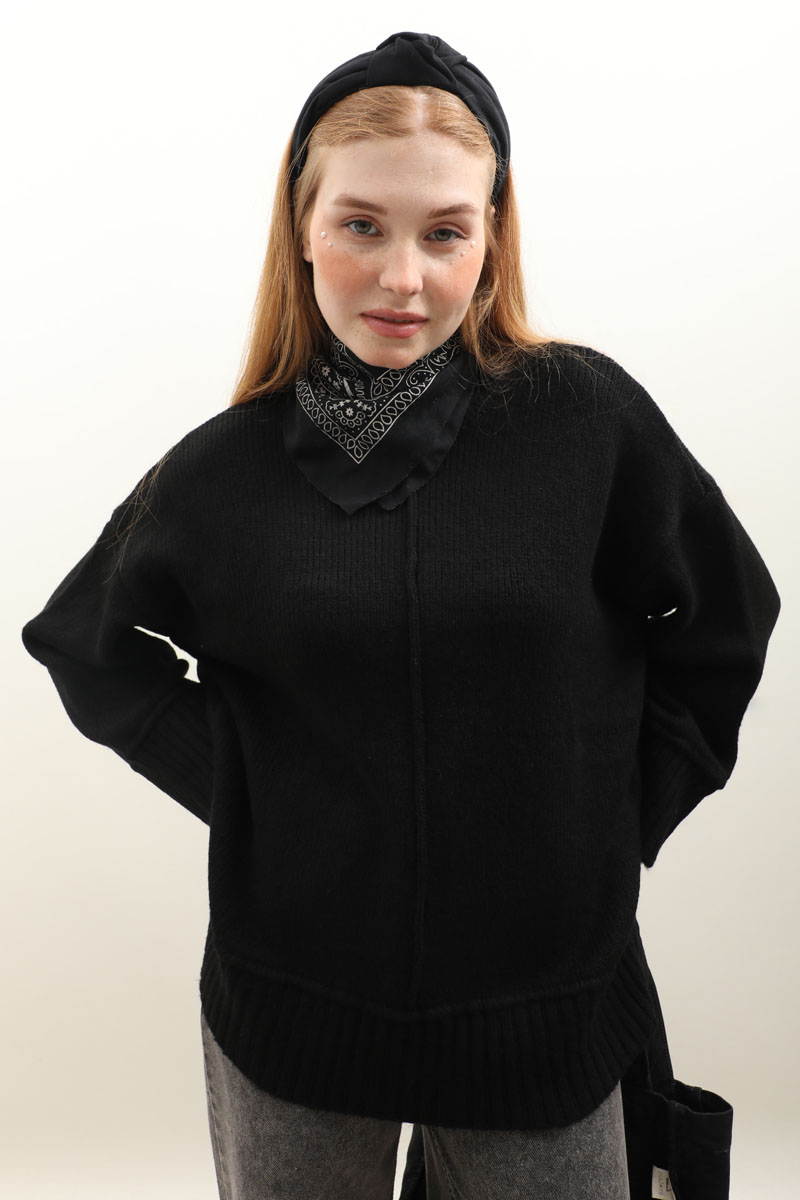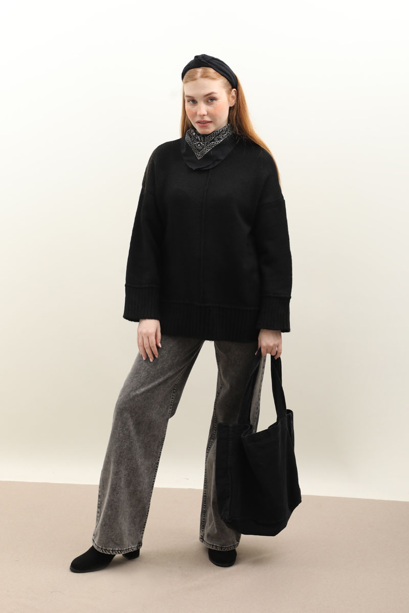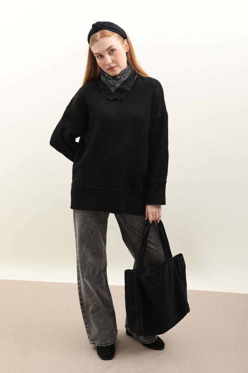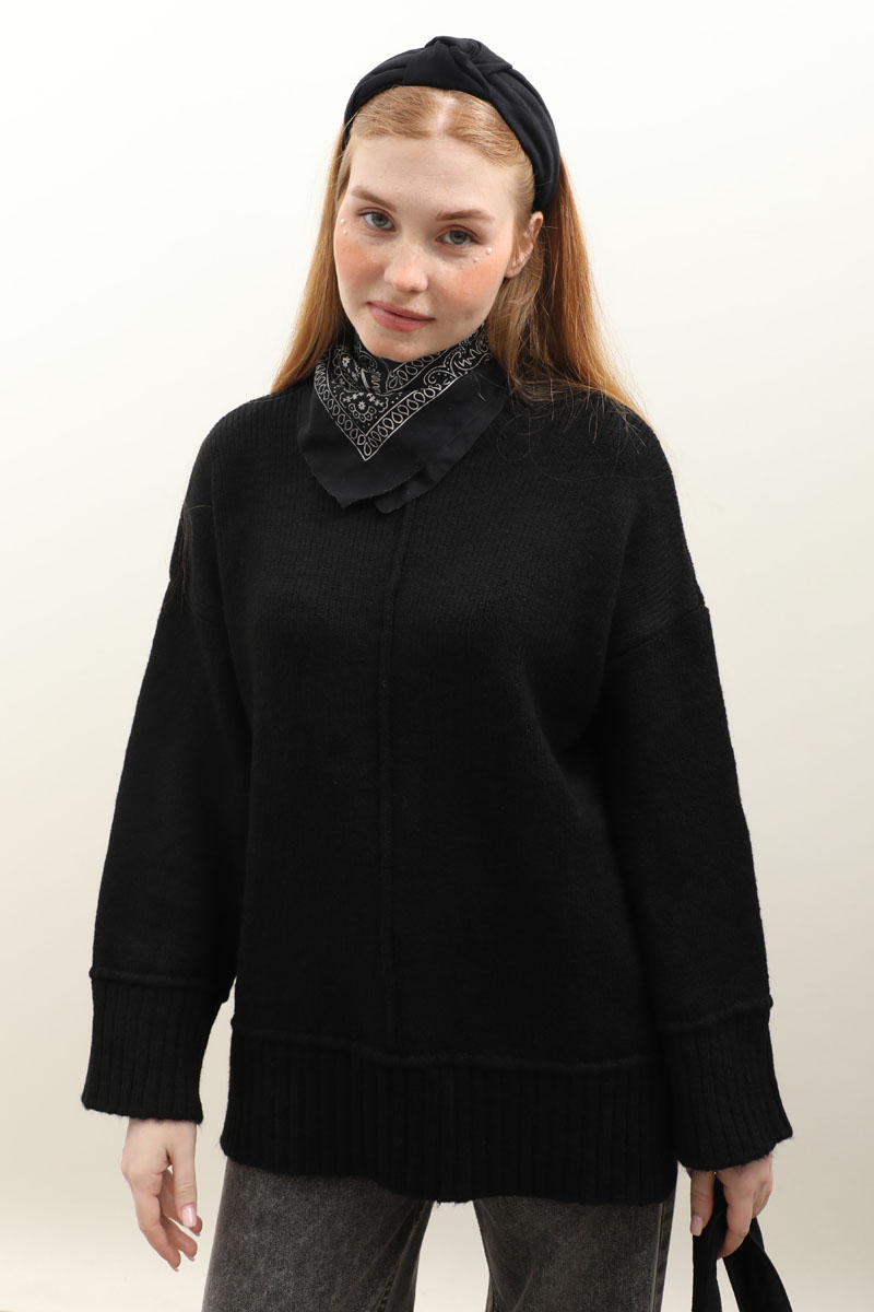 Önden Dikişli Oversize Kazak Siyah