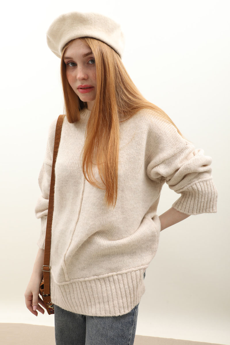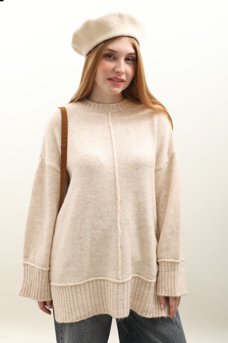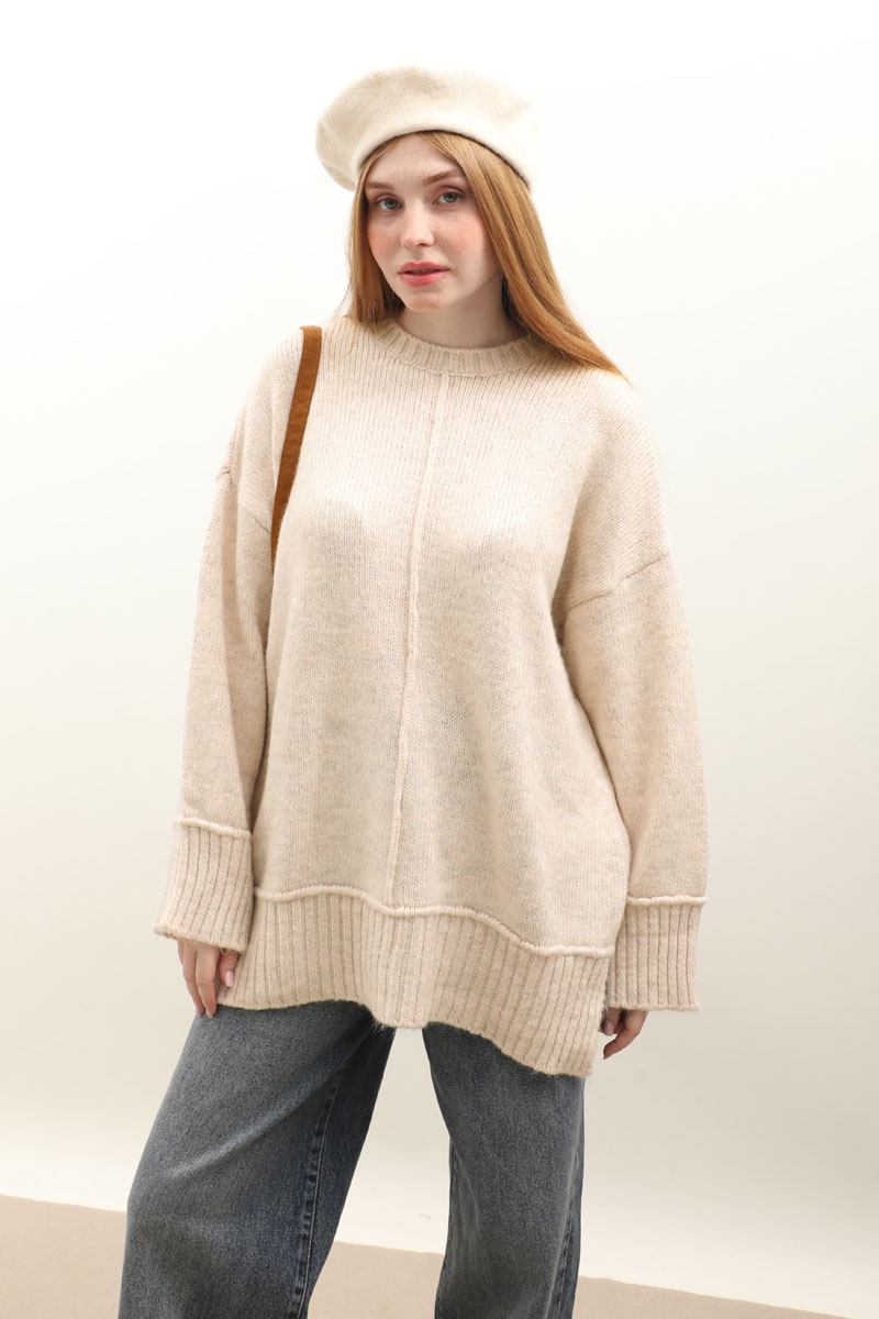 Önden Dikişli Oversize Kazak Taş. Bisiklet yaka, düşük omuzlu, manşeti ve etek ucu fitilli örme ribanadır, ön orta dikiş detaylıdır. Etek, elbise ve pantolon üzerine tercih edilebilir. Kış aylarında tercih edebilirsiniz.
