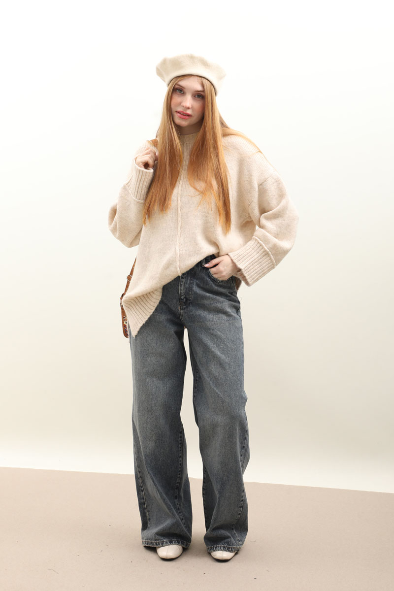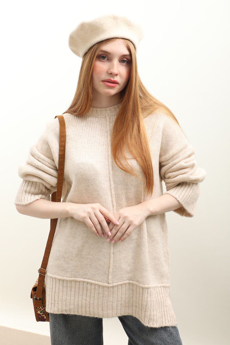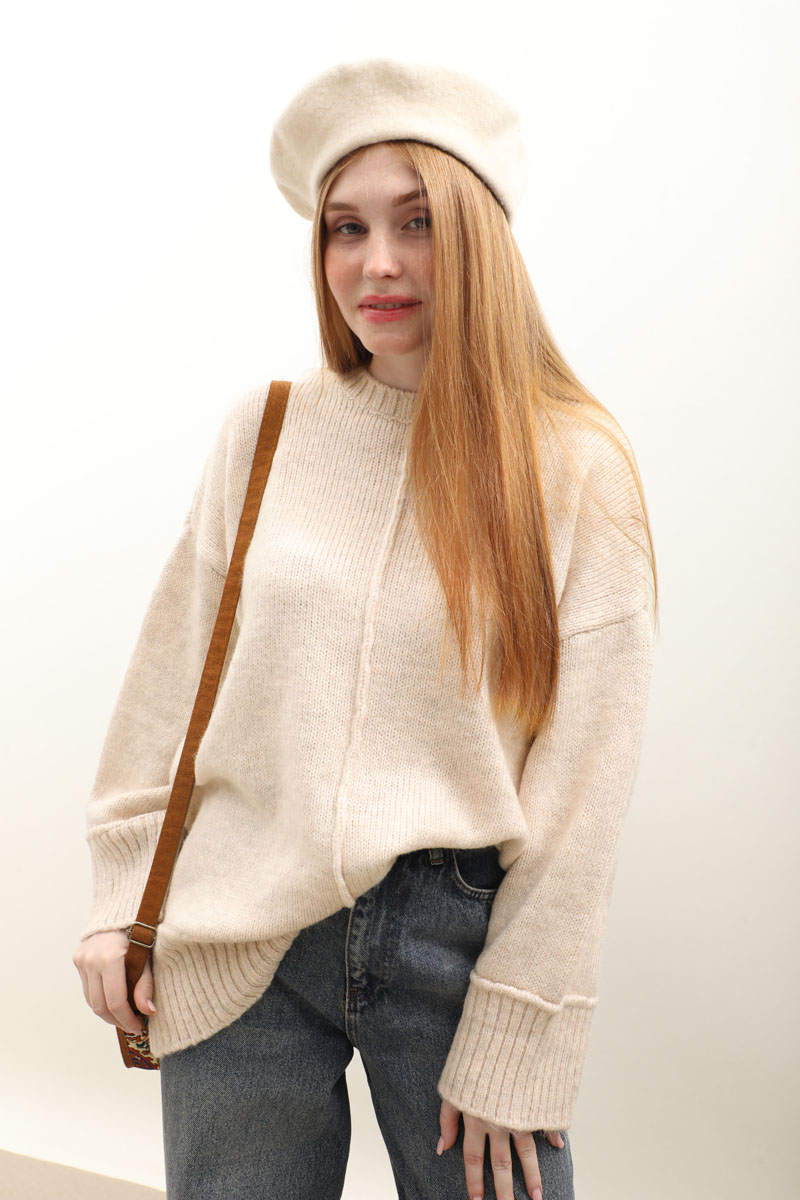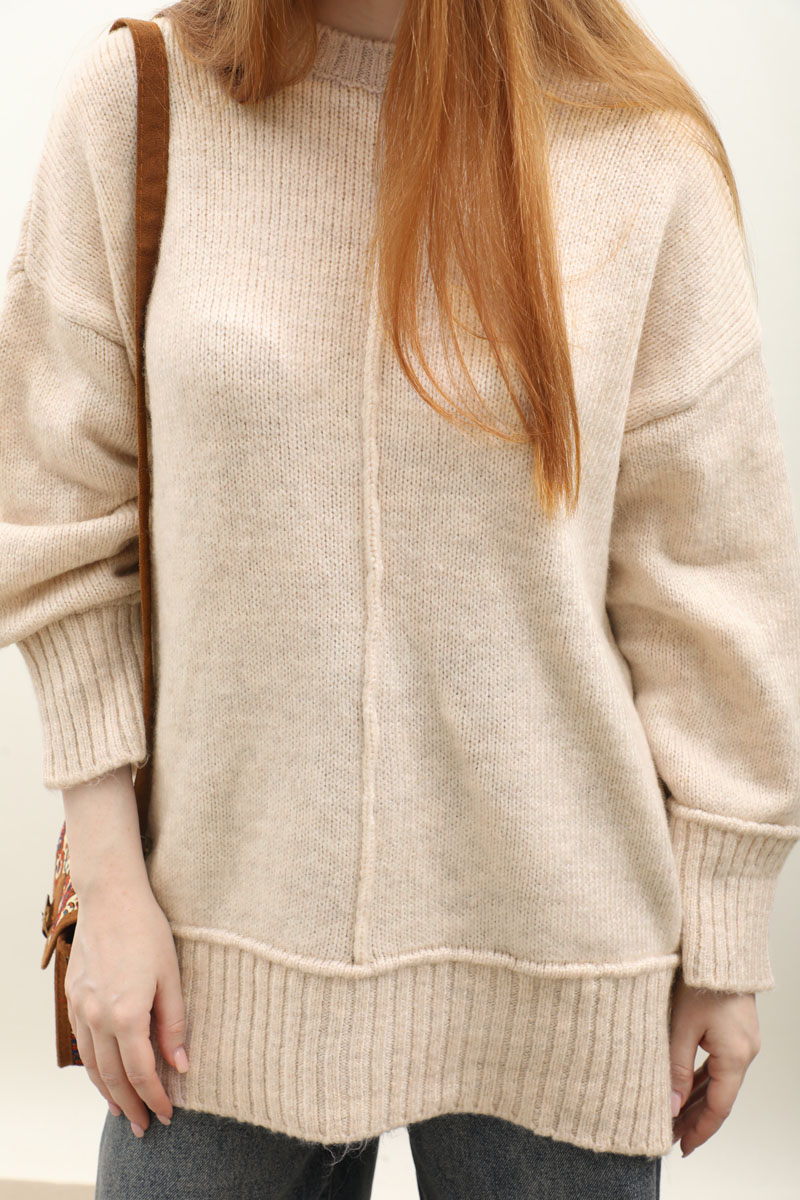 Önden Dikişli Oversize Kazak Taş. Bisiklet yaka, düşük omuzlu, manşeti ve etek ucu fitilli örme ribanadır, ön orta dikiş detaylıdır. Etek, elbise ve pantolon üzerine tercih edilebilir. Kış aylarında tercih edebilirsiniz.