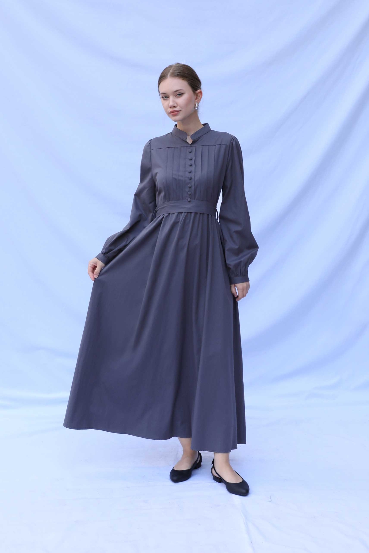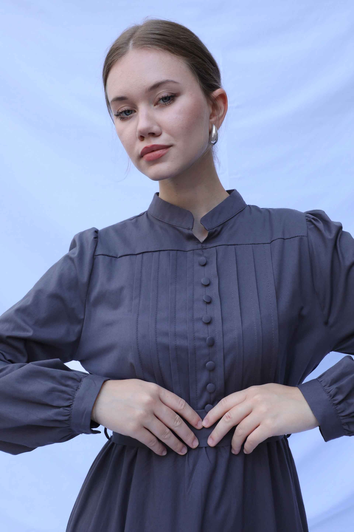 Önden Düğmeli Poplin Elbise Füme. Önden pileli ve düğme detaylıdır. Kuşaklıdır, hakim yaka olup arkadan fermuarlıdır. Kolları pile detayı olup bilekten düğmelidir. Astarsızdır. Gizli ceplidir. Günlük kullanım ve özel günlerinizde tercih edebilirsiniz.