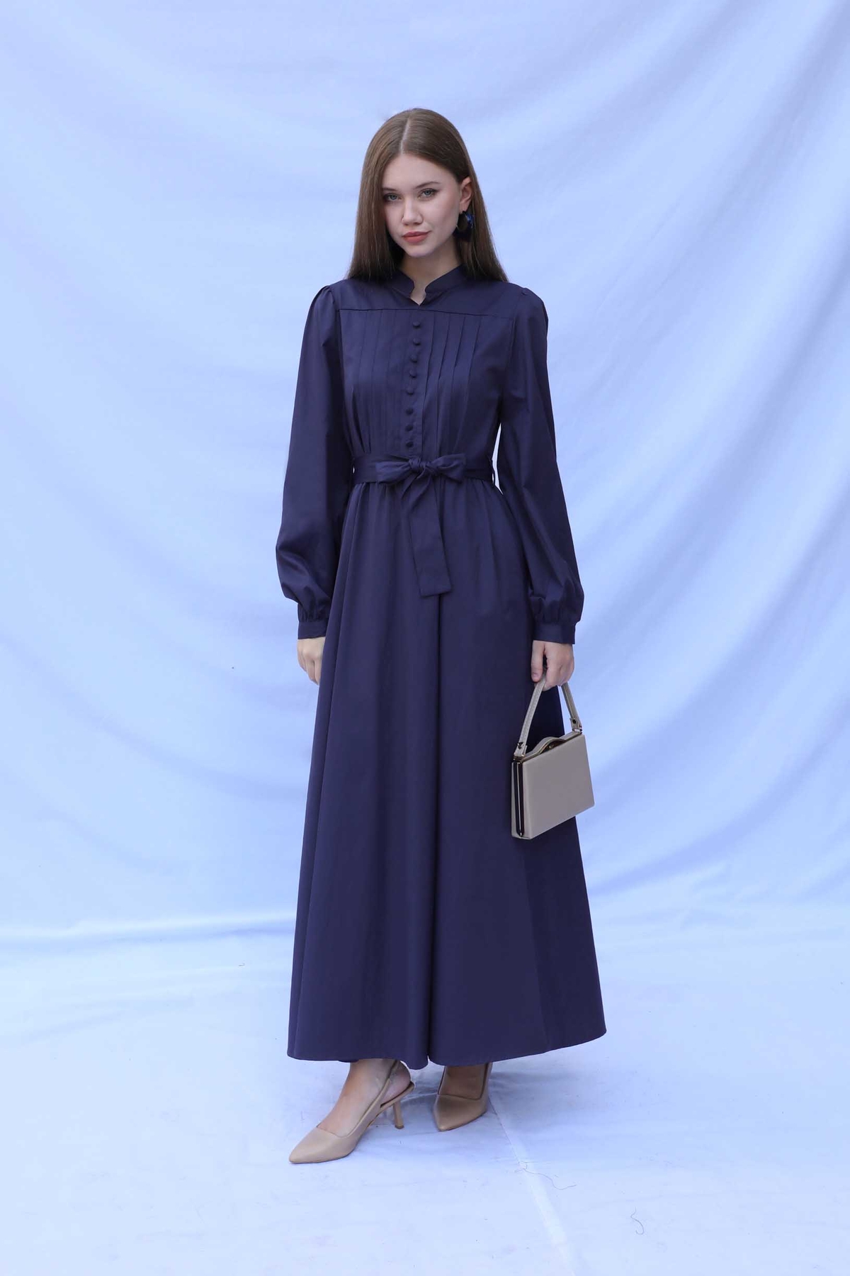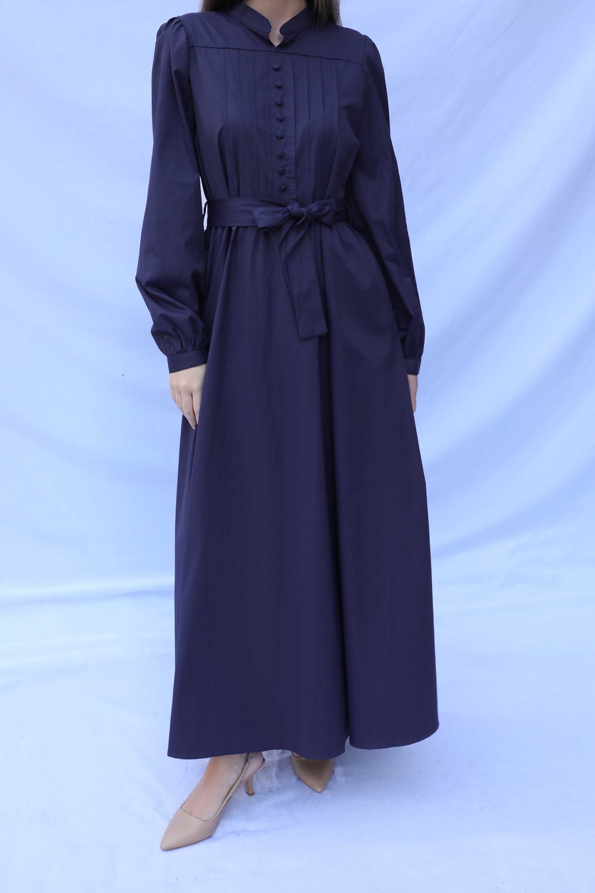 Önden Düğmeli Poplin Elbise Lacivert. Önden pileli ve düğme detaylıdır. Kuşaklıdır, hakim yaka olup arkadan fermuarlıdır. Kolları pile detayı olup bilekten düğmelidir. Astarsızdır. Gizli ceplidir. Günlük kullanım ve özel günlerinizde tercih edebilirsiniz.