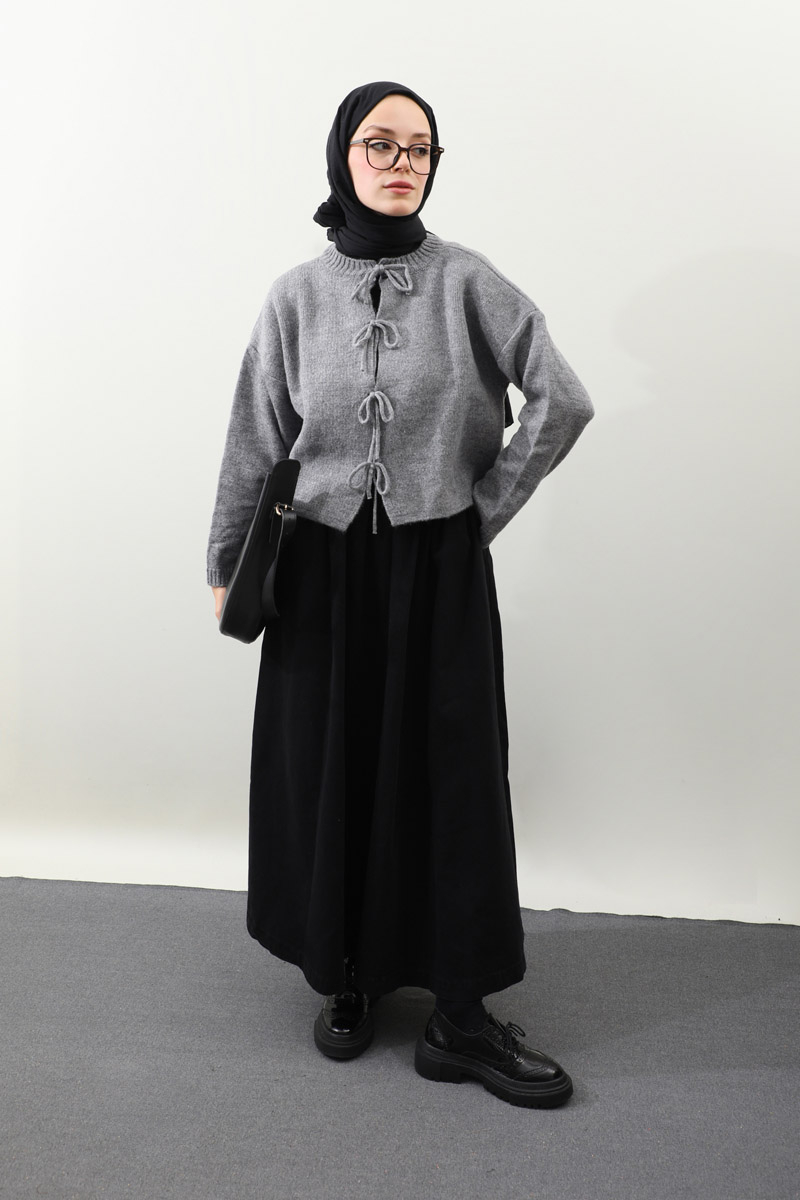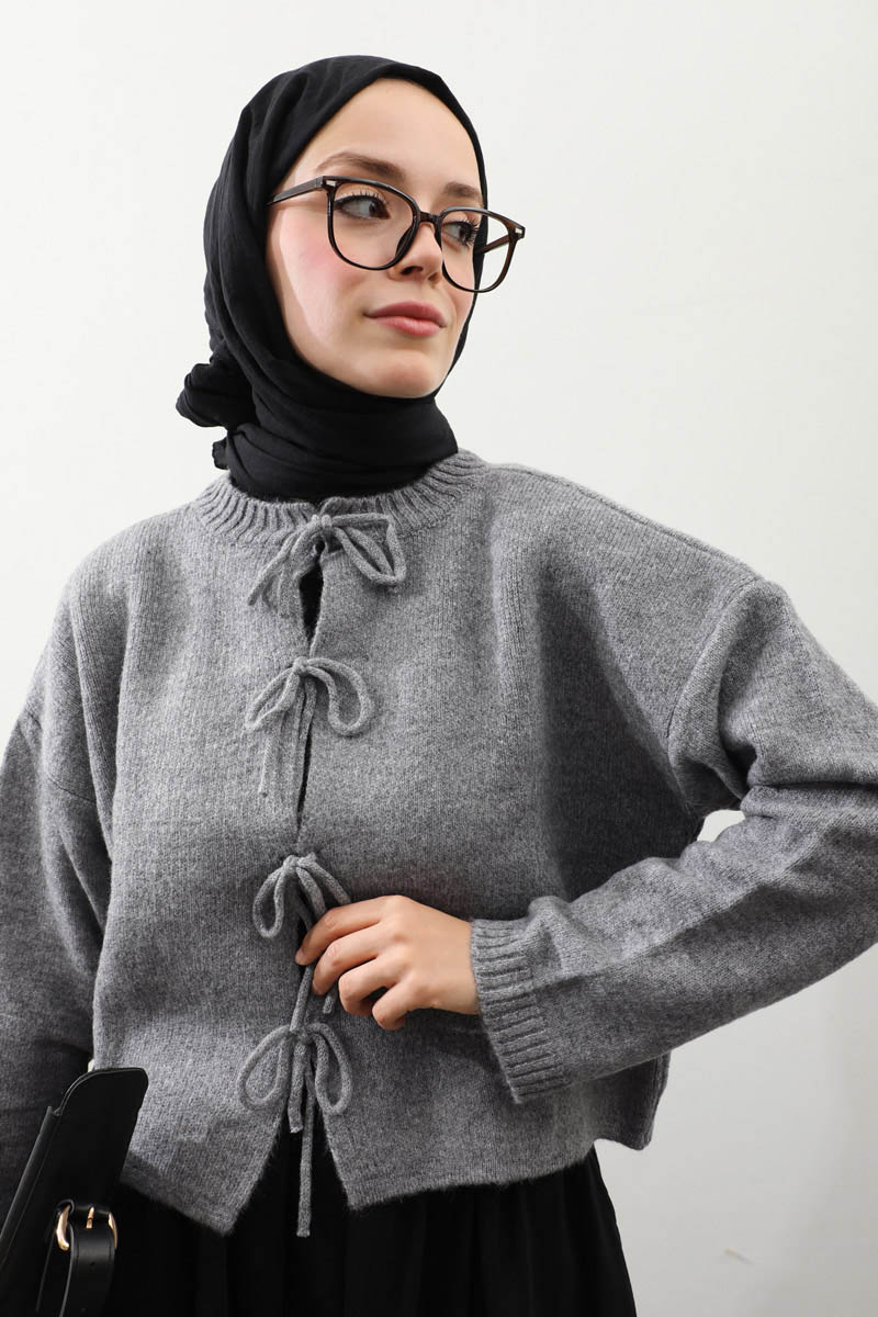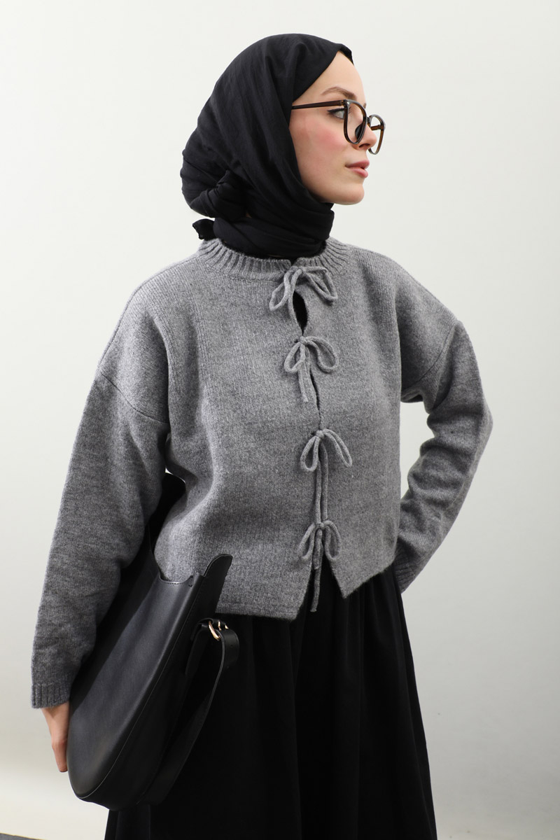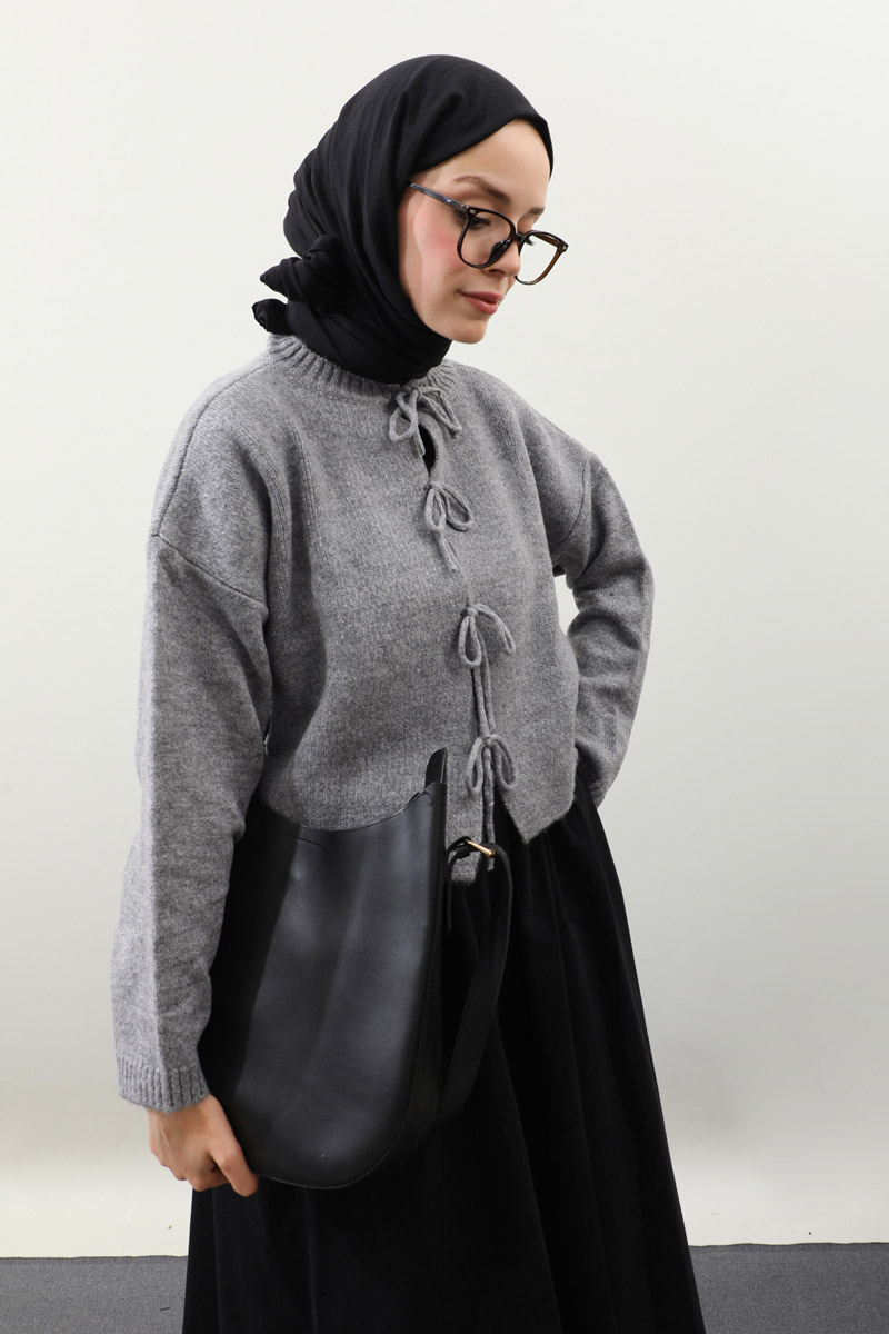 Önü Bağcıklı Hırka Gri. Hakim yakadır, düşük omuzludur, önden bağcıkldır, bol kesimdir. Günlük kullanım ve özel günlerinizde tercih edebilirsiniz.