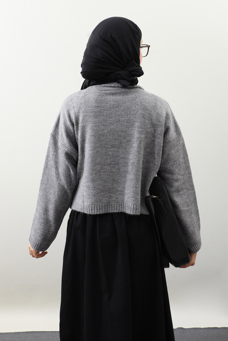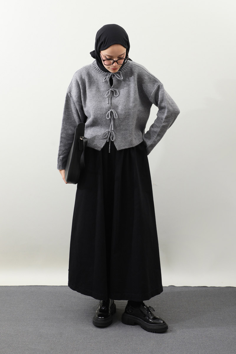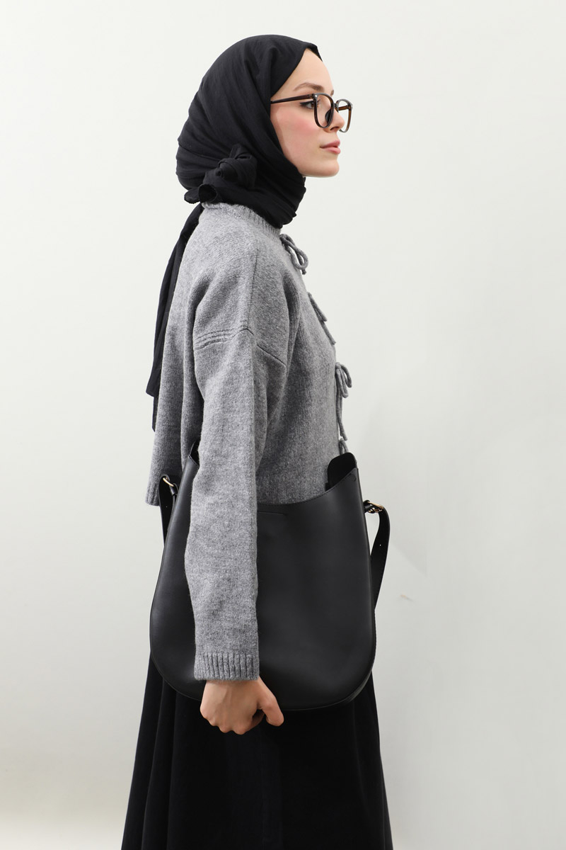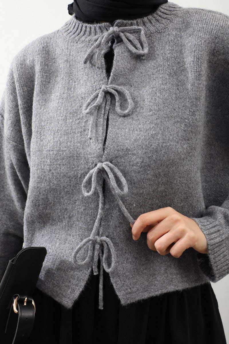 Önü Bağcıklı Hırka Gri. Hakim yakadır, düşük omuzludur, önden bağcıkldır, bol kesimdir. Günlük kullanım ve özel günlerinizde tercih edebilirsiniz.