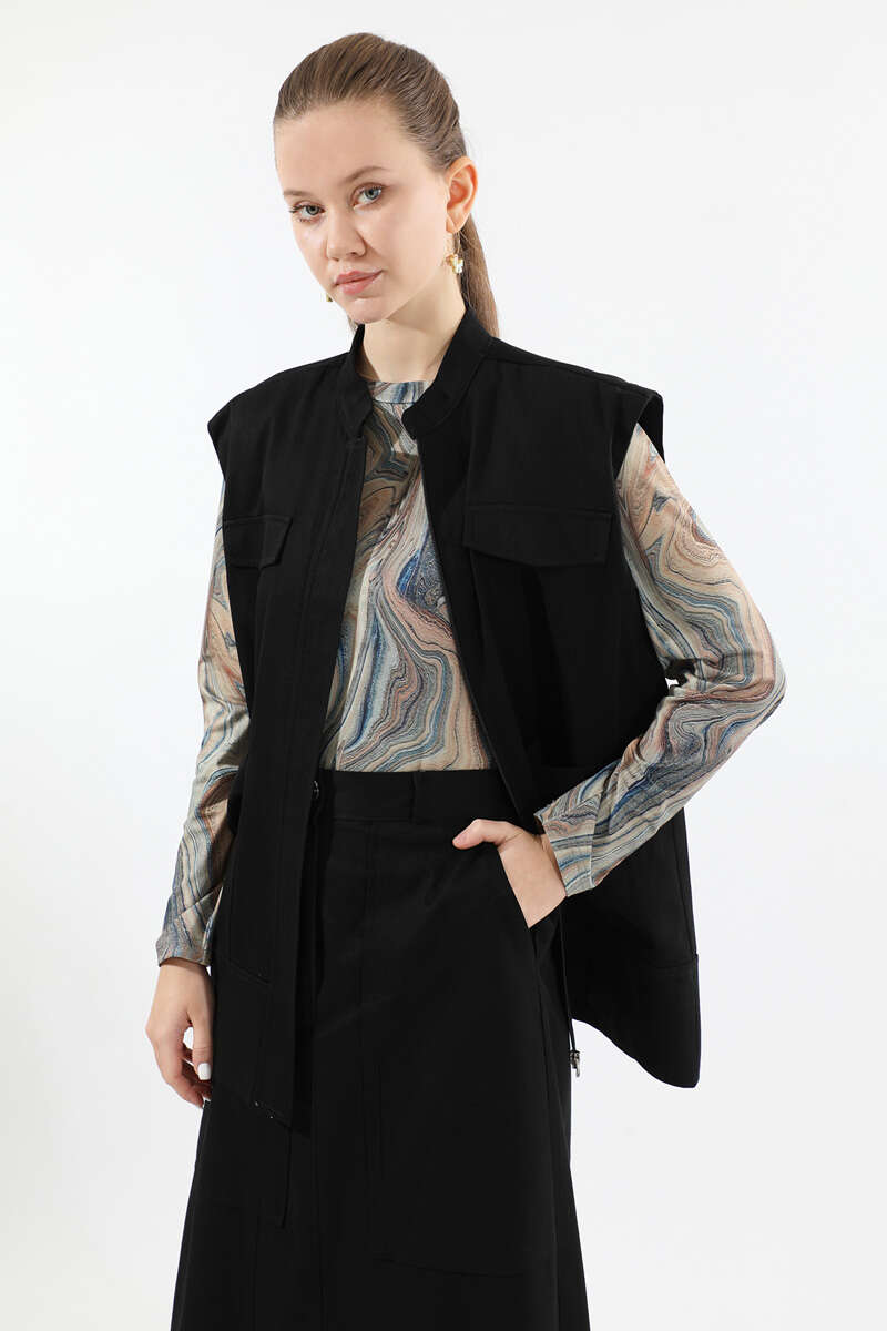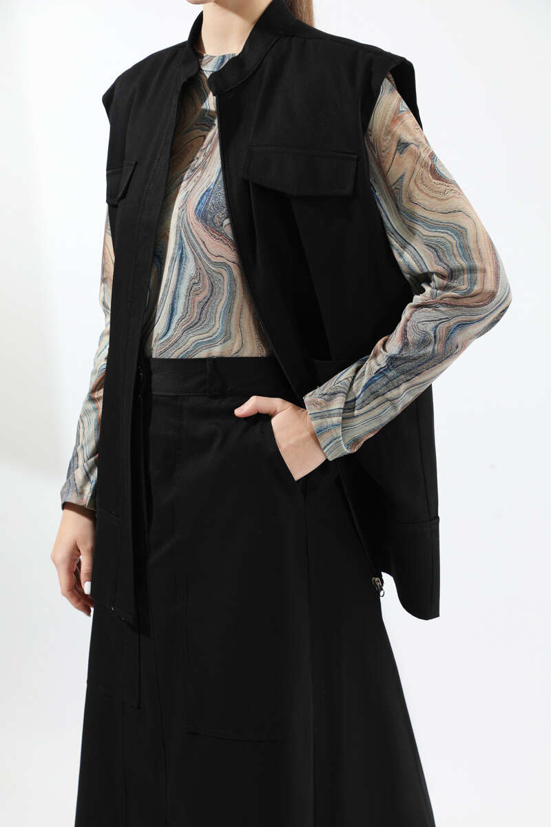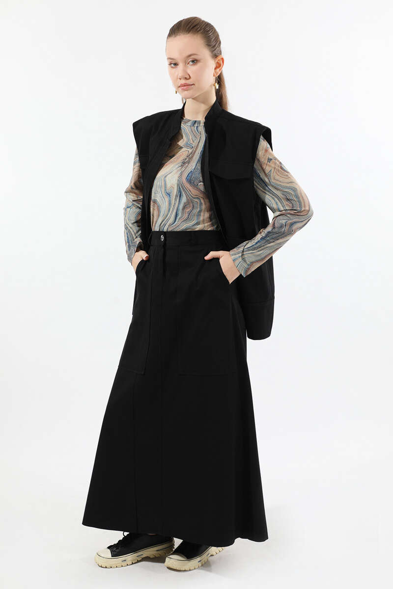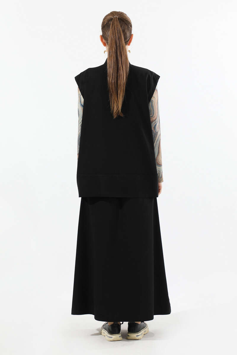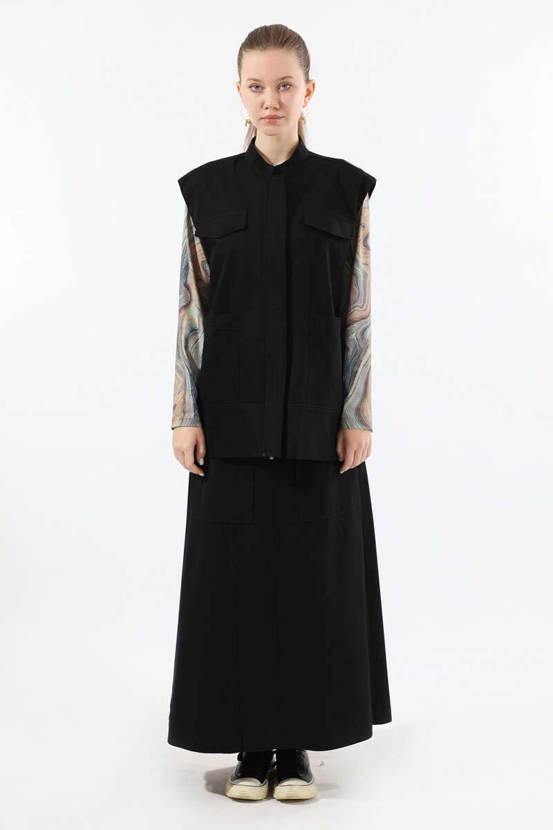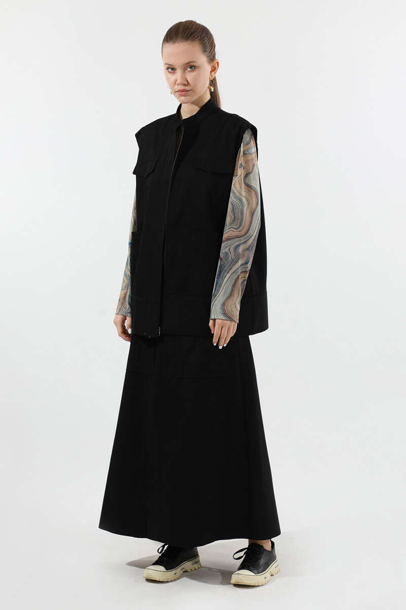 Önü Fermuarlı Yelek Etek Takım Siyah. Yelek önden ceplidir. Süs cep kapağı detaylıdır. Hakim Yakalıdır. Önden gizli fermuarlıdır. Etek beli lastiklidir. Etek Önden fermuarlıdır. Etek ön yandan yırtmaç detaylıdır. Günlük kullanım ve özel günlerinizde tercih edebilirsiniz.